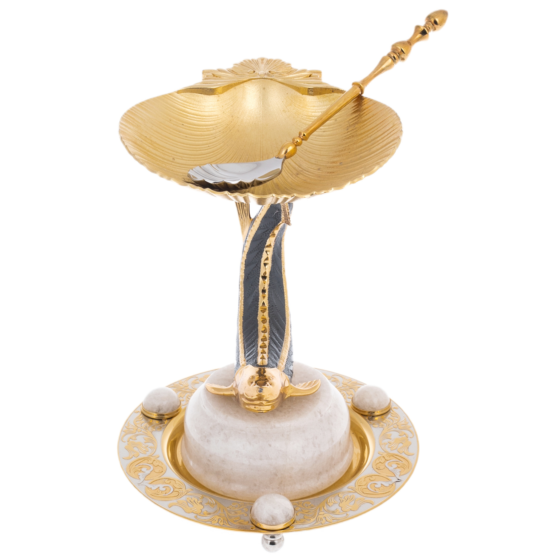 Чаша в виде раскрытой раковины — символ изысканного вкуса. Тонко проработанная текстура, повторяющая природные линии морских форм, подчеркивает совершенство замысла. В этой чаше — возможность не просто подать деликатес, а превратить это действо в ритуал наслаждения, доступный лишь избранным. Маленькая ложечка, изящно сочетающая золото и серебро, дополняет ансамбль, подчеркивая утонченность каждой детали.