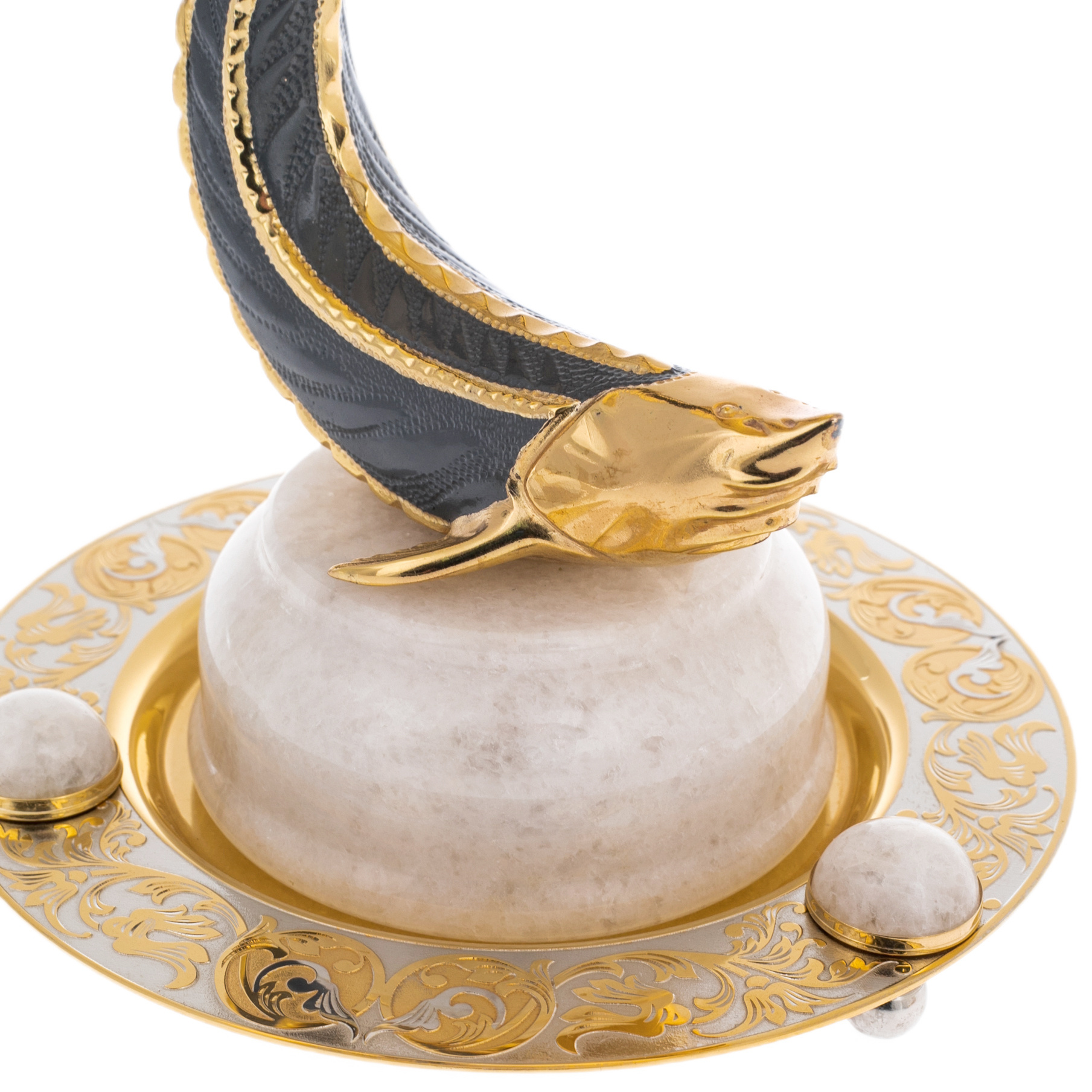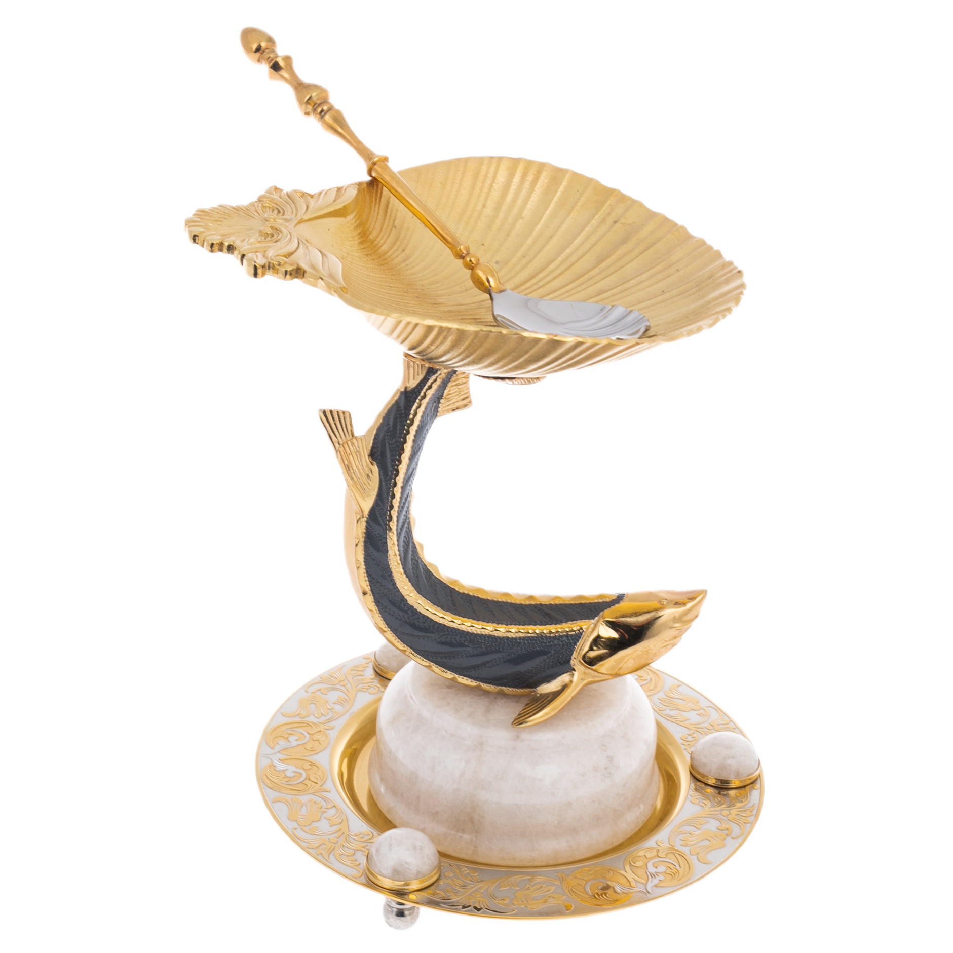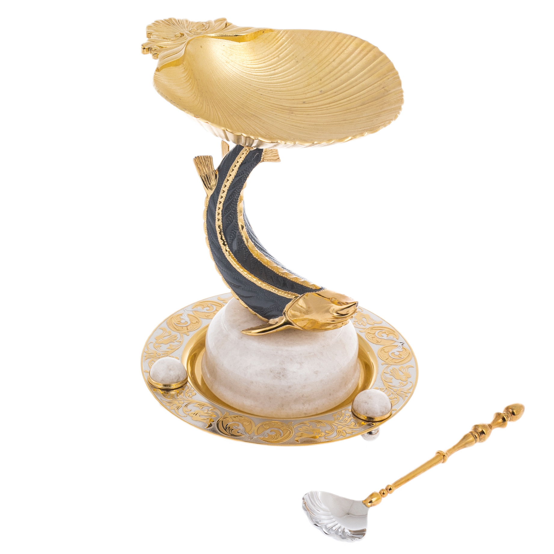 Элитная икорница из мрамора "Большой осетр" Златоуст, белаяЭлитная икорница из мрамора "Большой осетр" Златоуст, белаяИзделия изготовлены из природных материалов высокого качества. Филигранная проработка деталей характеризует безупречную работу мастера.