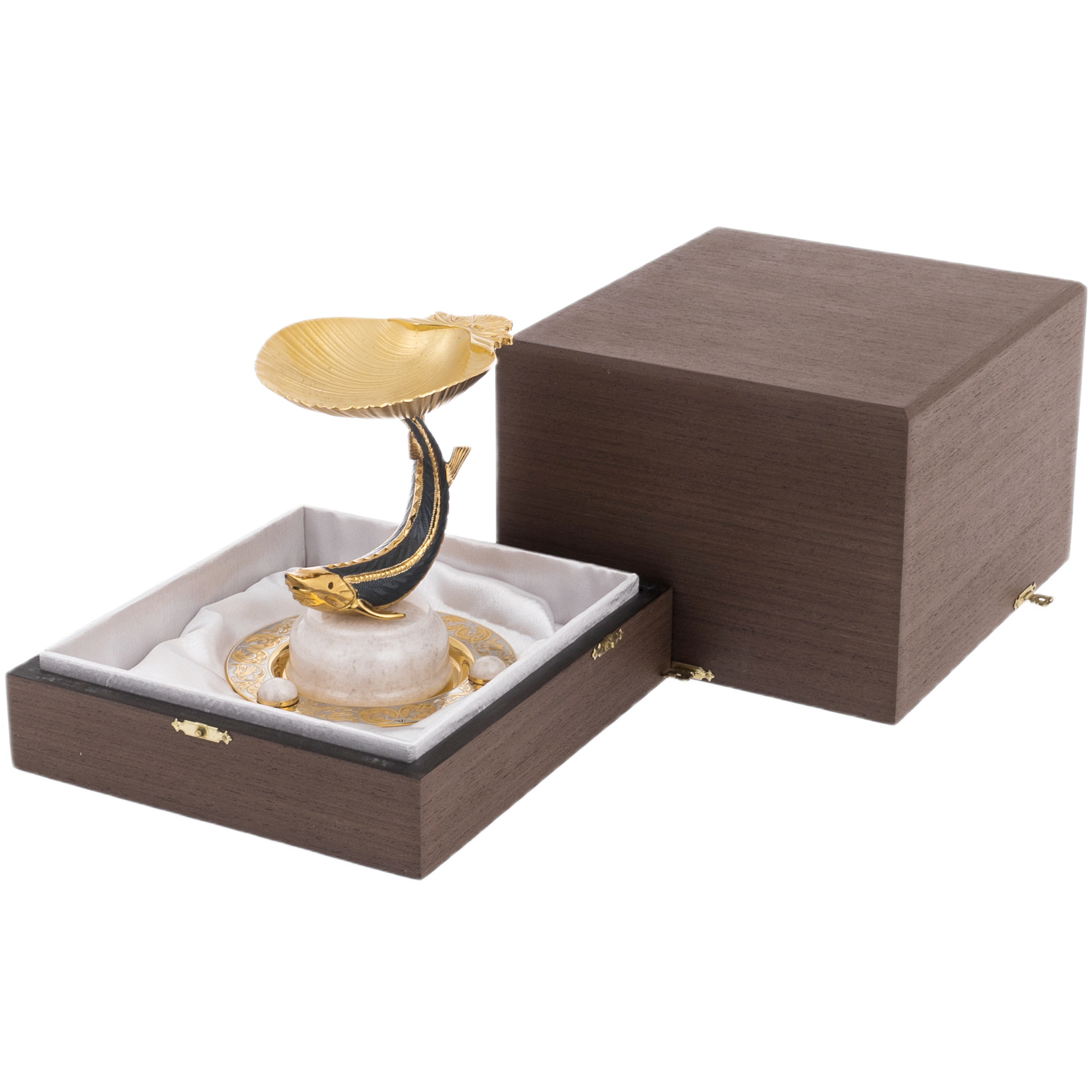 Форма белуги, взметнувшейся над основанием, передает движение — ее изгиб изящен, а чешуя словно оживает в игре света. Глубокий черный оттенок, дополненный тончайшей золотой отделкой, создает контраст, напоминающий вечерние воды Волги, в которых мерцают солнечные блики. Ее плавники, украшенные филигранной гравировкой, несут на себе историю златоустовского мастерства, бережно передаваемую из поколения в поколение.