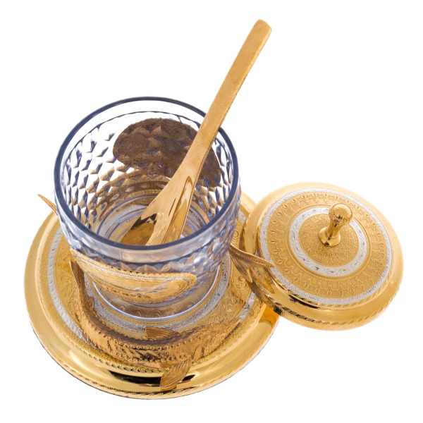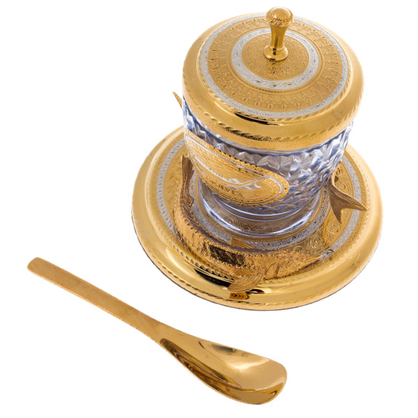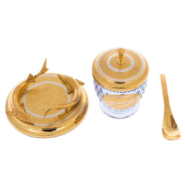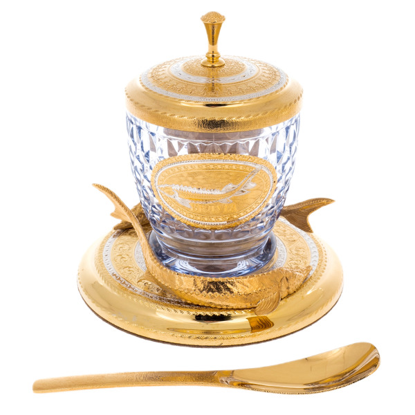 Центральный элемент набора — изысканная икорница, выполненная из высококачественных материалов и украшенная вручную. Ее гладкие линии и блеск золоченой отделки создают неповторимую гармонию с природной текстурой камня, на котором она расположена. Материал подставки добавляет изделию особую элегантность и стабильность, подчеркивая эксклюзивность и неповторимость каждого экземпляра.