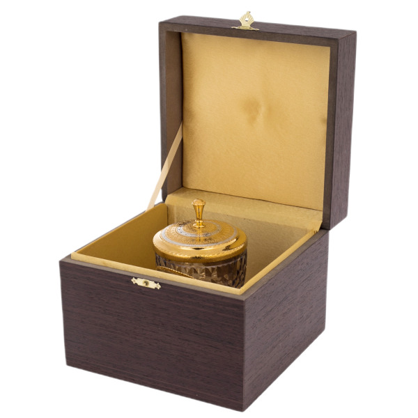 Икорница с крышкой "Кадка" ЗлатоустИкорница с крышкой "Кадка" ЗлатоустКоллекции изящной посуды от мастеров из Златоуста эффектно декорированы росписью, травлением и золочением. После того, как на полированную поверхность наносится изящный рисунок, изделие сушится в печи и подвергается обработке, после которого рисунок становится рельефным.