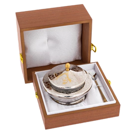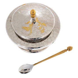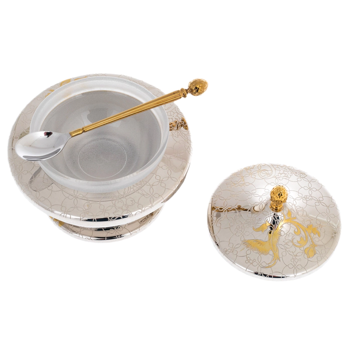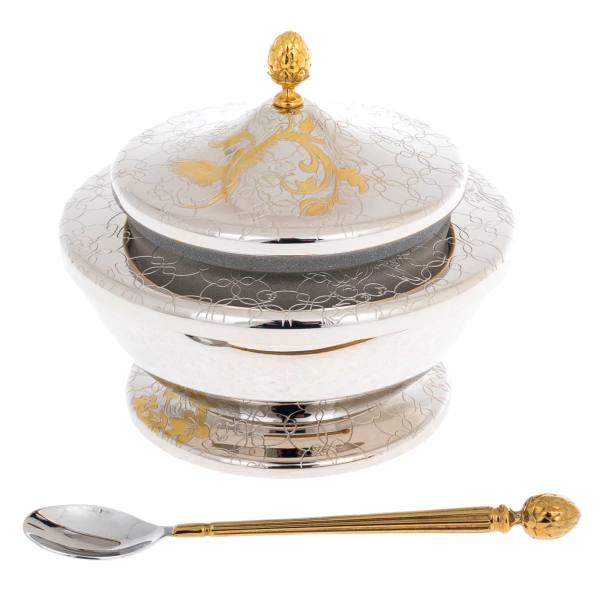 Оформление выполнено с использованием традиционных для Златоуста приёмов: точная гравировка, деликатная проработка орнамента и применение позолоты, создающей тёплый контраст с холодным блеском металла. Полированная поверхность отражает свет мягко и равномерно, усиливая глубину рисунка и подчёркивая сложность декоративной композиции. Крышка завершена фигурной ручкой, стилистически связанной с общим мотивом, а ложка повторяет характер орнамента, формируя цельный ансамбль.