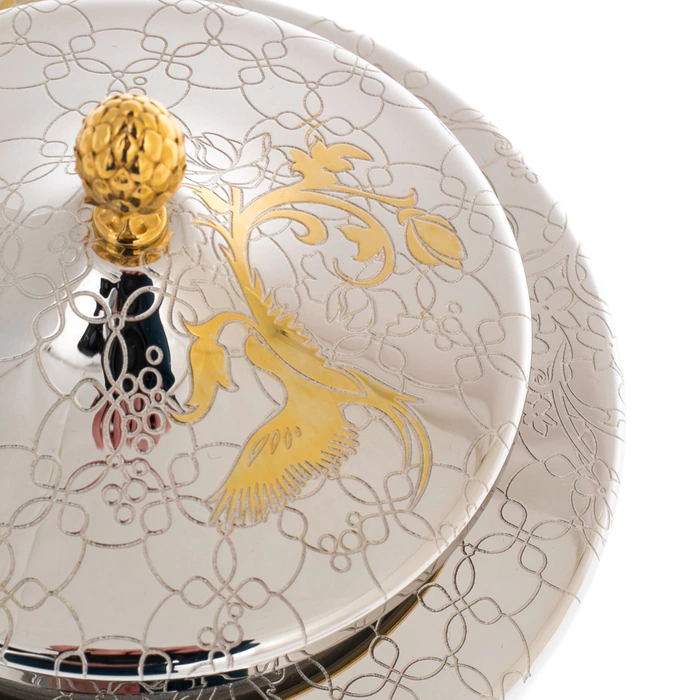 Икорница белужья «Райский сад» — изысканное произведение златоустовского искусства, предназначенное для утончённой сервировки деликатесов и создания особой атмосферы за столом. Композиция включает чашу с крышкой и изящную ложку, выдержанные в едином художественном решении. Поверхность украшена тончайшим орнаментом, в котором переплетаются плавные линии и растительные мотивы, дополненные золотыми акцентами. Центральным элементом декора выступает образ птицы, вписанный в композицию с лёгкостью и выразительностью, придающий изделию характер символа изобилия и гармонии.