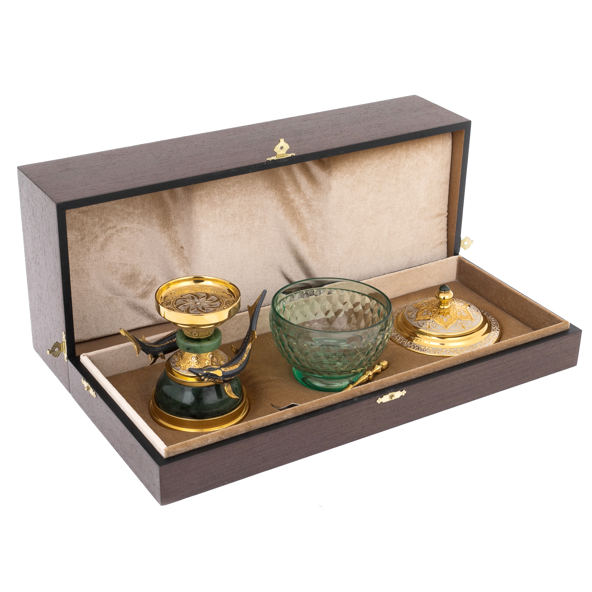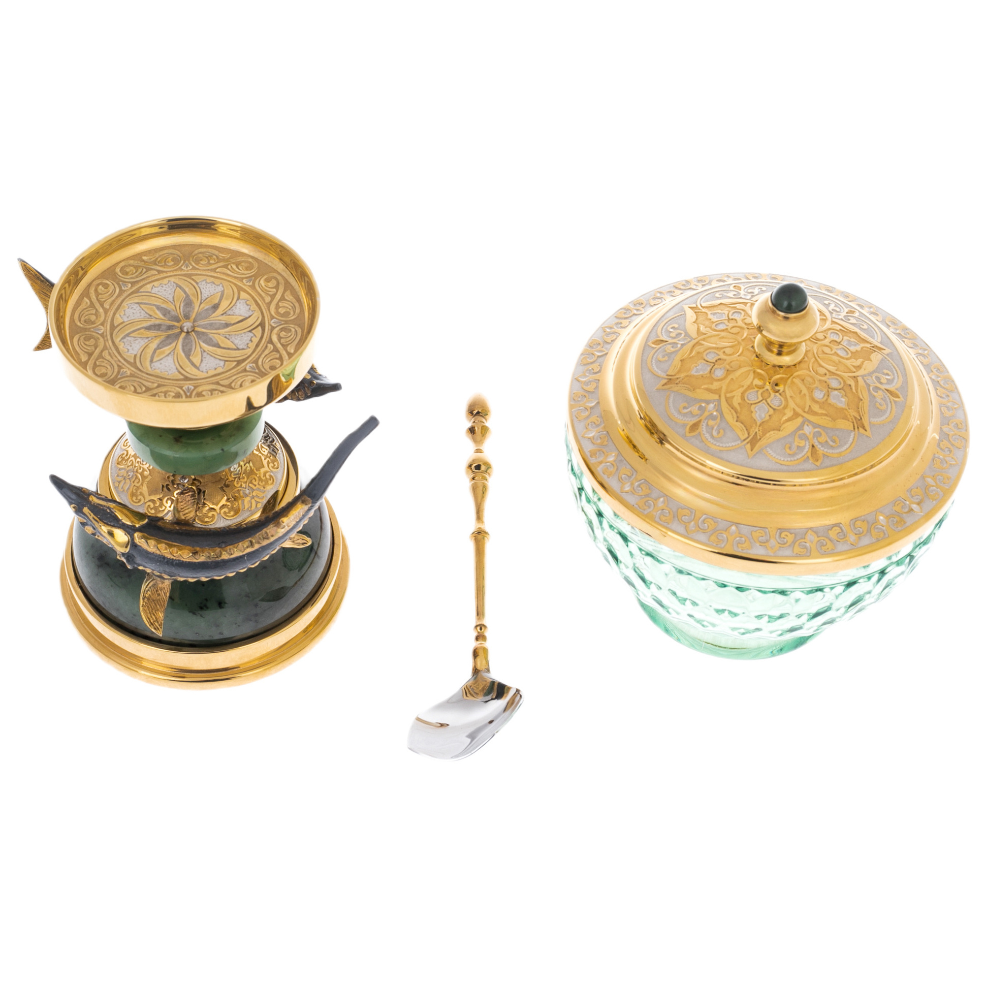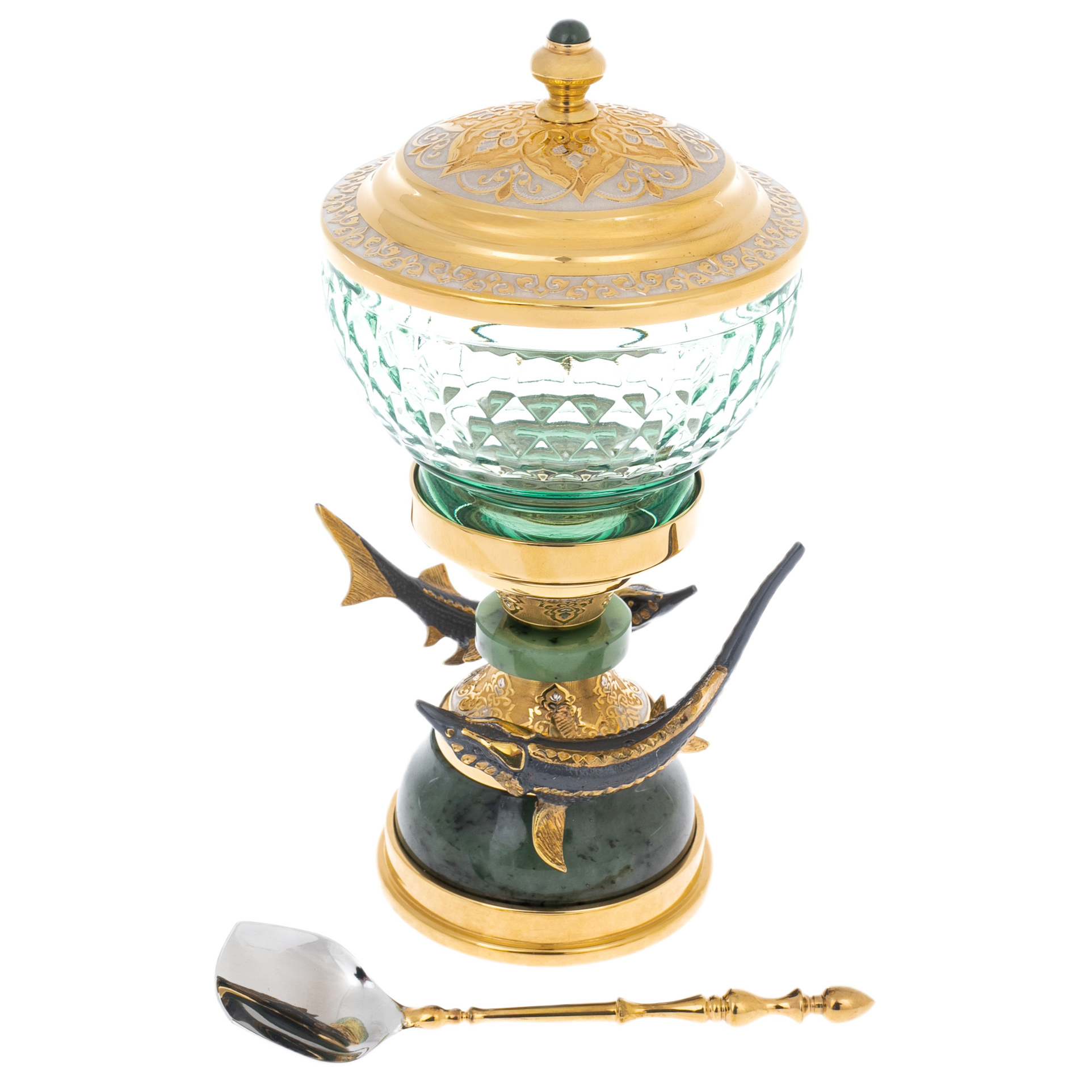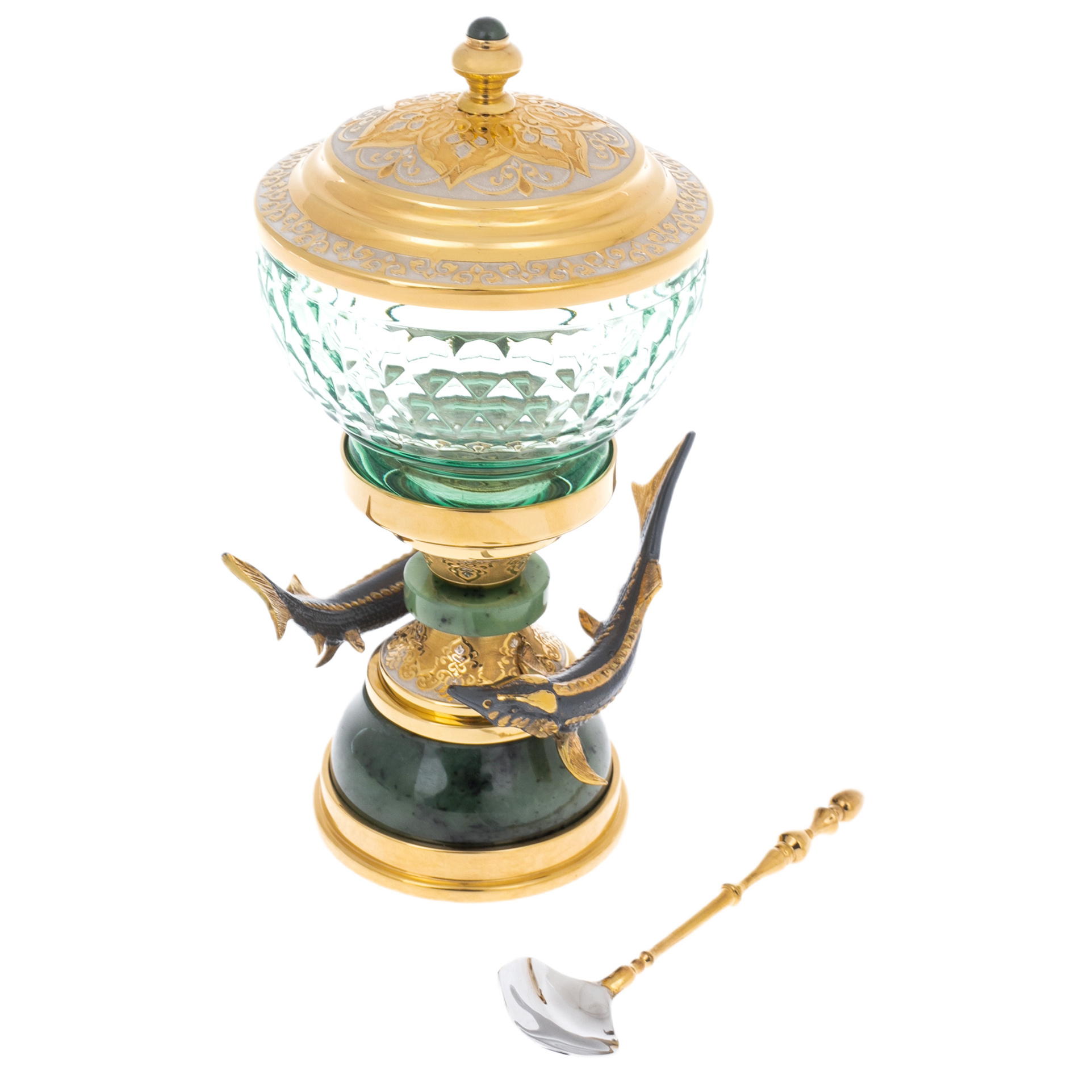 Функциональность здесь сочетается с художественной выразительностью: стеклянная чаша предназначена для изысканных сортов икры, а ложечка с филигранной рукоятью подчёркивает аристократичность подачи. Этот аксессуар способен стать достойным украшением коллекции ценителя редких предметов или изысканным подарком для тех, кто предпочитает окружать себя вещами высочайшего уровня исполнения.