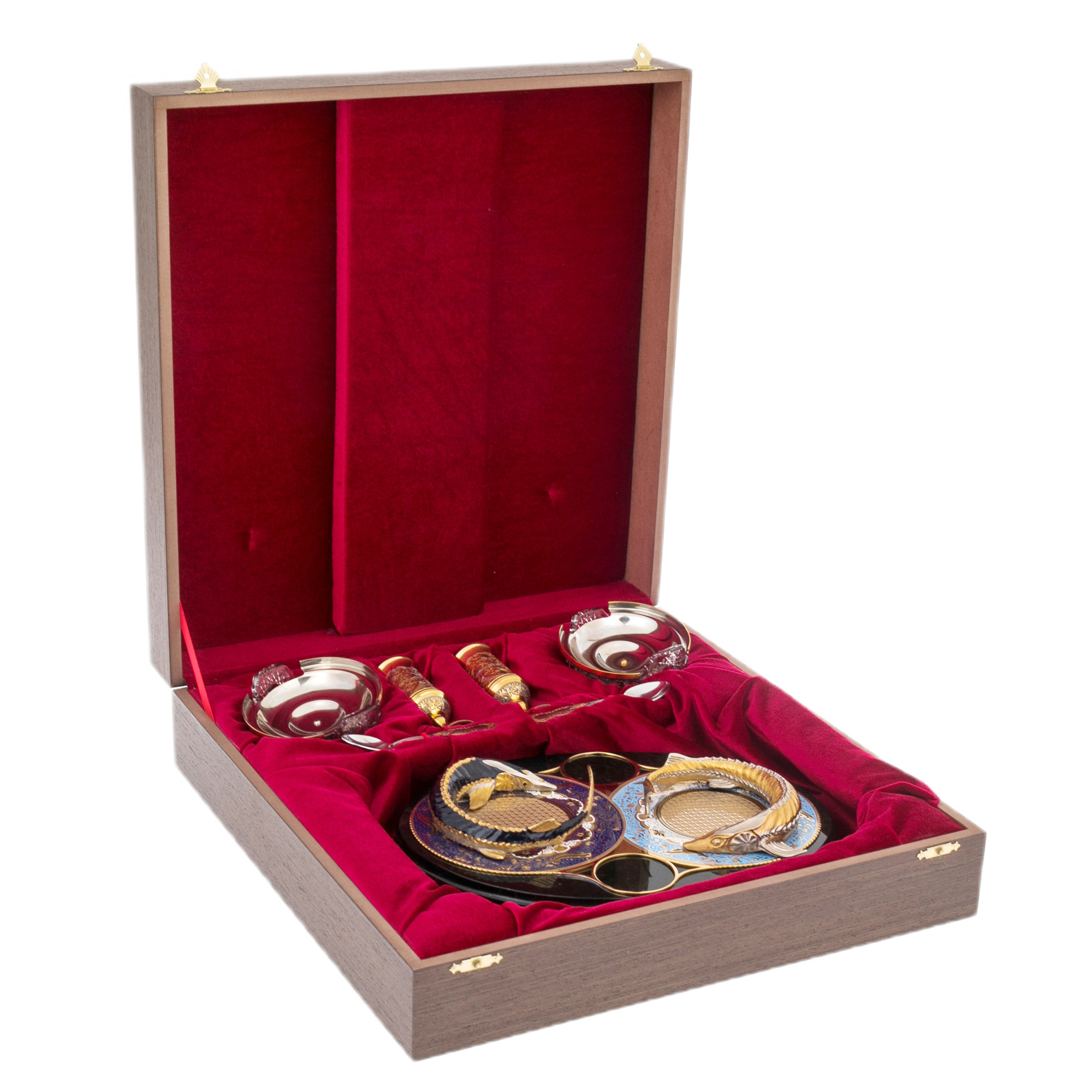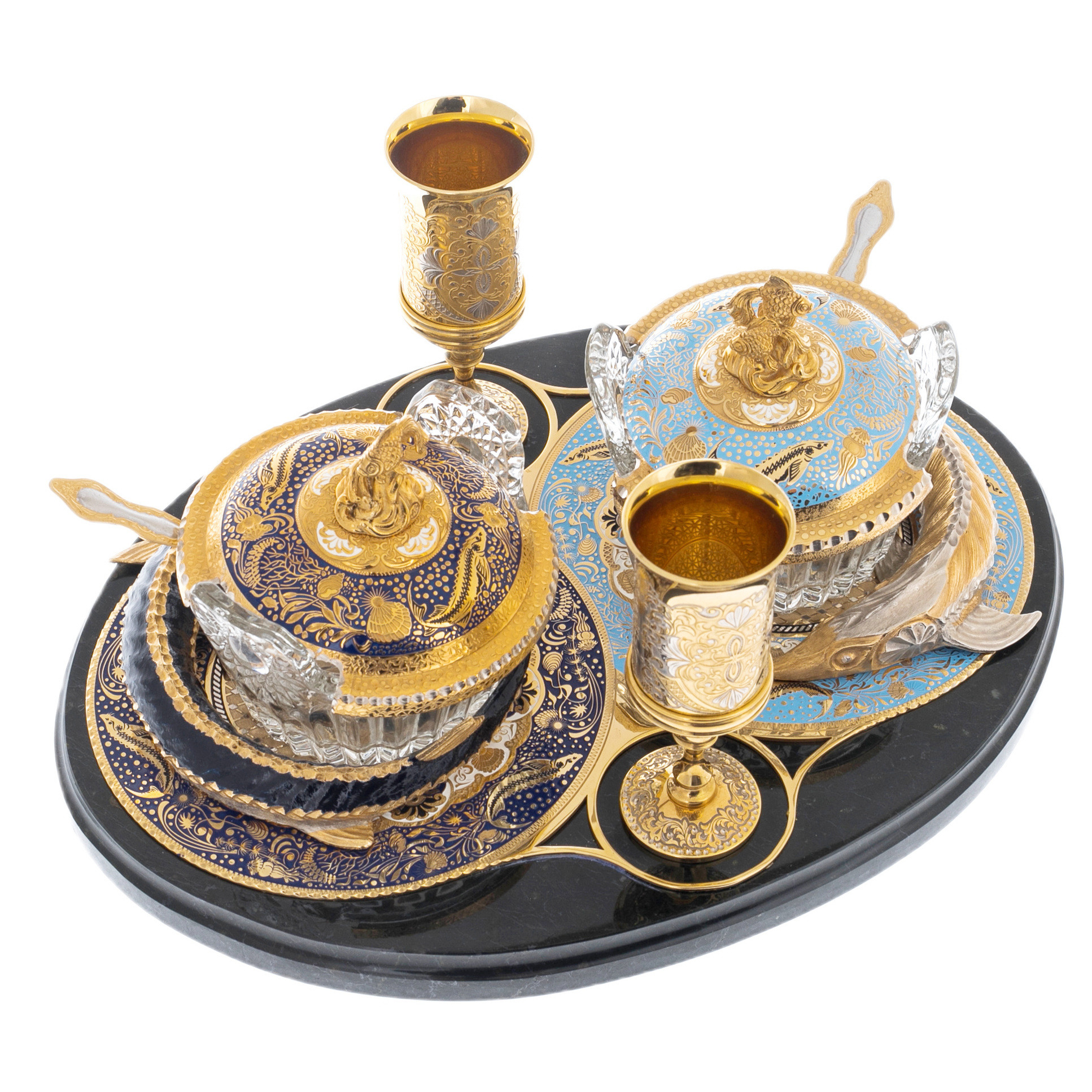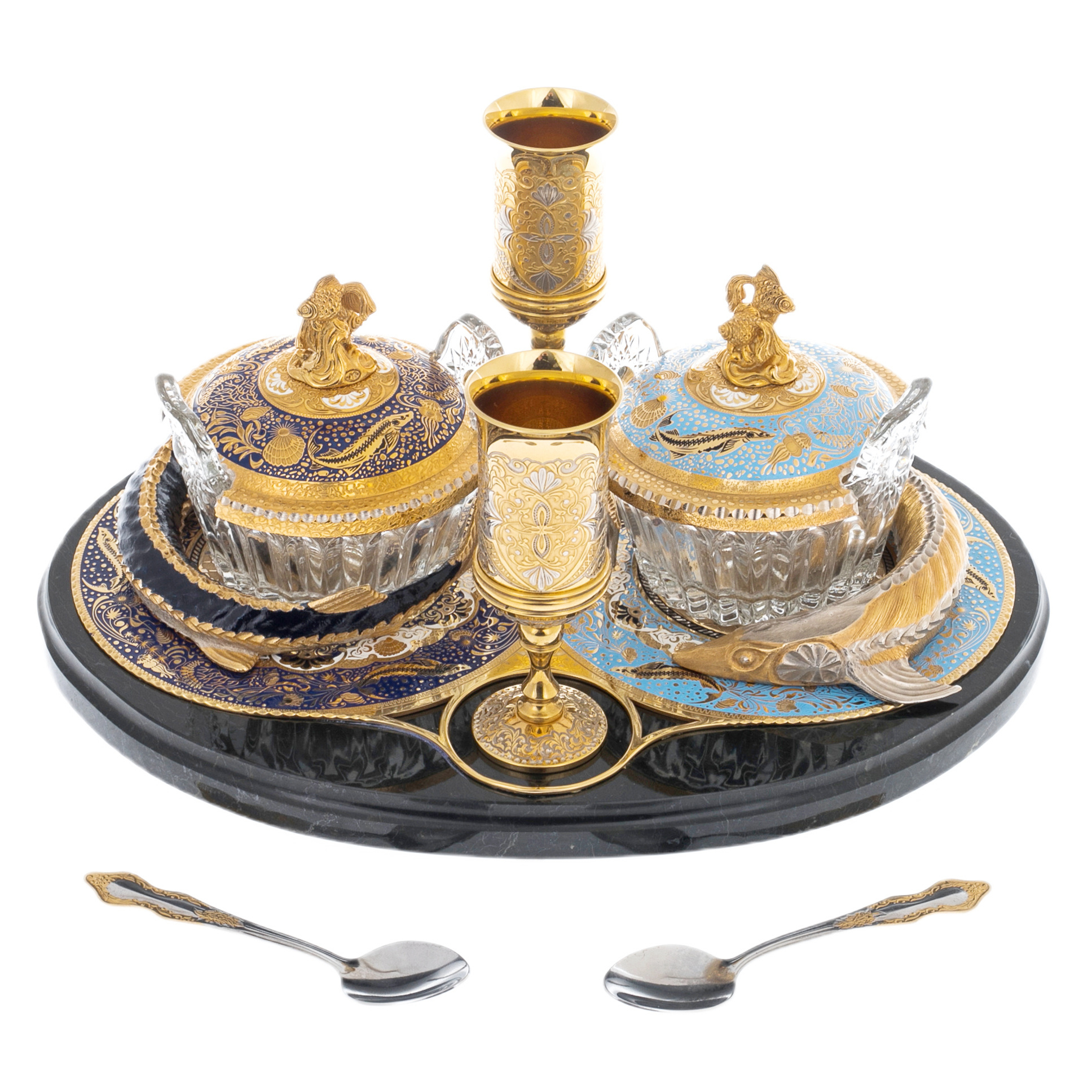 Комплектация: икорница — 2 шт., рюмка — 2 шт., ложечка — 2 шт., поднос.