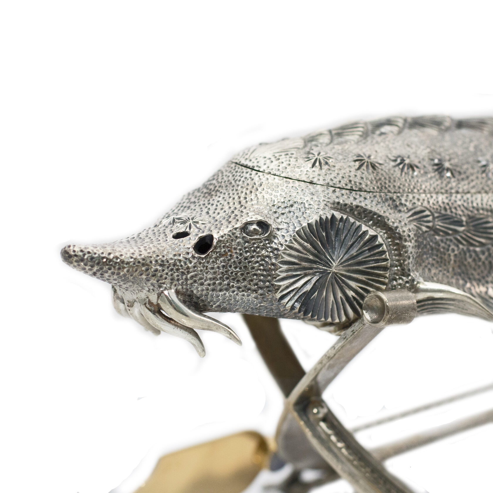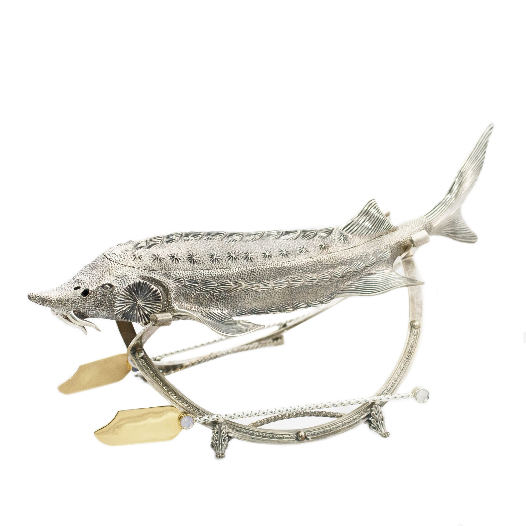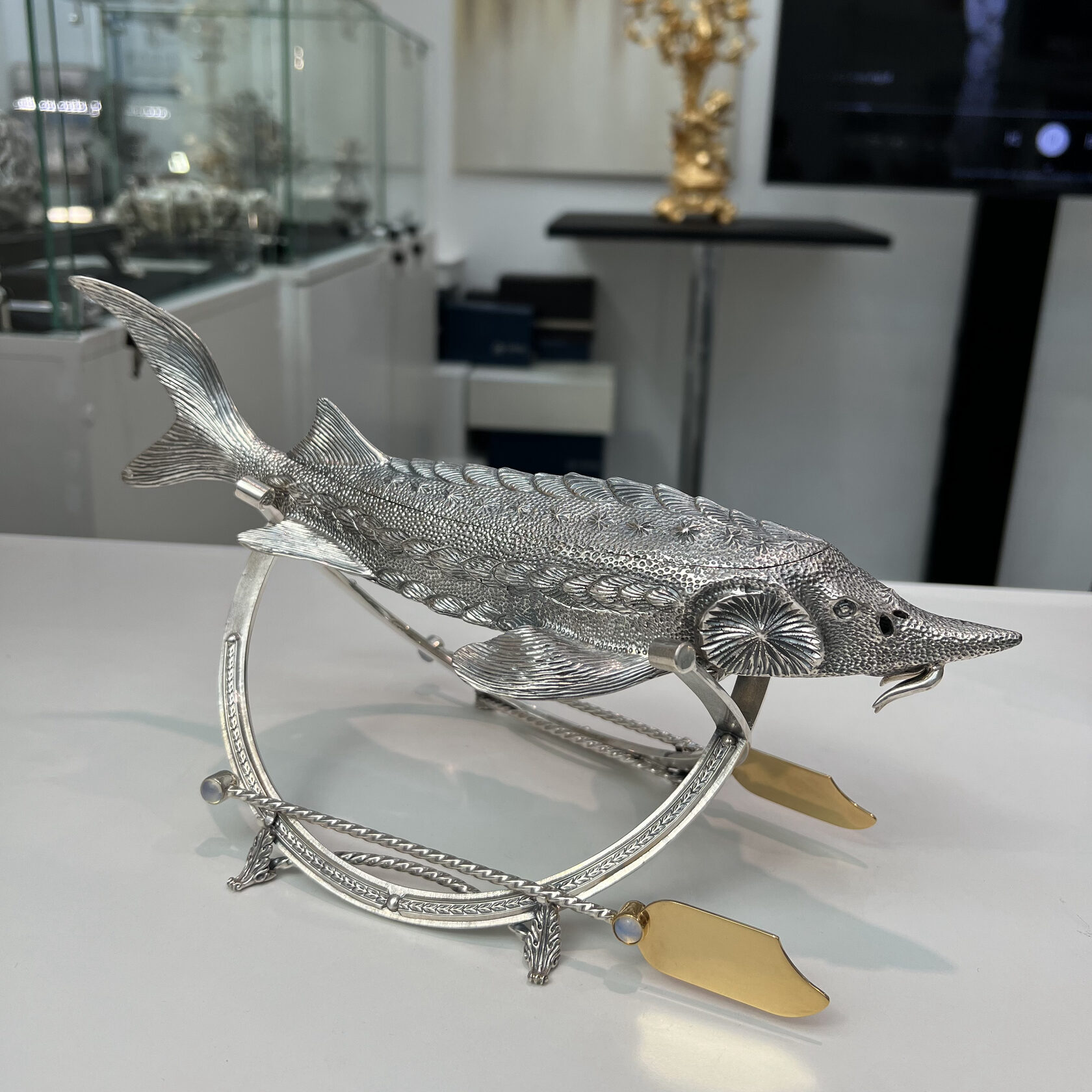 Оригинальная икорница «Осетр на подставке» из серебра 925 (опция — латунь с серебрением) выполнена по мотивам работ 19 века известного российского ювелира Карла Фаберже.