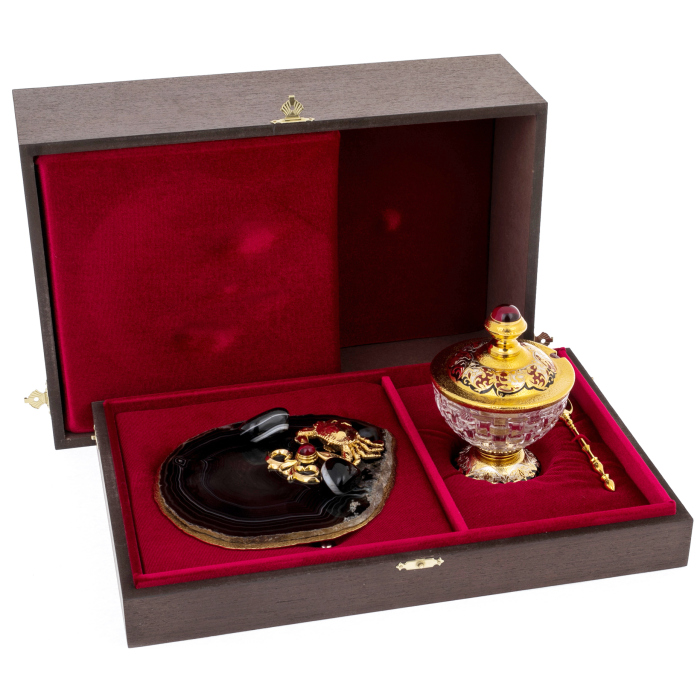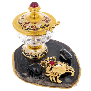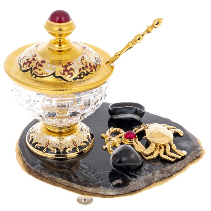 Икорница «Краб» на подставке из чёрного агата — предмет сервировки, созданный для подачи деликатесов с подчеркнутой торжественностью и точным чувством меры. В композицию входят чаша из прозрачного стекла с выразительной огранкой, крышка с позолоченным навершием, миниатюрная ложечка и подставка из чёрного агата, сохранённого в природном силуэте с живой линией края. Металлические элементы выполнены в традиции златоустовского декоративного оружейного искусства: тёплый блеск позолоты оттенён графикой узора и аккуратными цветными акцентами, а центральная вставка-кабошон придаёт предмету ювелирную завершённость; такая икорница уместна в кабинете, в парадной гостиной, на сервировке для приёма близкого круга или в качестве статусного подарка ценителю редких ремёсел.