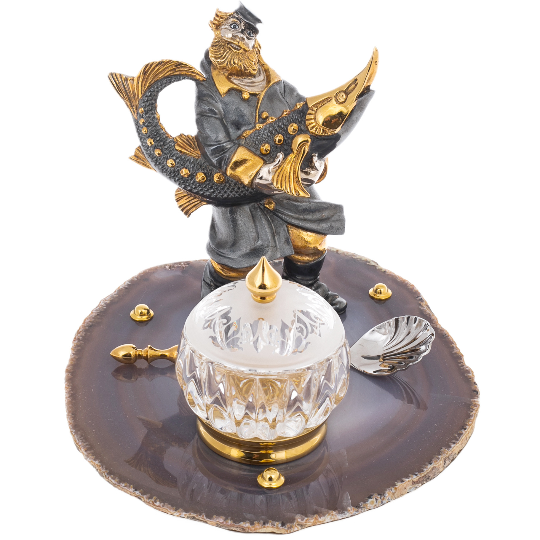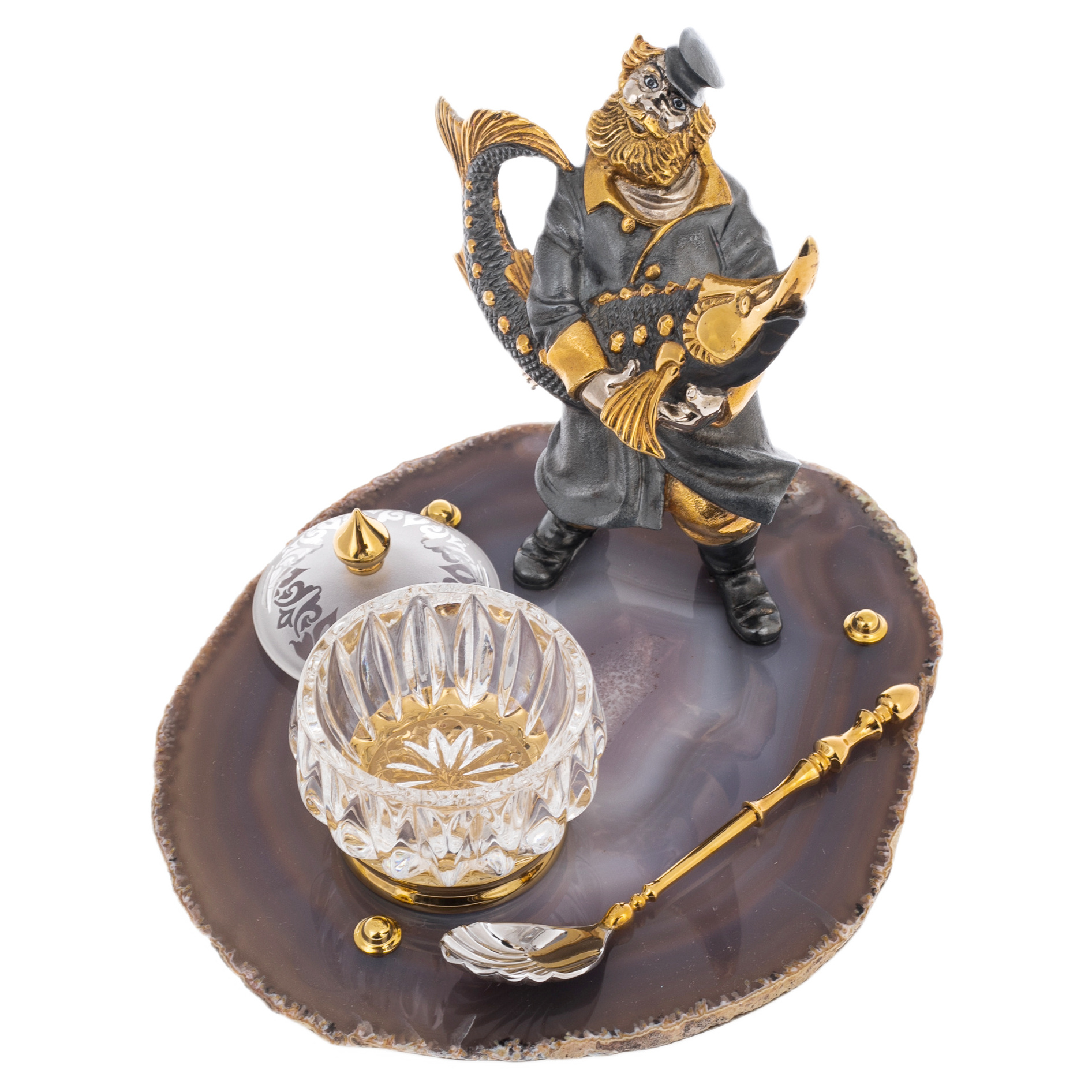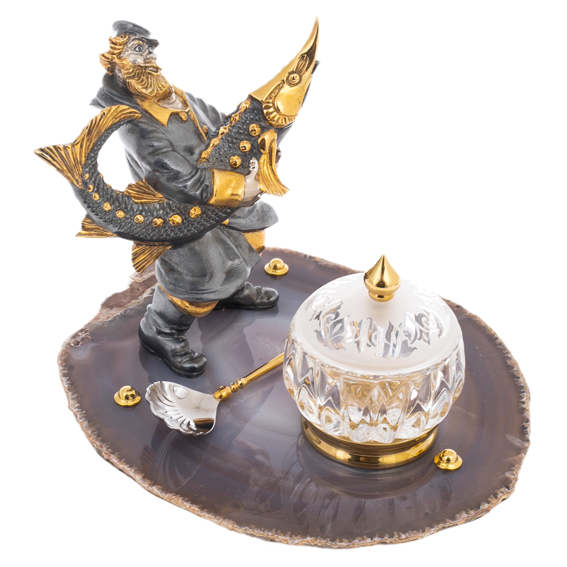 Икорница "Купец с осетром" на подставке из агата, Златоуст