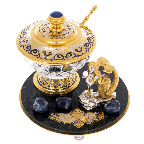 Хрустальная чаша, фасетированная вручную и посаженная на золочёную ножку с тончайшим орнаментом, закрывается массивной крышкой с рельефной ручкой. Верхняя часть крышки украшена золотой и серебристой гравировкой с добавлением синей эмали, формирующей узор, напоминающий завитки волн. На вершине расположена круглая вставка из лазурита, подчёркивающая единство цветовой палитры и придающая предмету драгоценный характер. Рядом с чашей размещена миниатюрная фигура русалки, созданная из серебристого металла и выделенная позолоченным хвостом, плавно изгибающимся вокруг основания; в руках русалки удерживается гладкая жемчужина, усиливающая образ хранительницы морских глубин.
