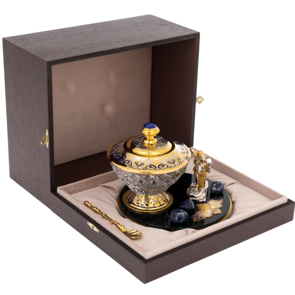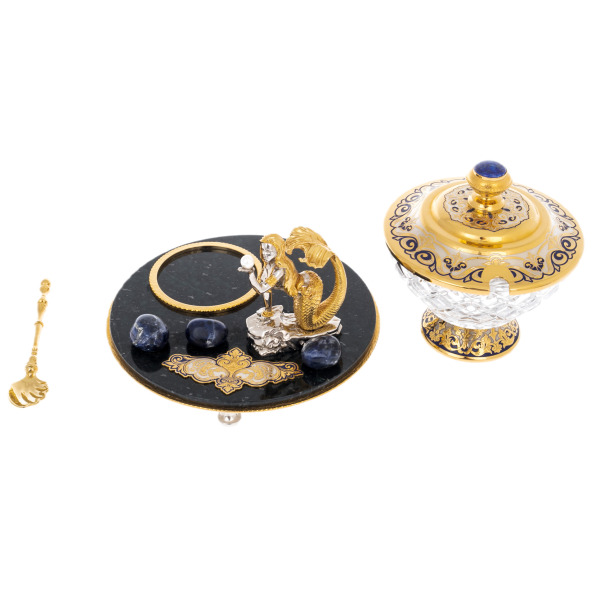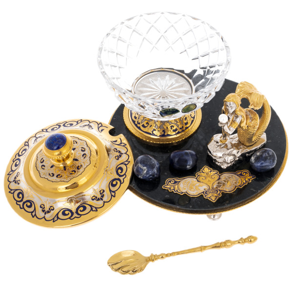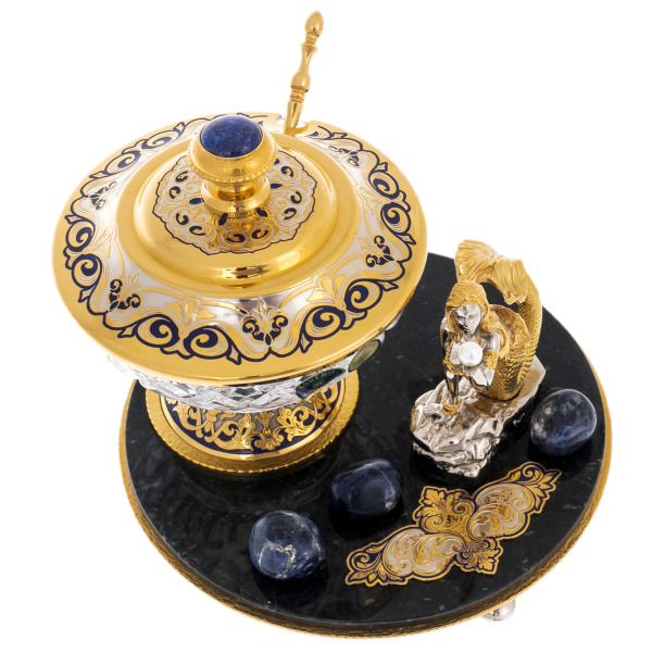 Эта икорница являет собой изысканный ансамбль, созданный в традициях златоустовского декоративного искусства и опирающийся на выразительный контраст природных материалов и ювелирной обработки металла. Основание выполнено из тёмного полированного нефрита, дающего глубокий зеркальный блеск, в котором будто растворяются золотые элементы и холодные вкрапления лазурита. На поверхности размещены крупные полированные камни насыщенного синего оттенка, усиливающие морскую тему и подчеркивающие декоративную насыщенность композиции.