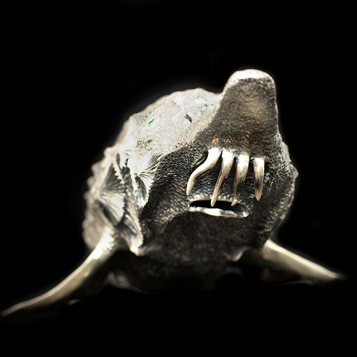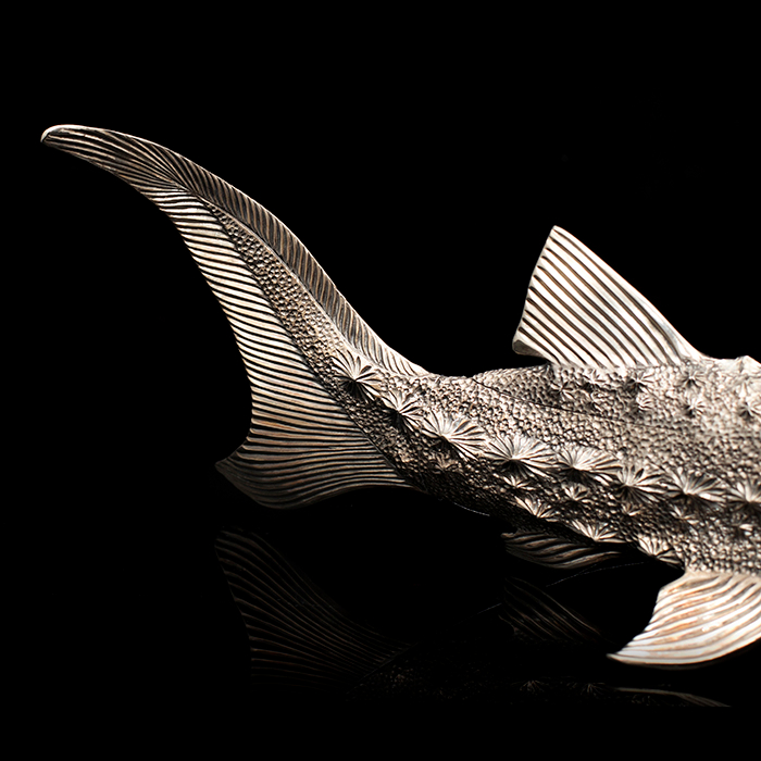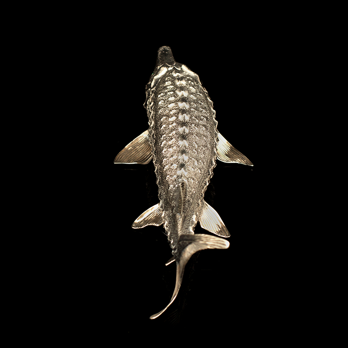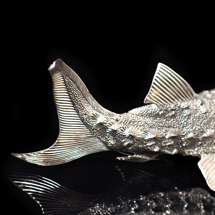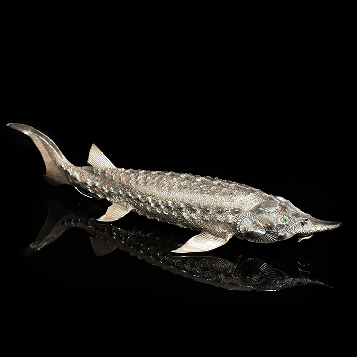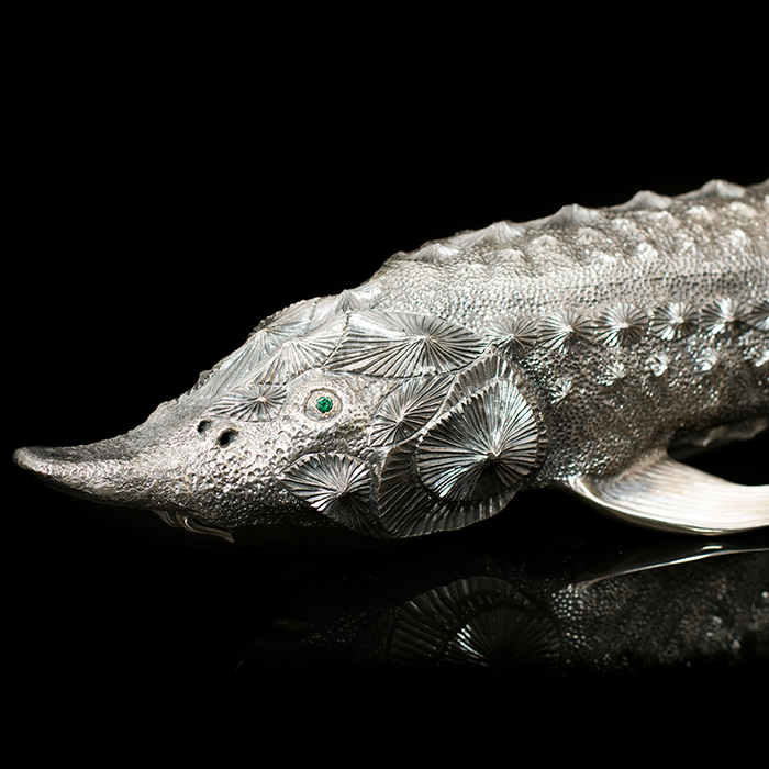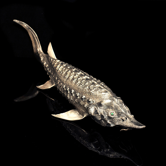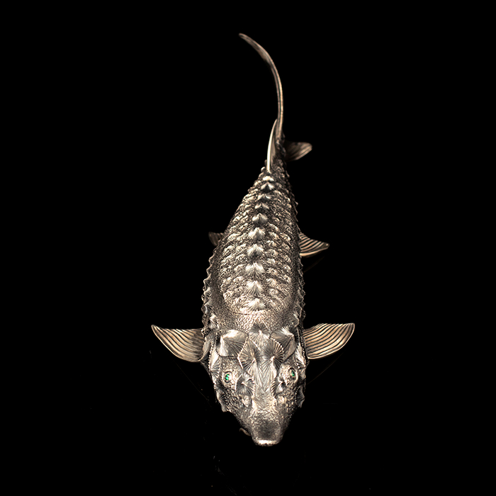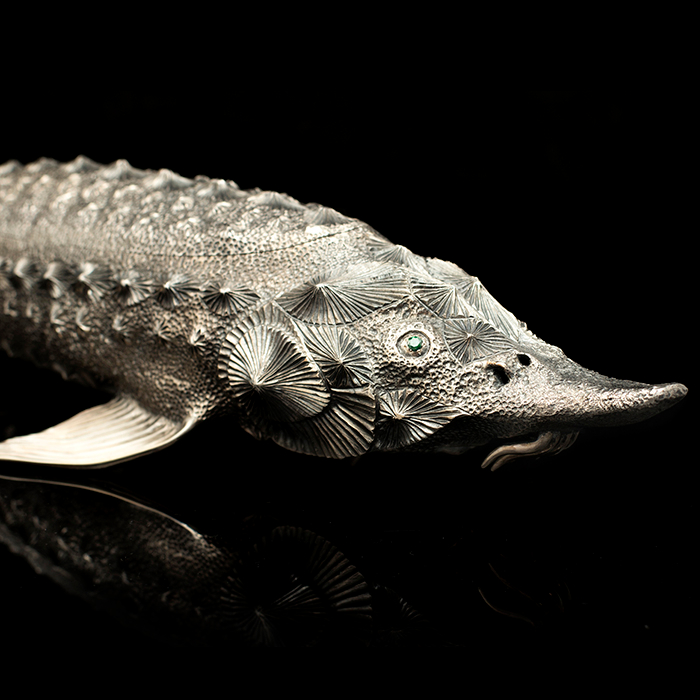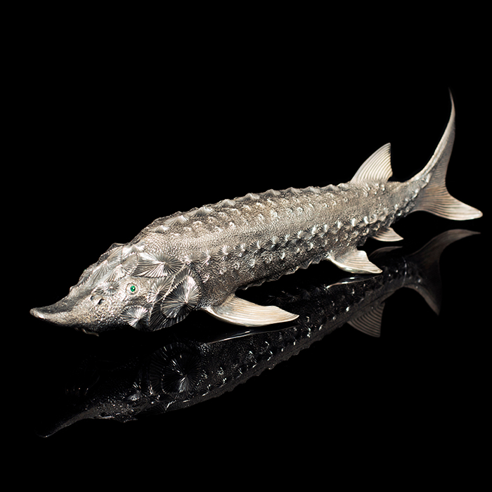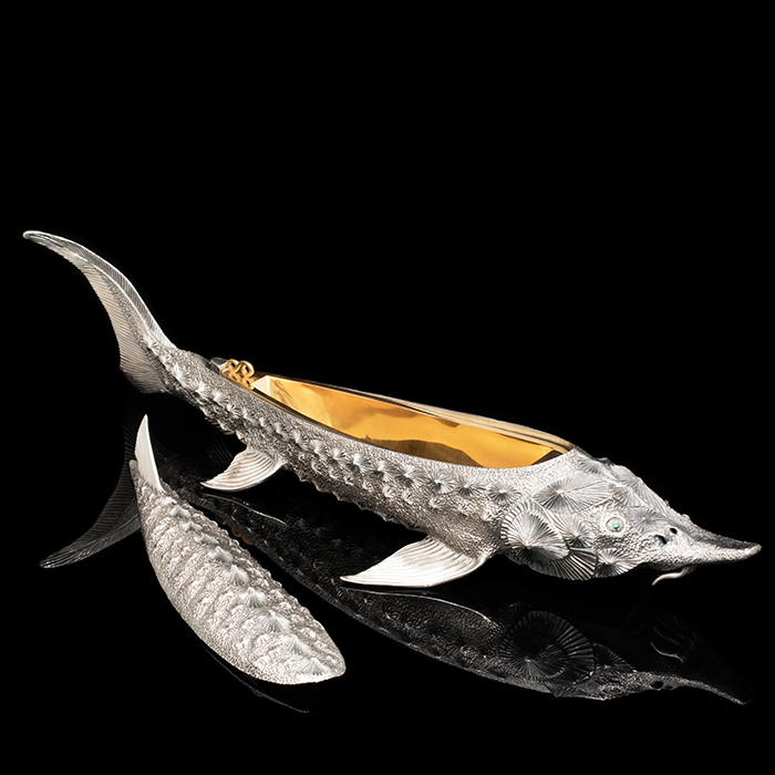 Оригинальная серебряная икорница "Осетр" выполнена по мотивам работ 19 века известного российского ювелира Карла Фаберже. В качестве ключевого образа выбрана знаменитая благородная рыба, являющаяся неотъемлемым блюдом на царских пирах. Верхняя часть изделия является съемной, открывающей доступ к позолоченной емкости для икры объемом 500 мл. Композицию украшают вставки из изумрудов, расположенных в глазах осетра. .