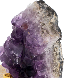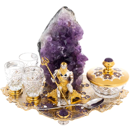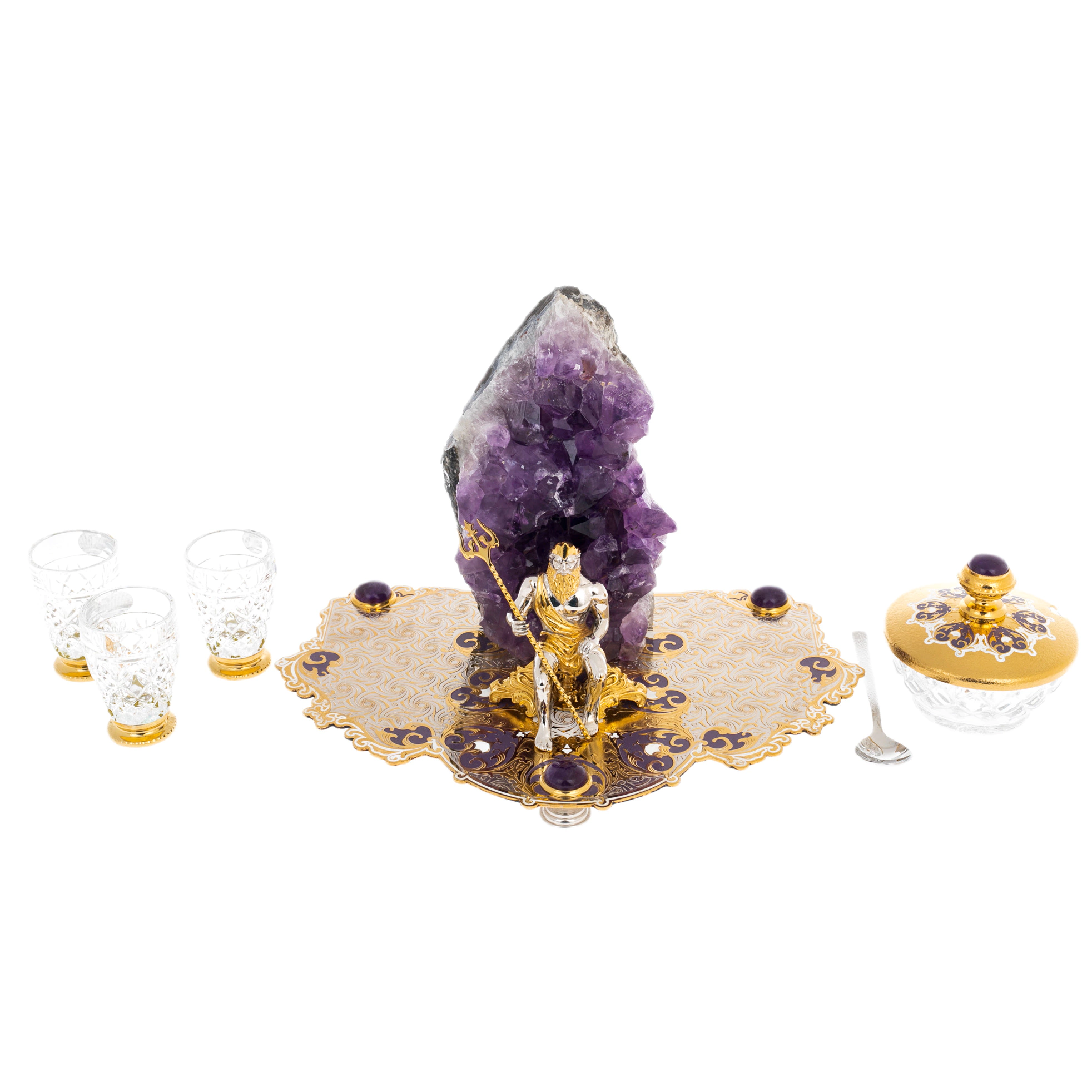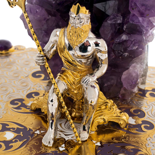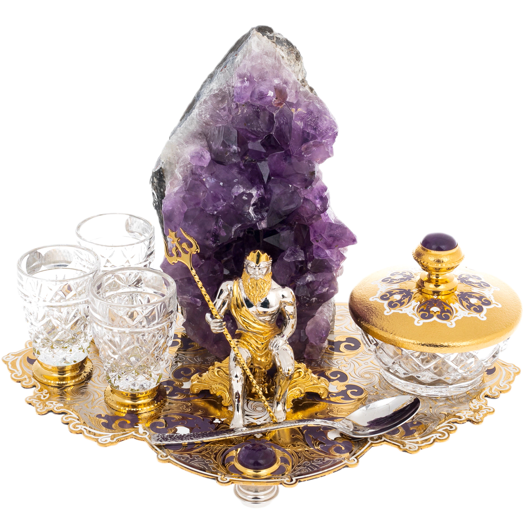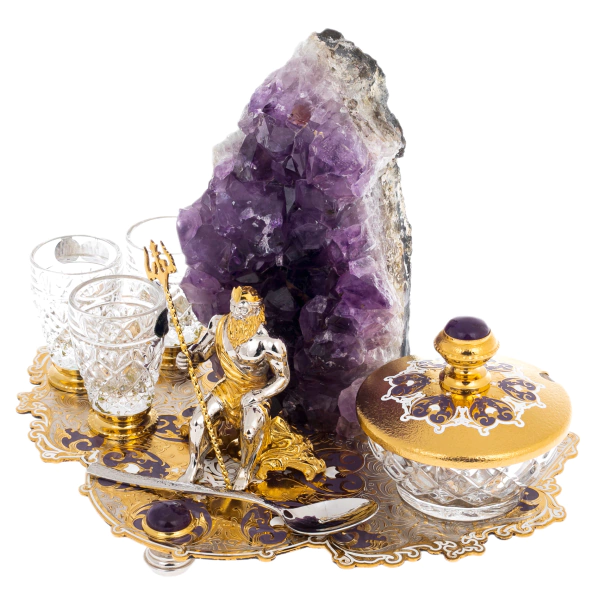 Икорница на аметисте «Повелитель морей» — выразительная композиция, объединяющая природную мощь камня и изысканность златоустовского художественного металла. В центре — массивный кристалл аметиста с глубокими фиолетовыми оттенками, создающий ощущение природной стихии, застывшей во времени. На декоративном основании размещены элементы сервировки: стеклянные стопки, чаша с крышкой и ложка, а также скульптурная фигура морского владыки с трезубцем, задающая всей композиции сюжет и характер. Золочёные и эмалевые акценты подчеркивают детали, формируя гармоничный и насыщенный образ.