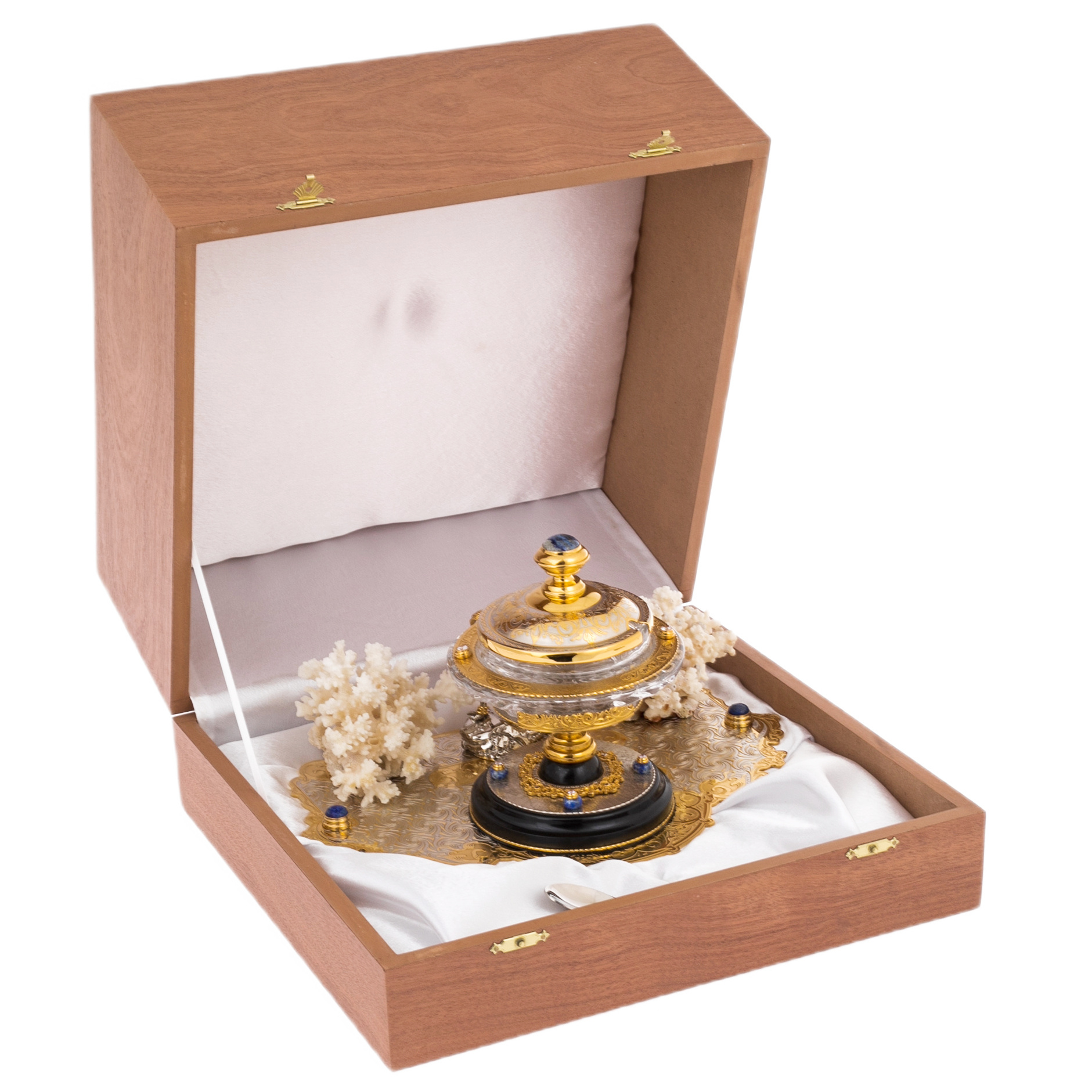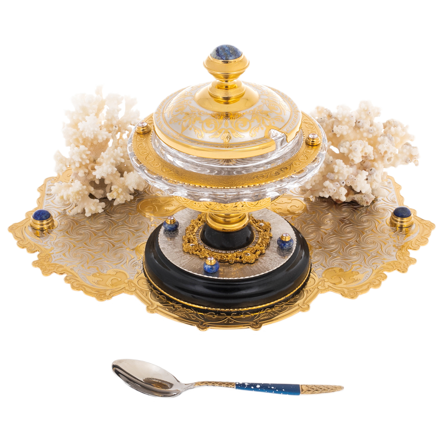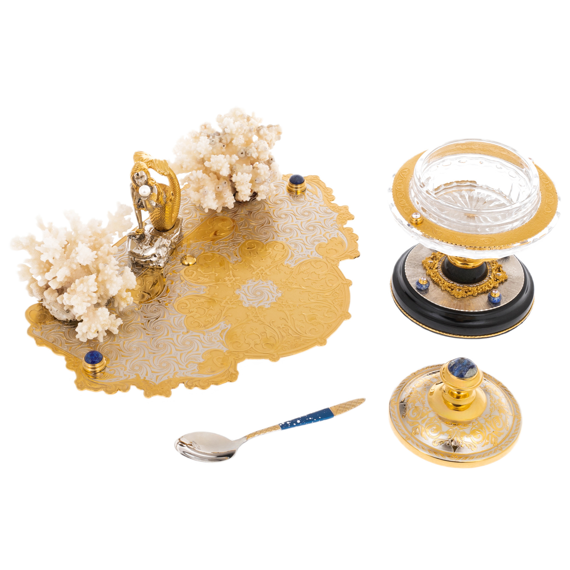 Икорница "Русалка" на подставке из долерита, с кораллом и лазуритом, Златоуст