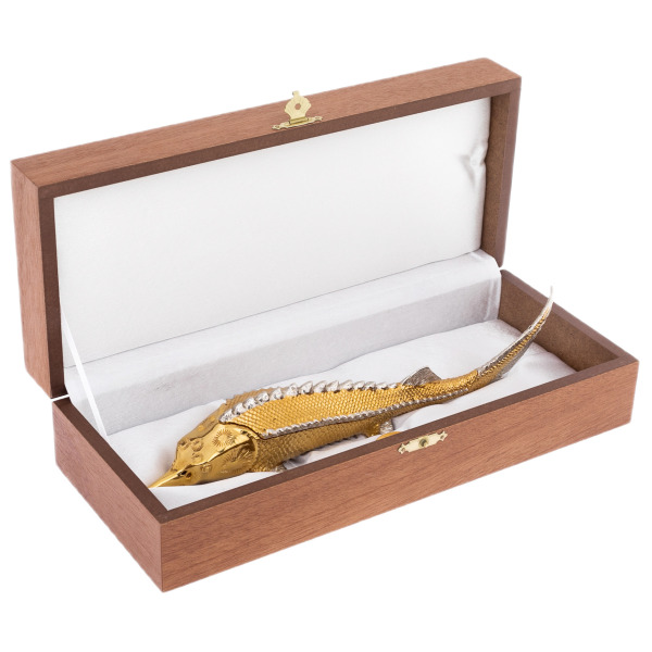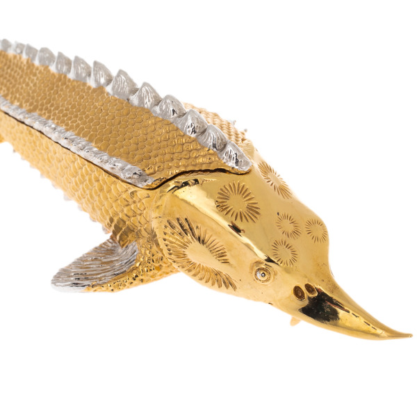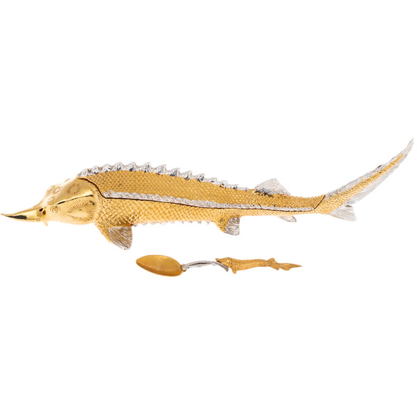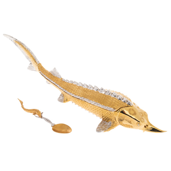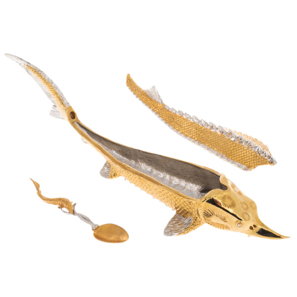 Икорница «Рыба Осетр» из Златоуста — произведение искусства, в котором изящество форм сочетается с традициями высочайшего мастерства. Воплощенная в металле, эта композиция отражает грацию и величие осетра — символа роскоши и изысканного вкуса. Тело рыбы, покрытое чешуей, вручную инкрустировано серебром и золотом, передавая естественную фактуру и игру света на поверхности. Гравировка, выполненная в технике златоустовского декора, демонстрирует филигранную точность линий, тонкость проработки каждой детали, от острого хищного носа до рельефных спинных костяных жучек.