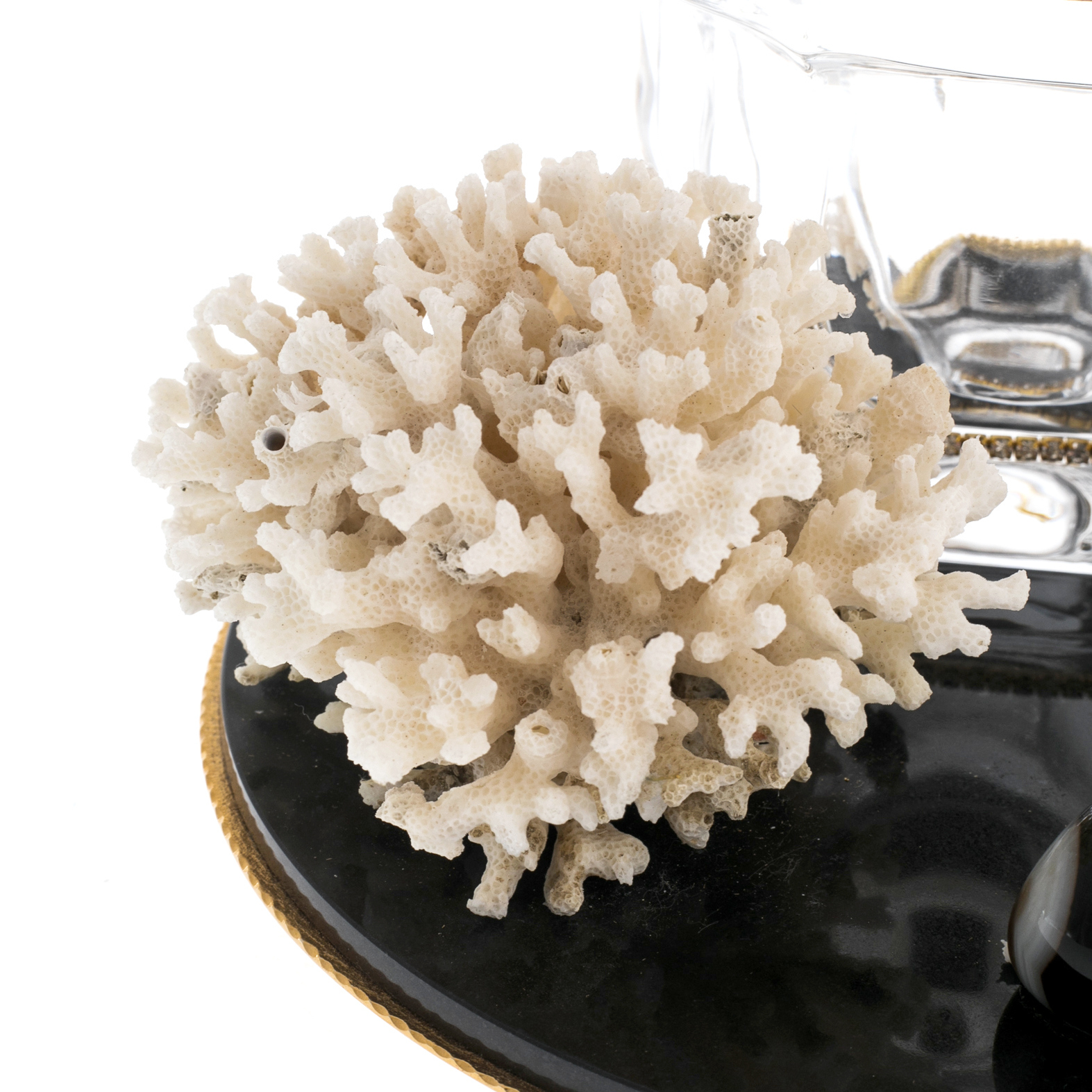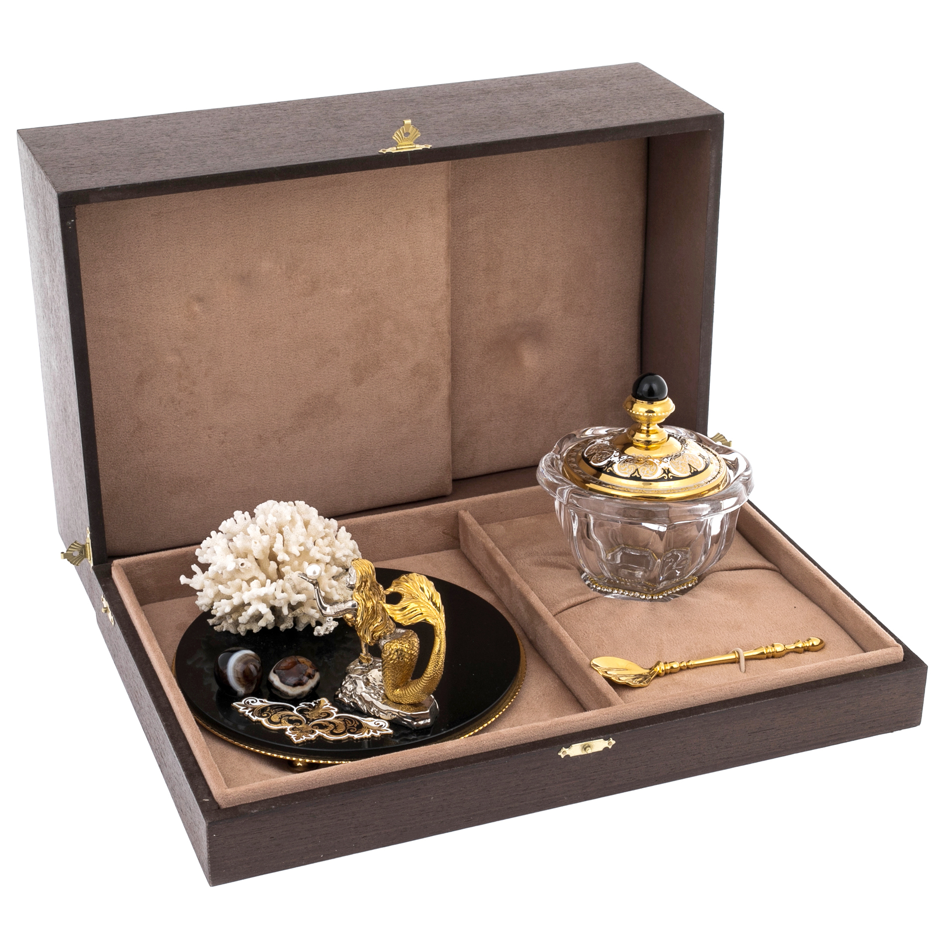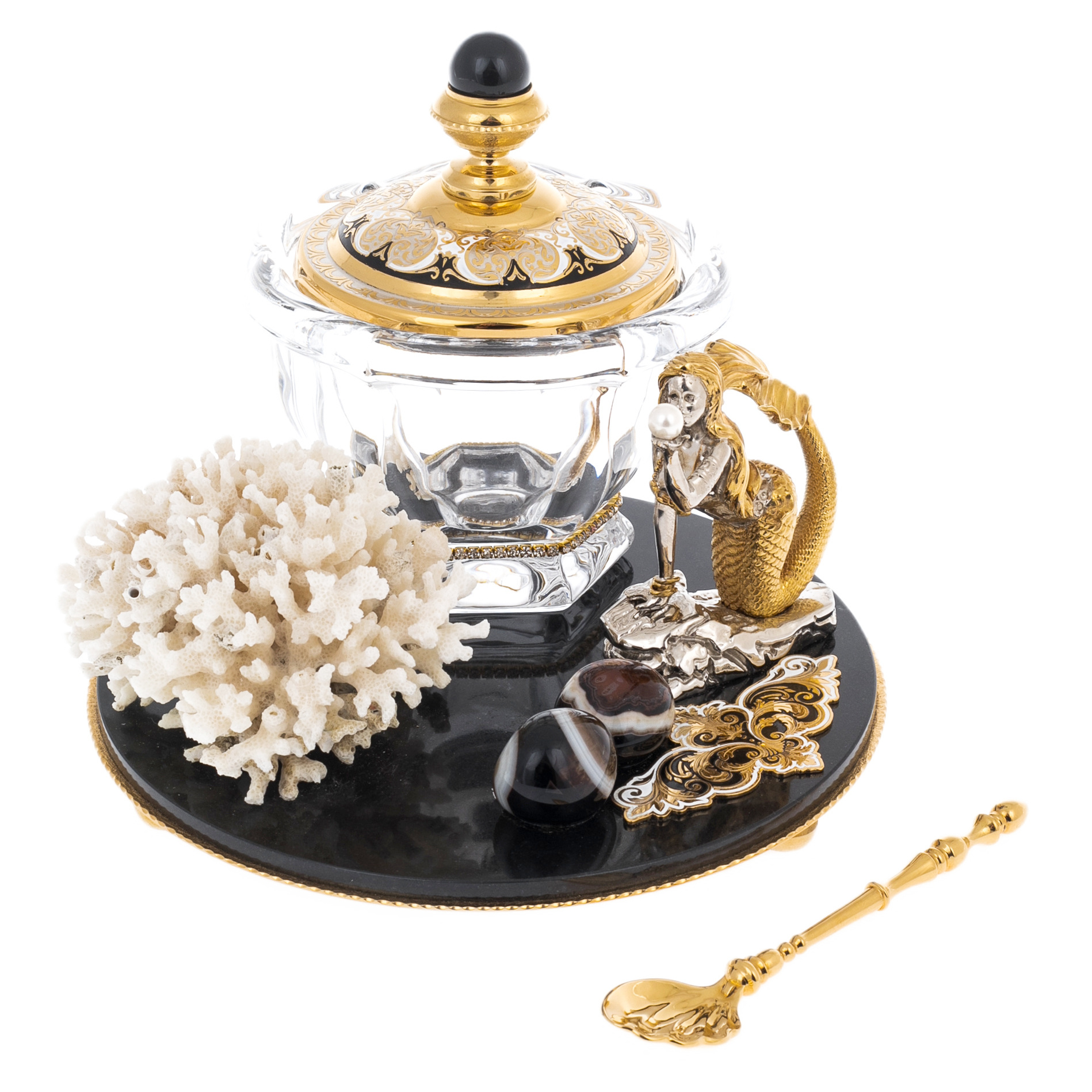 На подставке рядом покоится настоящий коралл — причудливый, природный, словно только что из тёплого тропического рифа, — он добавляет композиции дыхание моря и подчёркивает идею роскоши, созданной самой природой. Агатовые камни, отшлифованные до глянцевого блеска, перекликаются с цветовой гаммой изделия и служат эстетическим равновесием между хрупкостью стекла и мощью металла. В комплект входит изящная позолоченная ложечка с листовидной чашей, украшенная миниатюрным рельефом — невесомым, но завершённым штрихом этой драгоценной сцены.