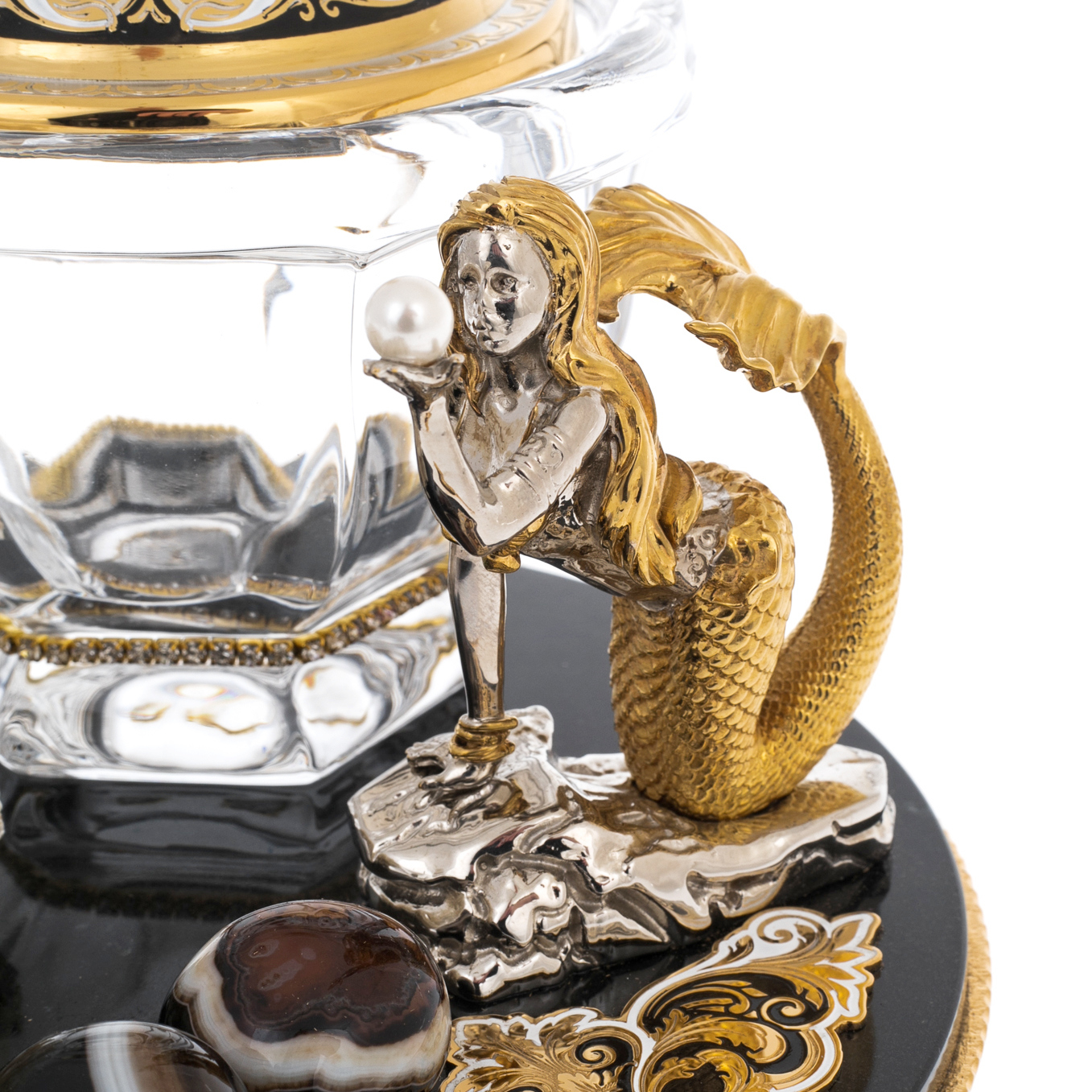 На чёрном зеркальном основании, выполненном из отполированного камня, раскрывается сцена морской сказки, воплощённая в икорнице «Русалка». В центре композиции — прозрачная хрустальная чаша с плотно подогнанной крышкой, увенчанной литым золотым навершием и вставкой из чёрного камня. К чаше приникла русалка, изящно вытянув ладонь с жемчужиной, будто только что поднятой со дна океана. Её золотой хвост изгибается с морской грацией, играя бликами на свету, а серебряное тело мерцает ледяным холодом под акцентом ручной проработки чешуи.