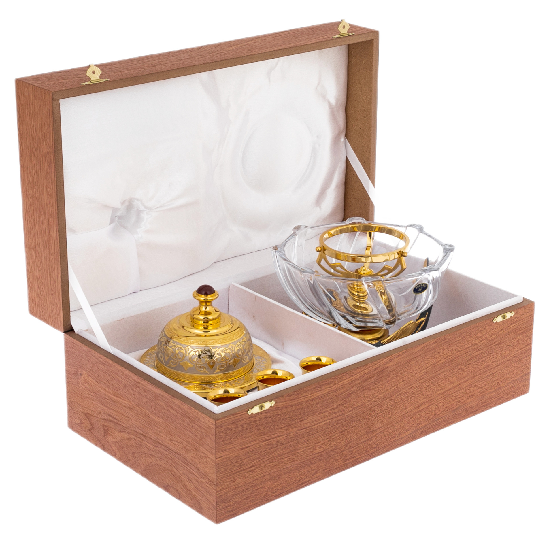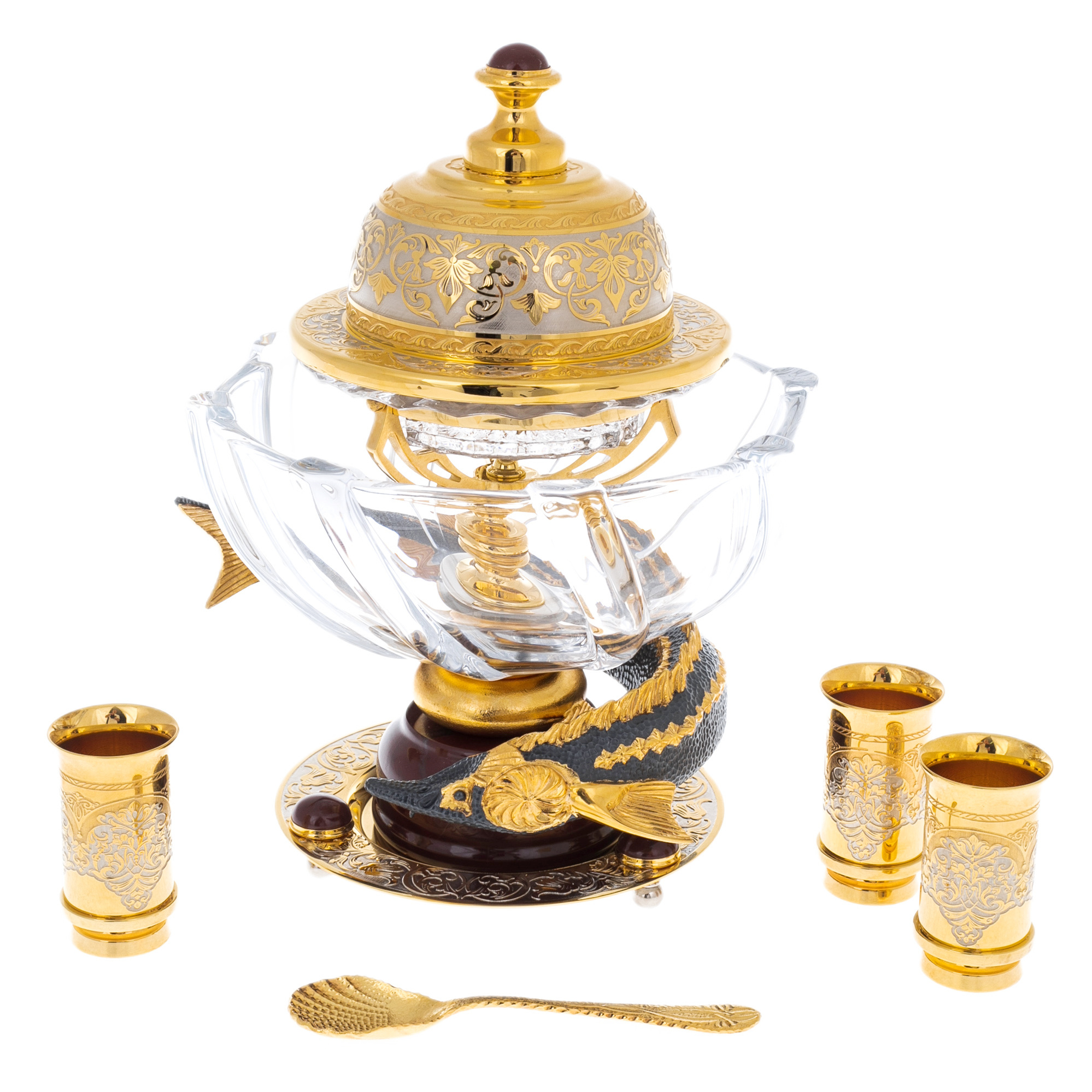 В комплект также входят три изысканные стопки, которые идеально дополняют икорницу. Каждая из них украшена вручную с использованием тех же техник и материалов, что и в основном изделии. Благодаря этому стопки органично вписываются в набор и дополняют его, придавая вашему застолью дополнительные шик и торжественность.