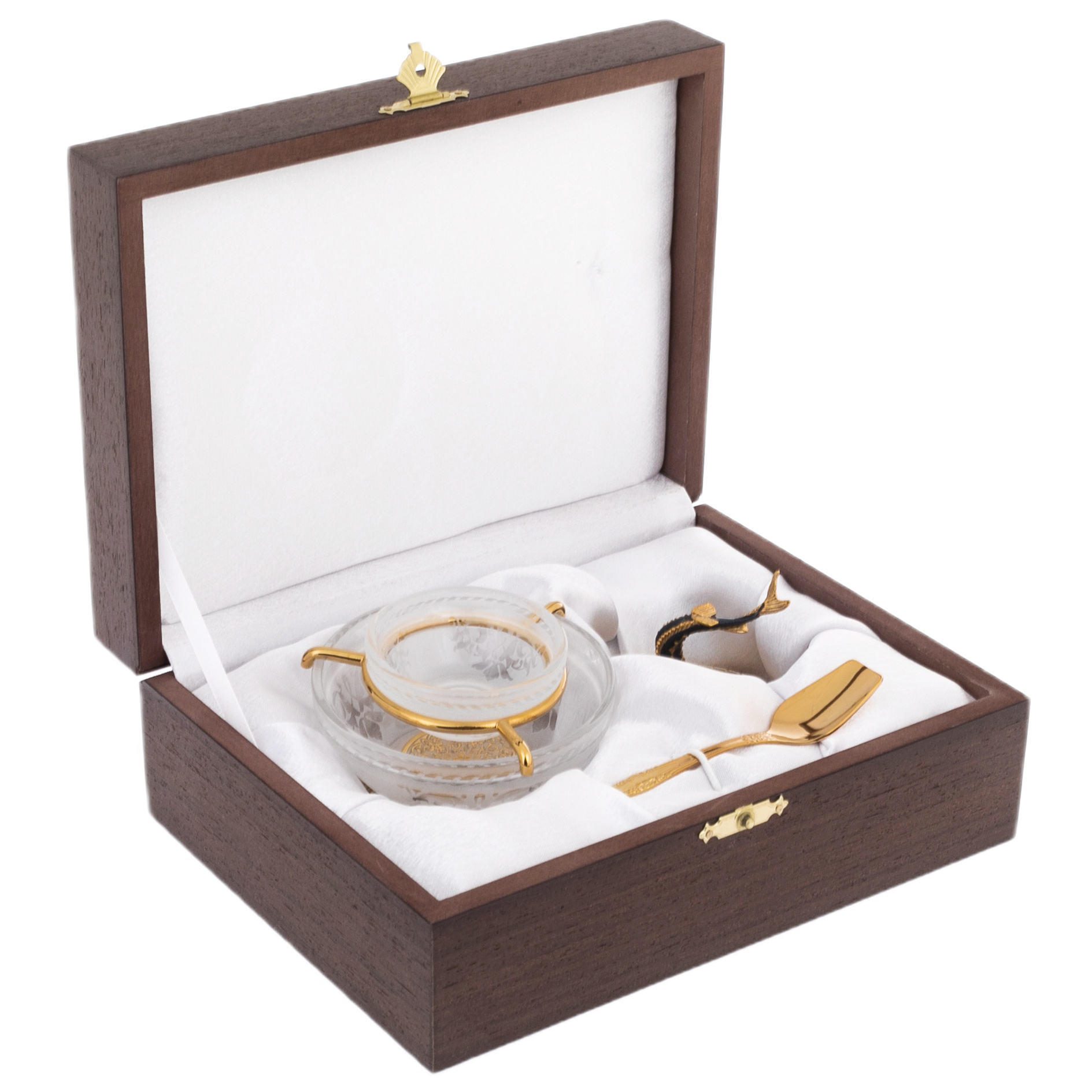 Чаша из прозрачного хрусталя, сверкающая на свету, создает иллюзию водной глади, подчеркивая совершенство формы и чистоту материала. Ее основание, украшенное тончайшей гравировкой, переливается золотом, символизируя богатство и изобилие. Дополняет ансамбль крышка, венчаемая фигурой осетра, изогнутая линия тела которого напоминает о движении воды и динамике жизни. Этот король водной стихии, выполненный с потрясающей детализацией, олицетворяет силу, благородство и процветание.