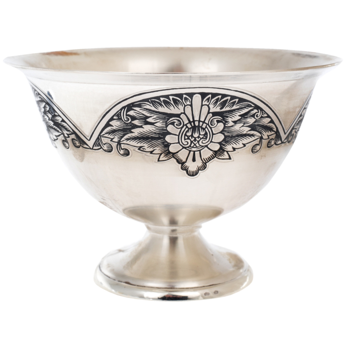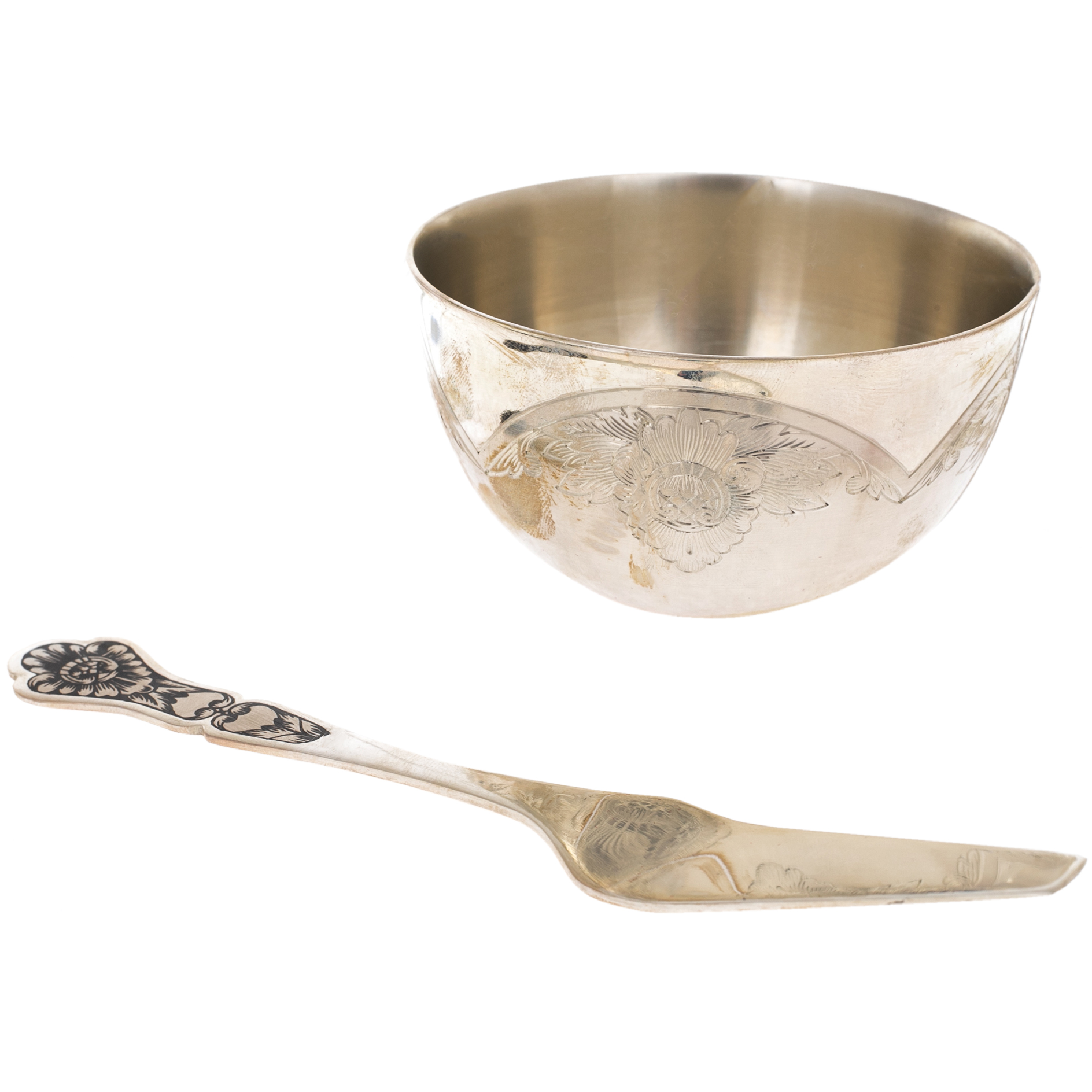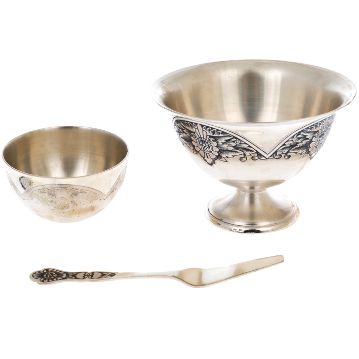 Корпус изделий создан из плотного серебра, отливающего мягким теплым блеском. Поверхность украшена черненым орнаментом, выполненным с тончайшей проработкой — цветочные мотивы и плавные линии, нанесенные мастером вручную, образуют изысканный декоративный фриз, подчеркивающий благородный характер предмета. Внешняя чаша обладает мягким, широким силуэтом, сужающимся в устойчивое основание, а внутренняя емкость, имея гладкие стенки, обеспечивает сохранность вкуса продукта. Лопатка с узорной рукоятью повторяет стиль набора, формируя завершённый визуальный образ.