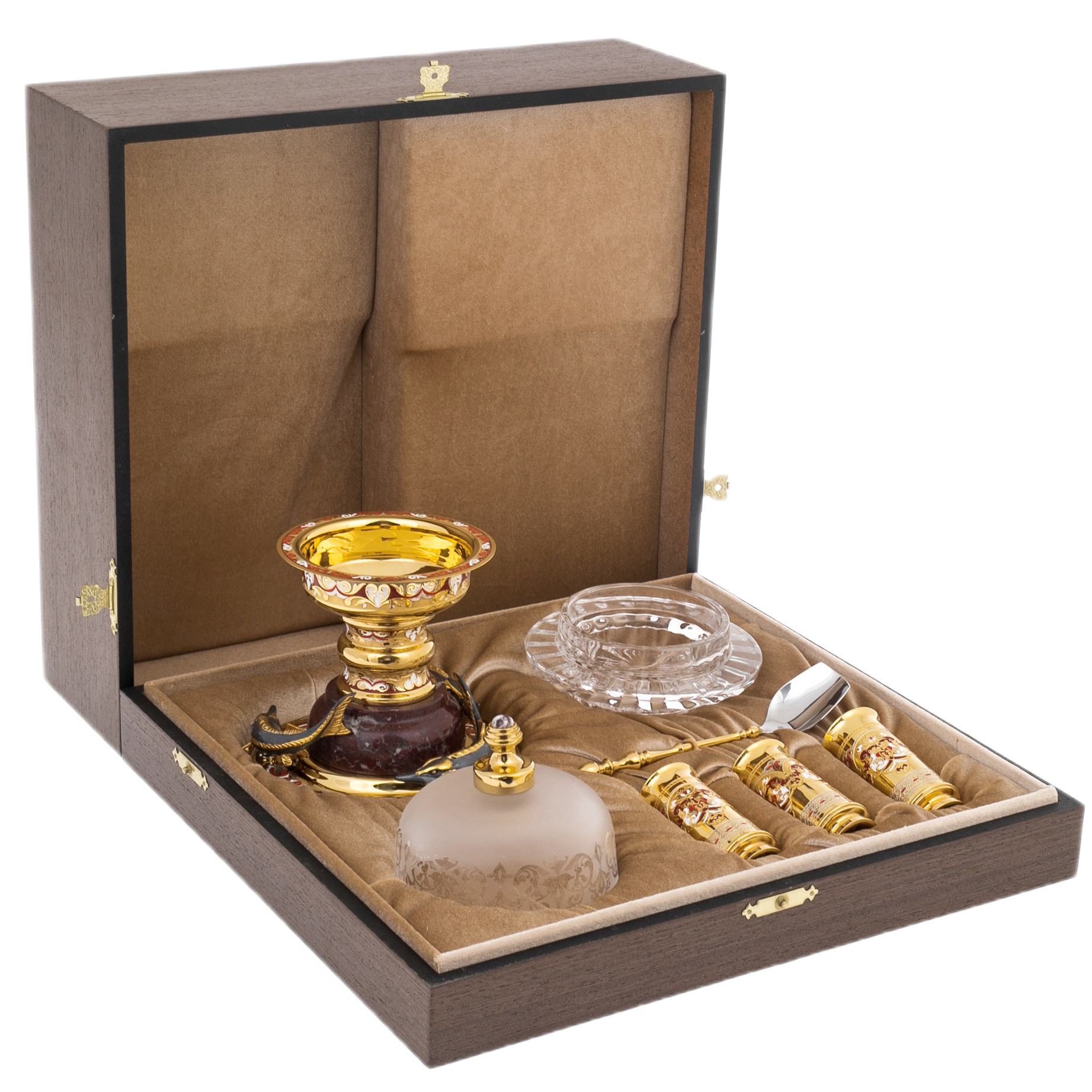 Комплектация: икорница с крышкой, 3 стопки, ложечка.