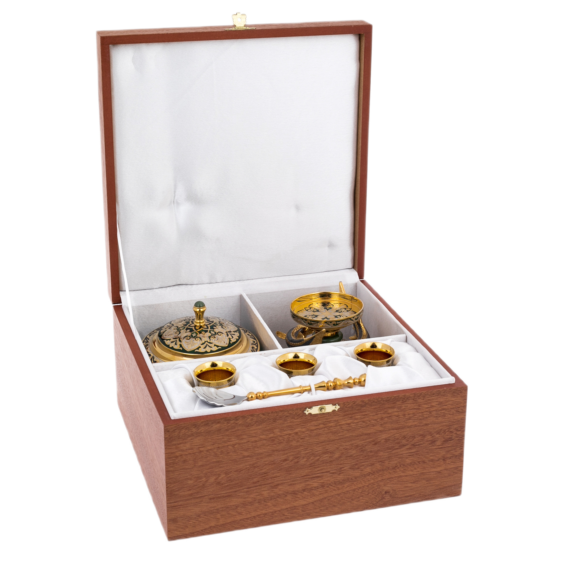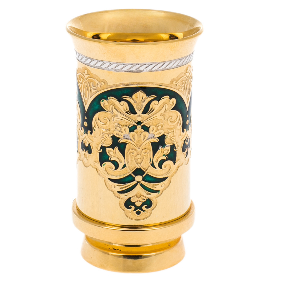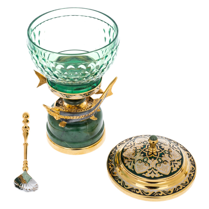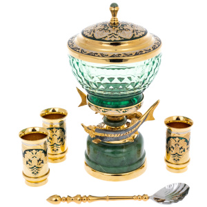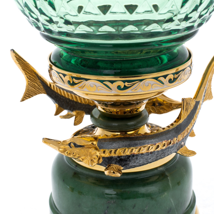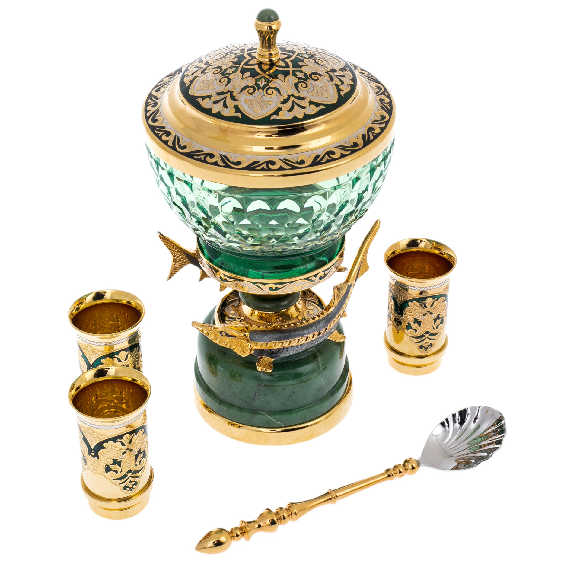 В основании лежит массив нефрита — благородного камня с густым зелёным оттенком и природными прожилками, подчёркнутыми полировкой. На пьедестале закреплена чаша из зелёного хрусталя, огранённая рельефными гранями, играющими светом и усиливающими ощущение чистоты, прохлады, свежести. Крышка и металлическая оправа выполнены в златоустовской традиции: золочёные поверхности несут тонкую орнаментальную гравировку с чёрнением и цветными эмалевыми акцентами, а навершие венчает вставка благородного зелёного камня, поддерживающая общую гамму. Под чашей размещена фигурная рыба — символ главного морского дара, выполненная рельефно, с проработанной фактурой и золотым блеском, задающим теме выразительность. Три стопки отделаны золотистым металлом, украшенным зелёными эмалевыми картушами и растительным узором, внутренняя поверхность сияет ровным зеркалом; ложечка дополнена раковинообразной чашечкой из светлого металла и точёной золочёной рукоятью, удобно ложащейся в руку.