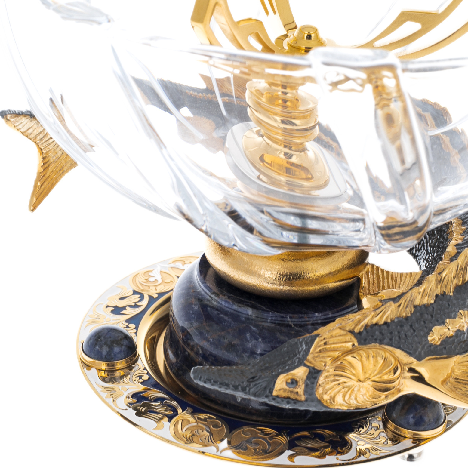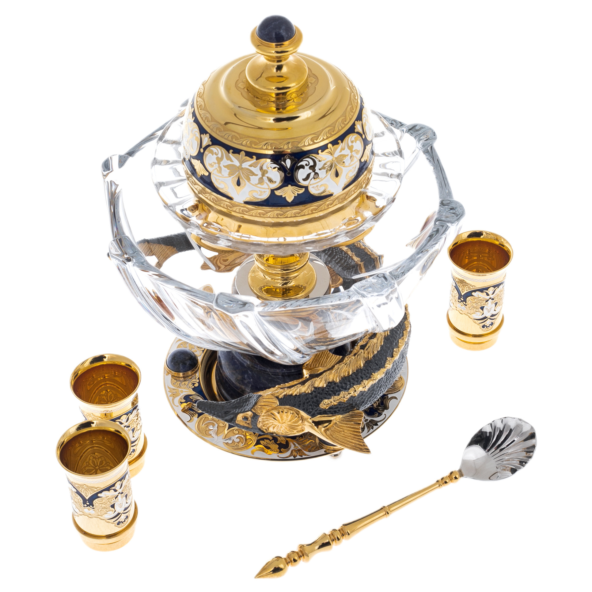 Икорный набор "Посейдон" от мастеров из Златоуста — символ утонченной роскоши, воплощающий силу стихии и богатство океана. Каждая деталь набора словно перенесена из легенд о морском боге, чей царственный образ нашел отражение в блеске золота, прохладной глубине содалита и изысканных изгибах хрусталя.
