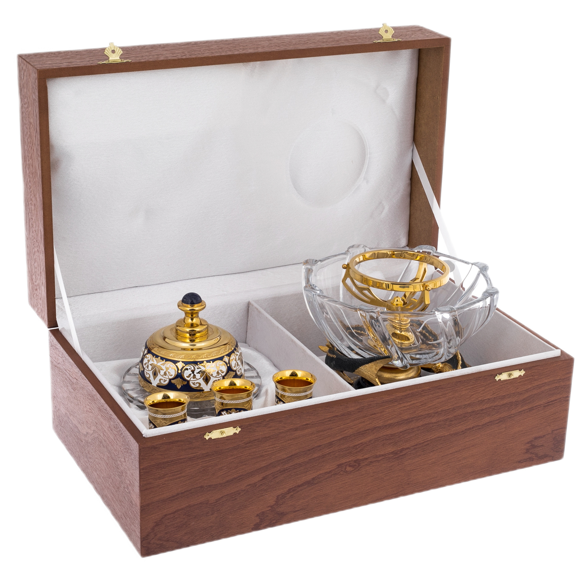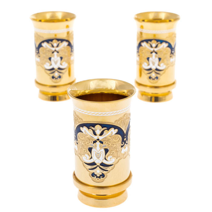 Набор дополнен тремя изящными стопками, украшенными филигранным орнаментом и золотыми акцентами. Эти сосуды будто заключают в себе дыхание веков, обращаясь к древним мастерам, чей труд и талант оживают в каждой линии. Они созданы, чтобы подчеркнуть важность момента, сделать его особенным, наделяя каждого, кто прикасается к ним, чувством исключительности и статуса.