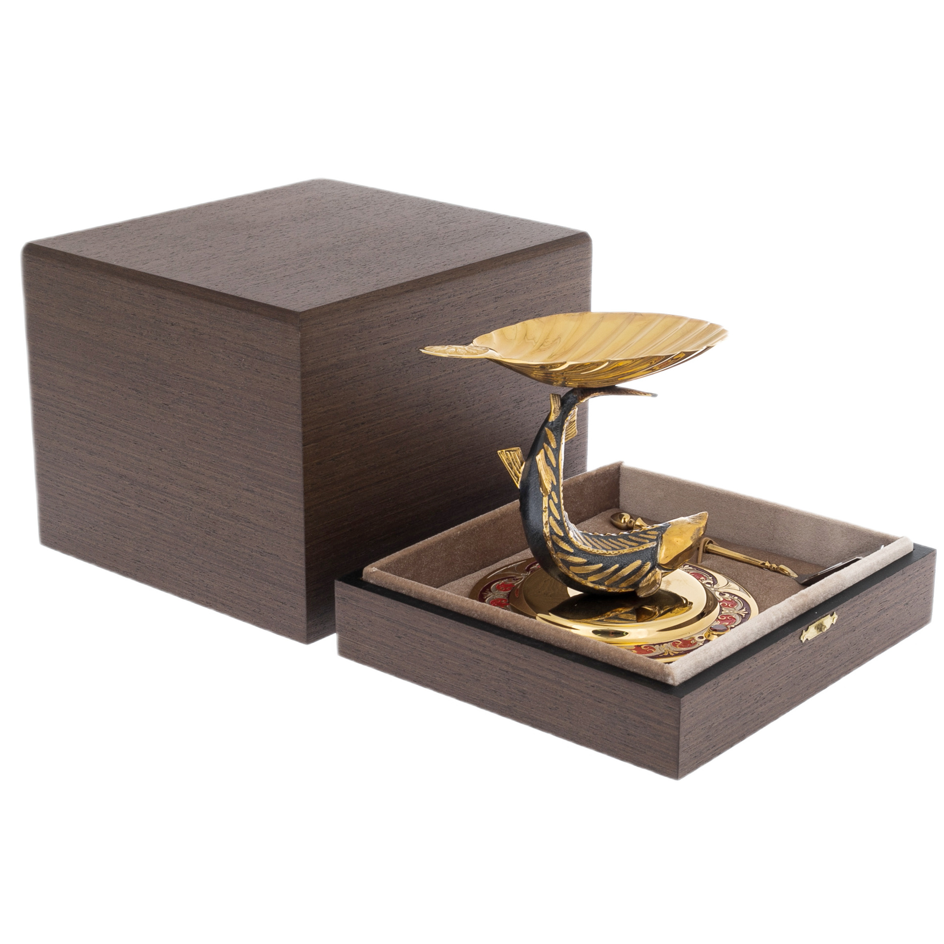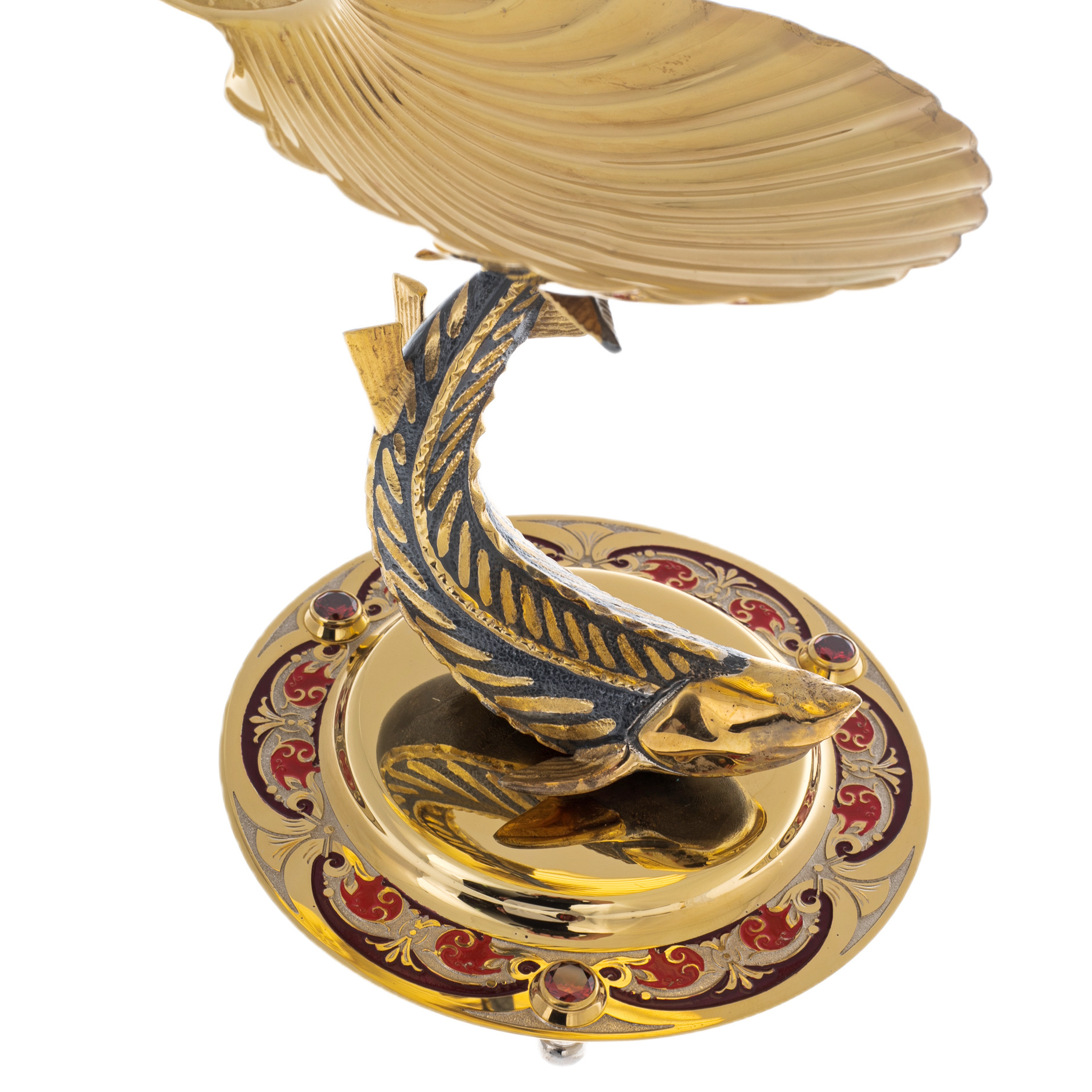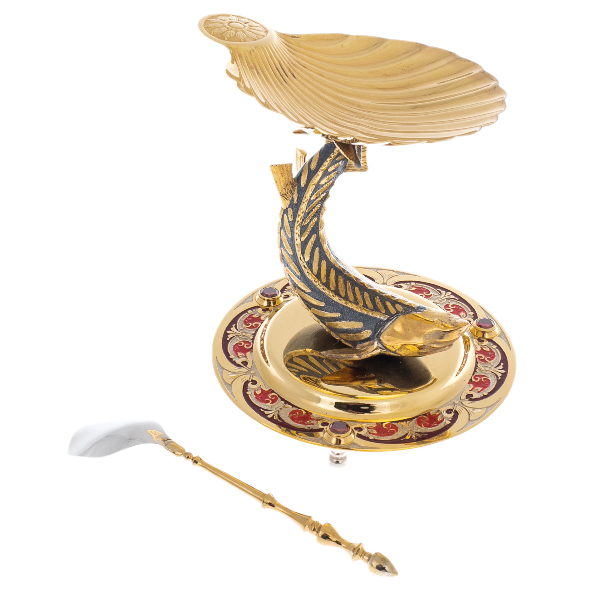 Изящная форма икорницы "Белуга", украшенной тонкими эмалями и золотыми узорами, привлекает внимание своими элегантностью и детальной проработкой. Полированная поверхность, покрытая рельефными рисунками, создаёт ощущение роскоши и высшего качества. Это не просто посуда — это произведение искусства, которое превращает каждое застолье в настоящий ритуал, подчеркивающий статус и вкус его владельца.