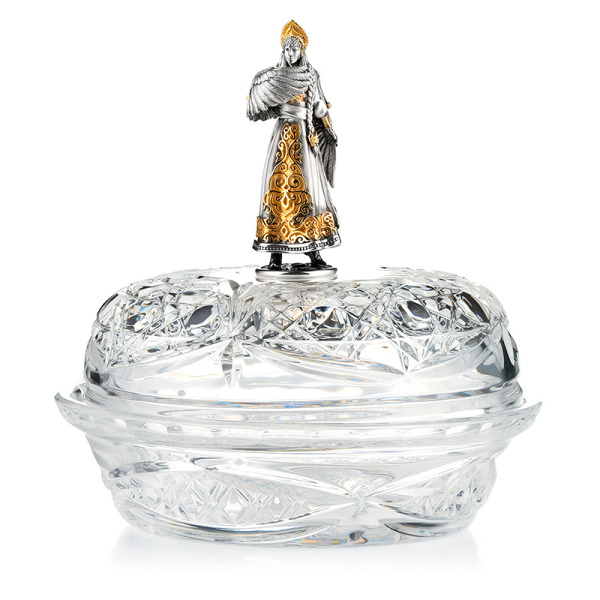 Купол икорницы, выполненный из серебра и украшенный яркой Ростовской финифтью, переливается всеми оттенками голубого и золотого, напоминая небесную гладь, украшенную цветущим садом. Ручная роспись по эмали передает сложные узоры, где каждый завиток и лепесток раскрывают богатство русского орнамента. Вставки с миниатюрами ручной работы добавляют изделию еще больше утонченности и культурной глубины, словно приглашая рассмотреть каждую деталь с восхищением.