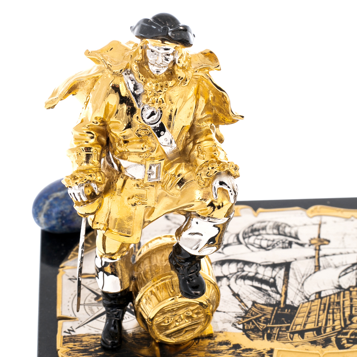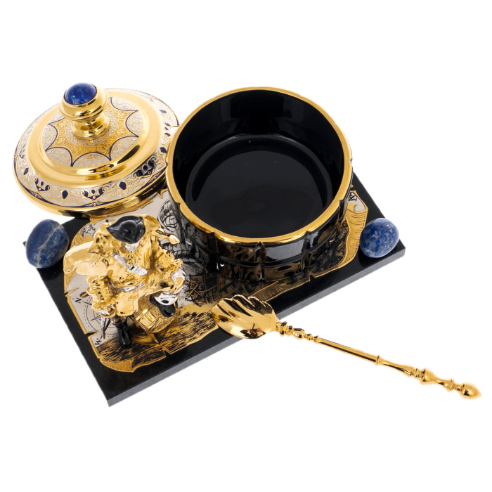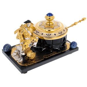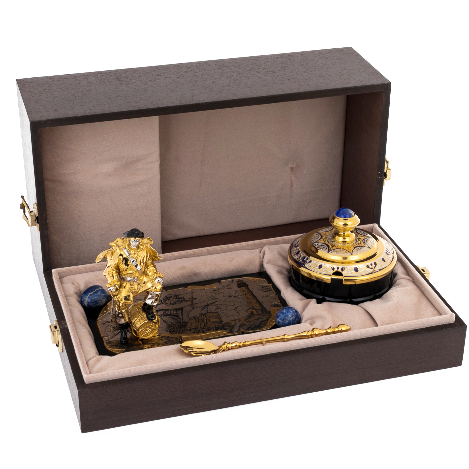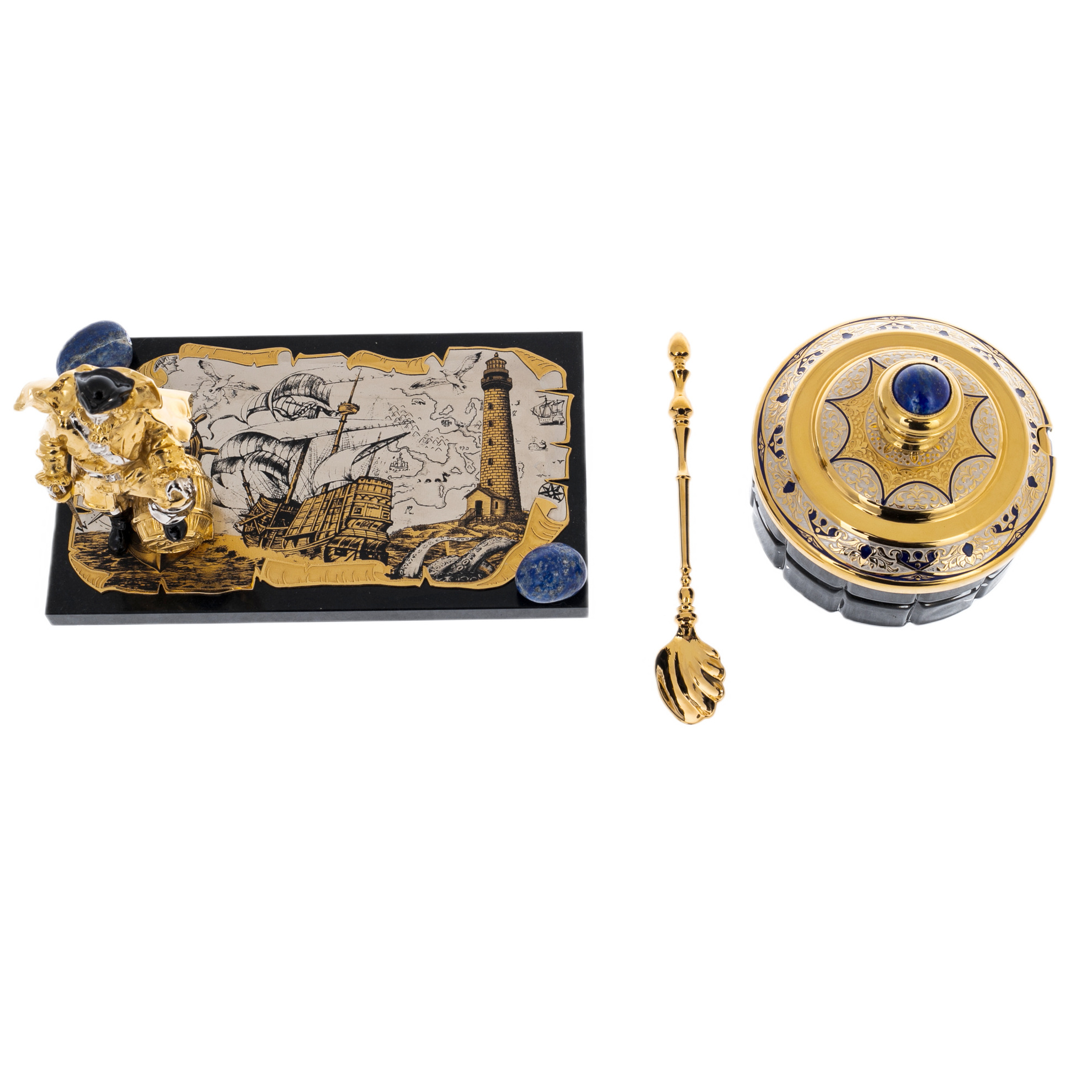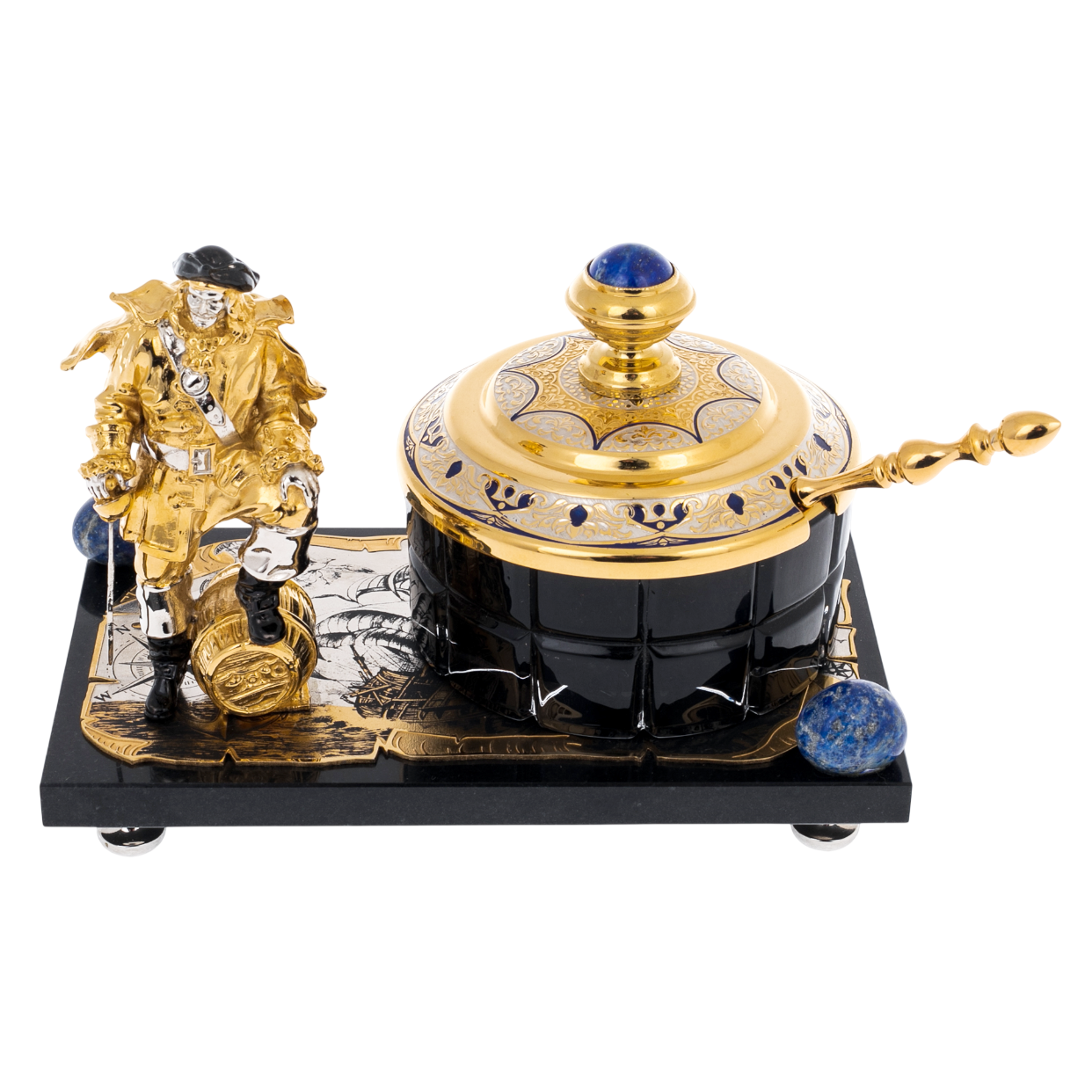 Икорница на подставке "Пиратская" с лазуритом — камерный предмет для подачи деликатесов, превращающий паузу за столом в маленькую церемонию. Композиция выстроена на массивном основании из полированного темного камня, уверенно удерживающем все элементы и подчеркивающем контраст металла и минералов. Справа размещена чаша с гранеными стенками, собранная из темного камня и увенчанная крышкой с золоченым навершием; рядом — ложечка, рассчитанная на точную подачу икры без лишнего прикосновения. Слева — фигурка пирата, выполненная как миниатюрная скульптура: в позе, задающей настроение, с узнаваемыми деталями костюма и атрибутами морской удачи. Вещь адресована тем, кто ценит не только редкость продукта, но и эстетику подачи — владельцам кабинетов, частных коллекций, яхтенных интерьеров, тем, кто привык окружать себя предметами с характером.