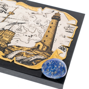 Златоустовская школа видна в работе с металлом: золочение, тонкая гравировка, ювелирная посадка вставок, рельеф, выведенный до четкости на свету. На крышке и по декоративному поясу читаются орнаментальные линии, задающие ритм и создающие эффект глубины за счет сочетания полированных и матовых фактур. Лазуритные акценты, собранные в виде выразительных "капель" морской синевы, поддерживают тему путешествия и перекликаются с холодным блеском отдельных деталей отделки. Основание украшено сюжетной пластиной — графикой морской карты с кораблем и маяком, выполненной в контрастной технике, позволяющей рисунку выглядеть как гравюра из старинного атласа.