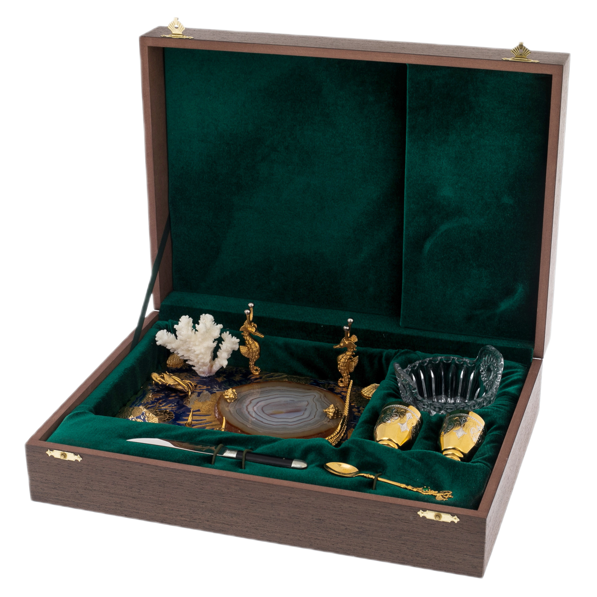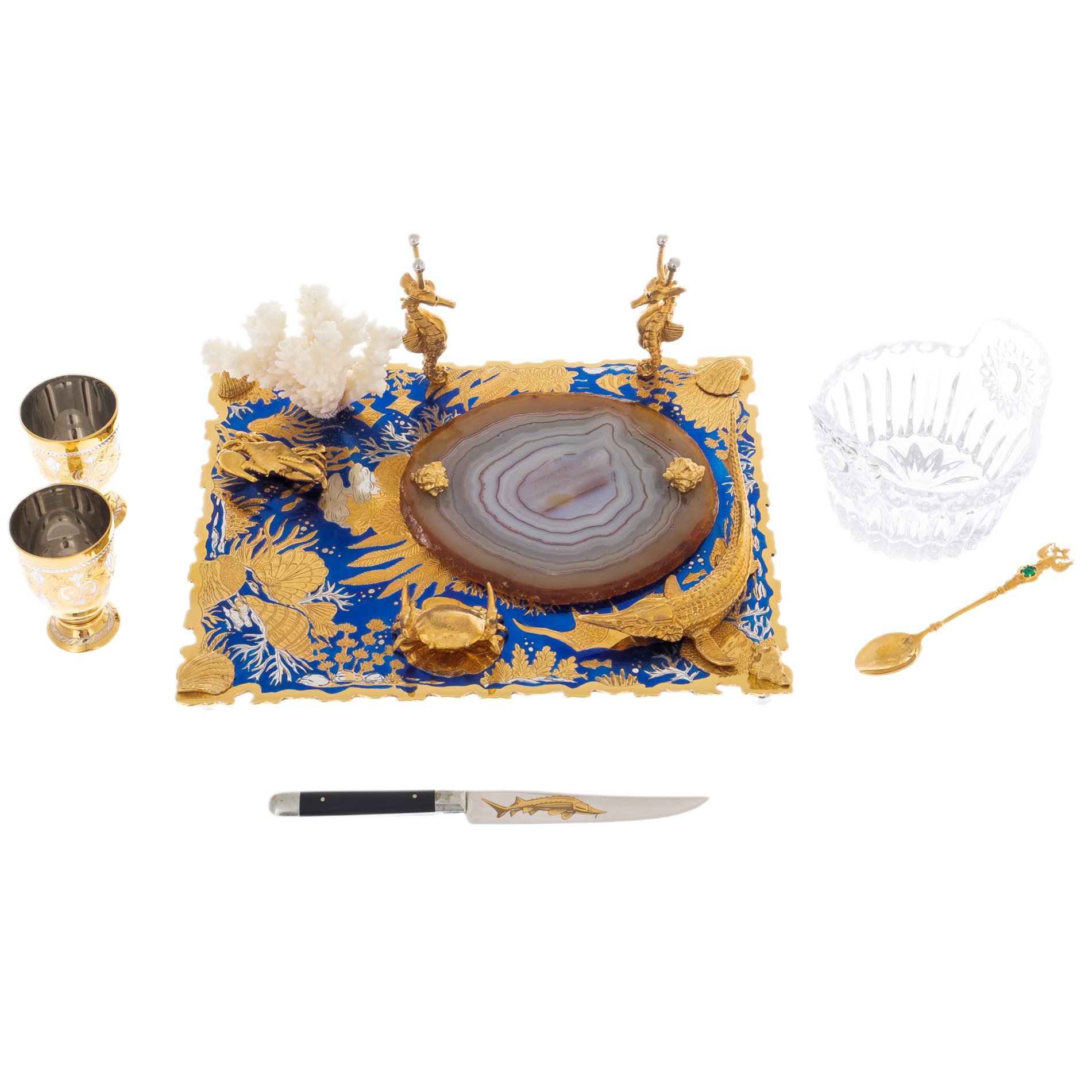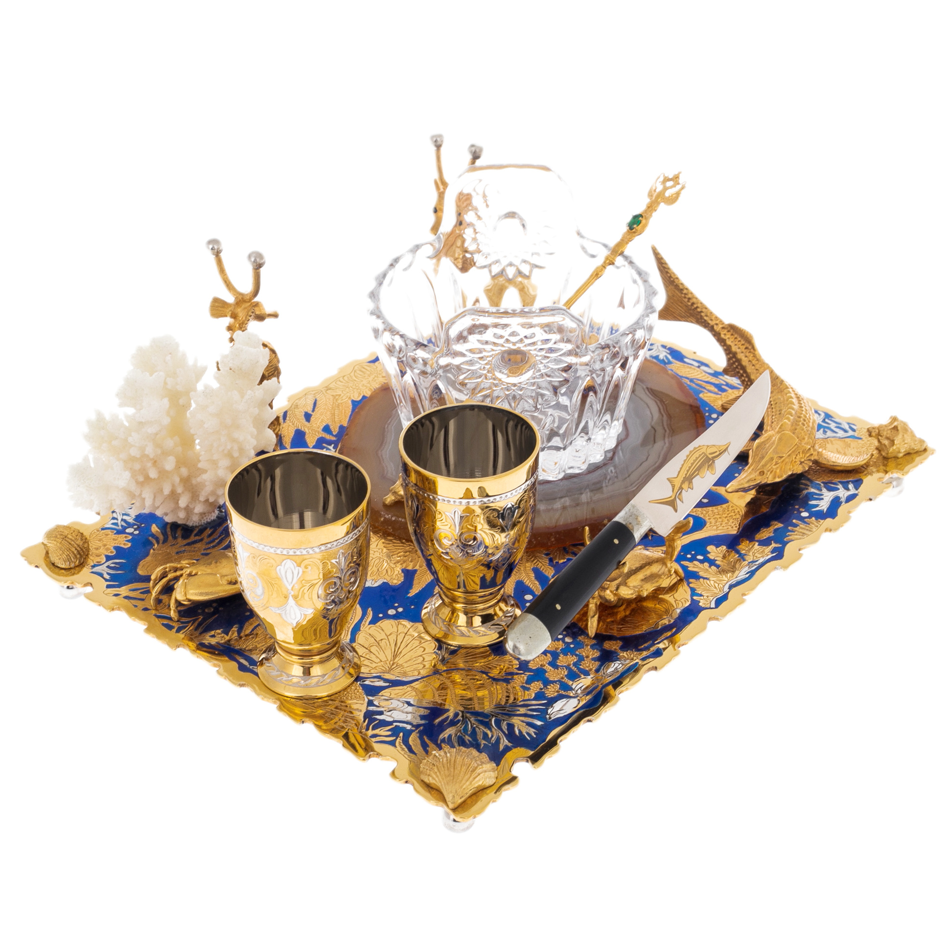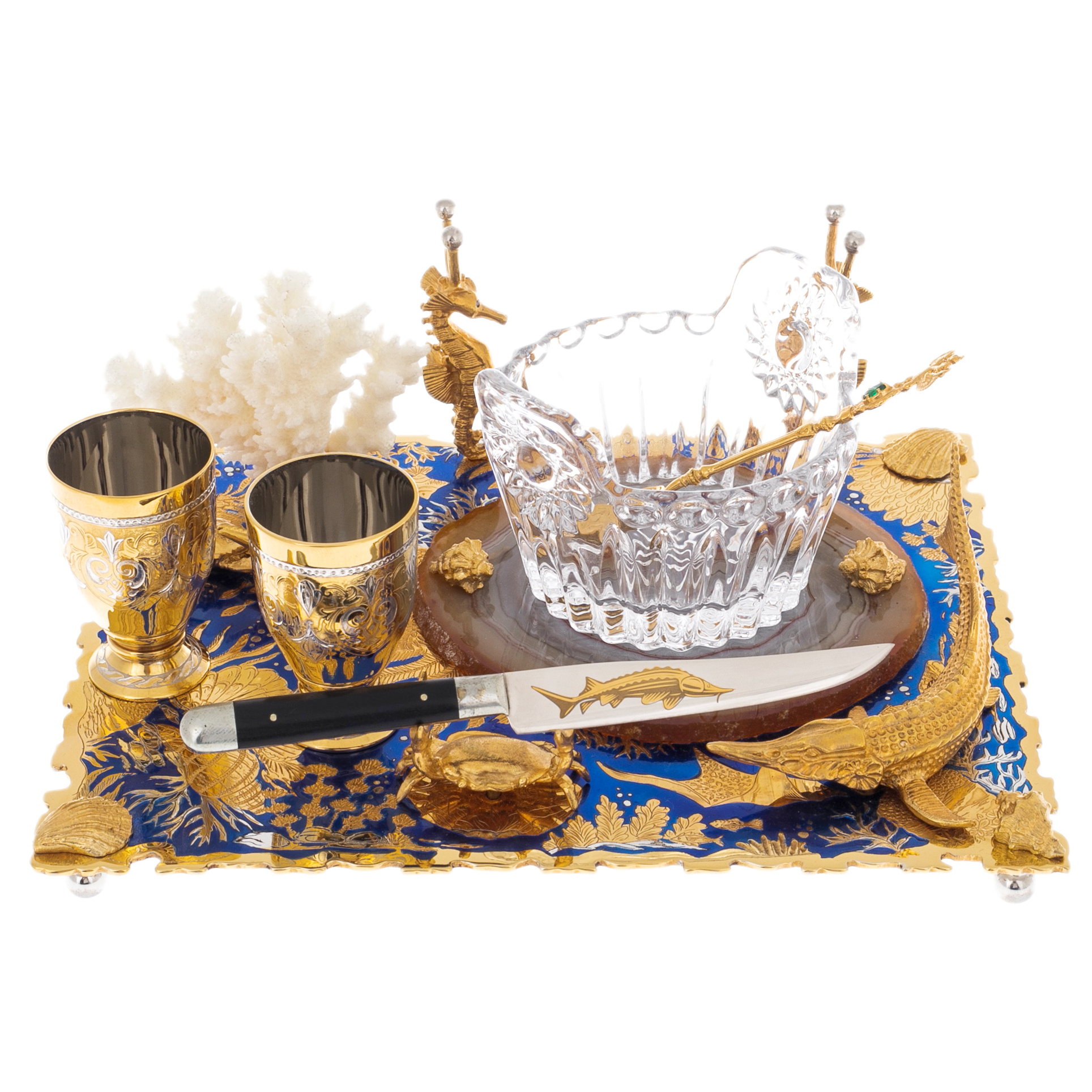 Набор икорный на агате "Морской" с кораллом, на 2 персоны, Златоуст