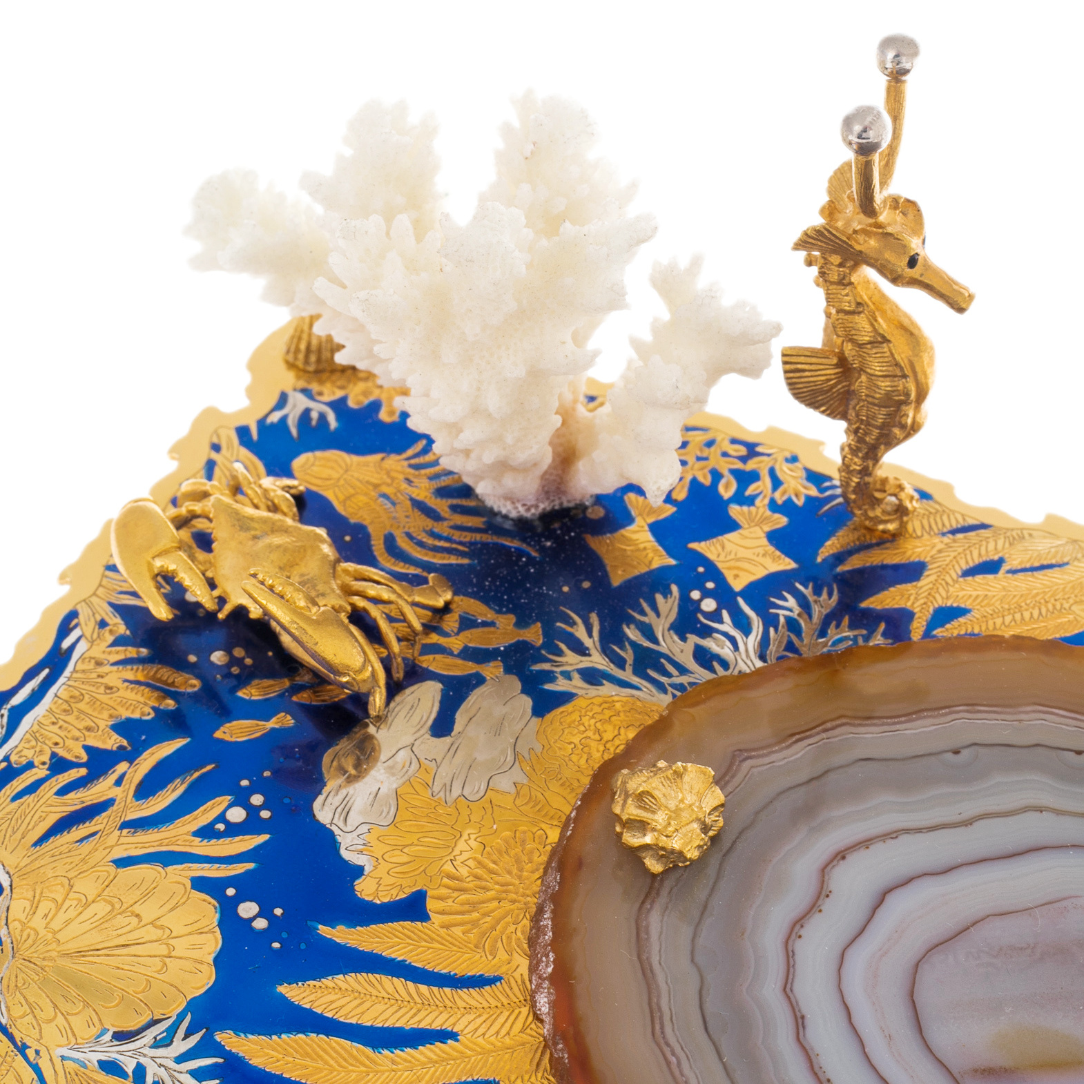 Материалы: латунь, никель, хрусталь, агат, коралл, эмали.