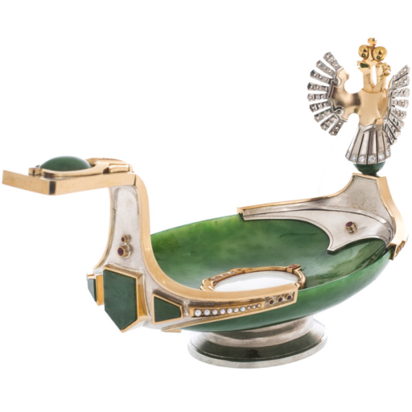 Ковш жалованный — это не просто предмет сервировки стола, это подлинное произведение искусства, достойное королевских интерьеров и высшего общества. Это истинное воплощение роскоши, изысканного стиля и высочайшего мастерства. Каждый нюанс этого ковша — от блеска бриллиантов до теплого сияния золота, от благородства серебра до глубины нефрита — символизирует богатство, процветание и долголетие.