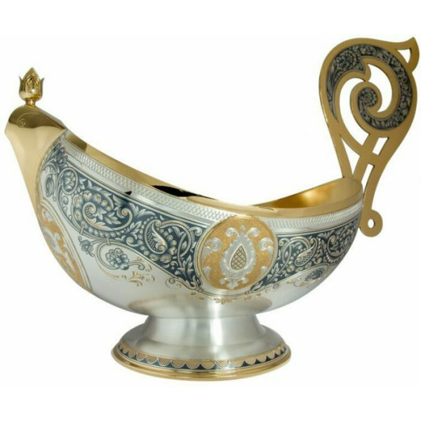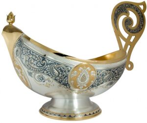 Ковш из серебра 925 пробы изготовлен мастерами великоустюгского завода «Северная чернь». Сплавы, содержащиеся в пробе, придают изделиям прочность и защиту от механических повреждений.