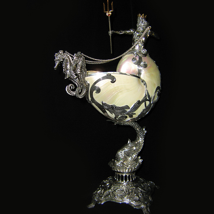 Представляем вам "Алфей", оригинальный кубок, который сочетает в себе благородство серебра 925 пробы с естественной красотой морской раковины Nautilus, украшенный вставками из полудрагоценных камней и изысканной позолотой. Этот кубок является произведением искусства, способным добавить изысканности и элегантности любому собранию или интерьеру.