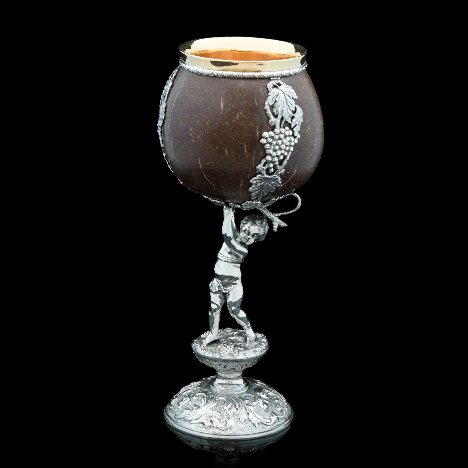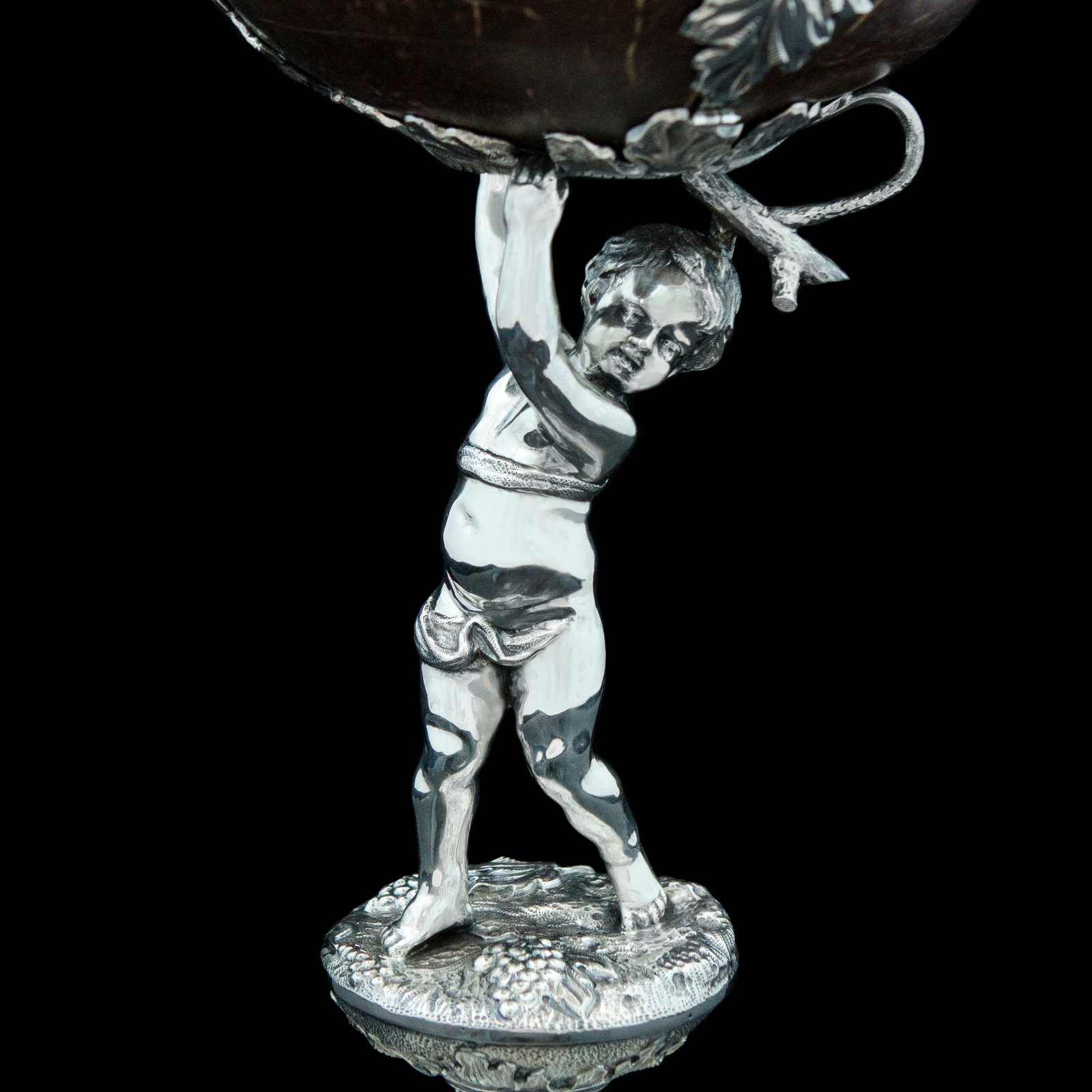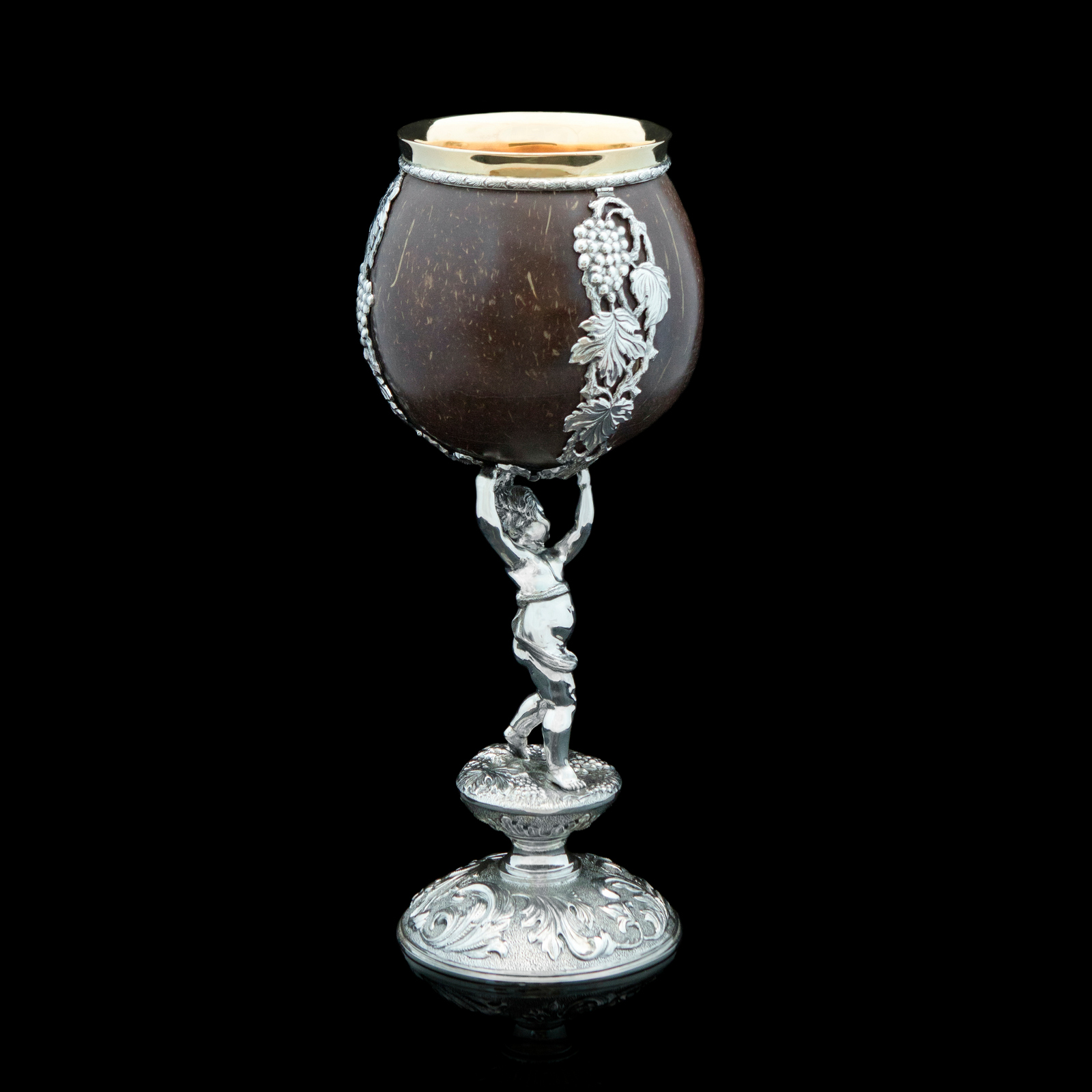 Визуальное великолепие кубка подчеркивается фигурой Диониса, древнегреческого бога виноделия и изобилия, который поддерживает шар из кокоса, символизирующего земное плодородие и природную красоту. Образ Диониса, вылепленный из серебра, детализирован до мельчайших черт, что свидетельствует о высоком уровне мастерства создателя. Богато украшенная основа кубка усеяна рельефами листьев винограда и плодов, что ещё более усиливает ассоциации с античными традициями и культурой празднования.