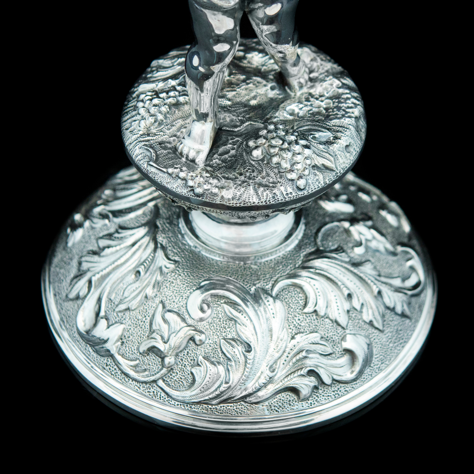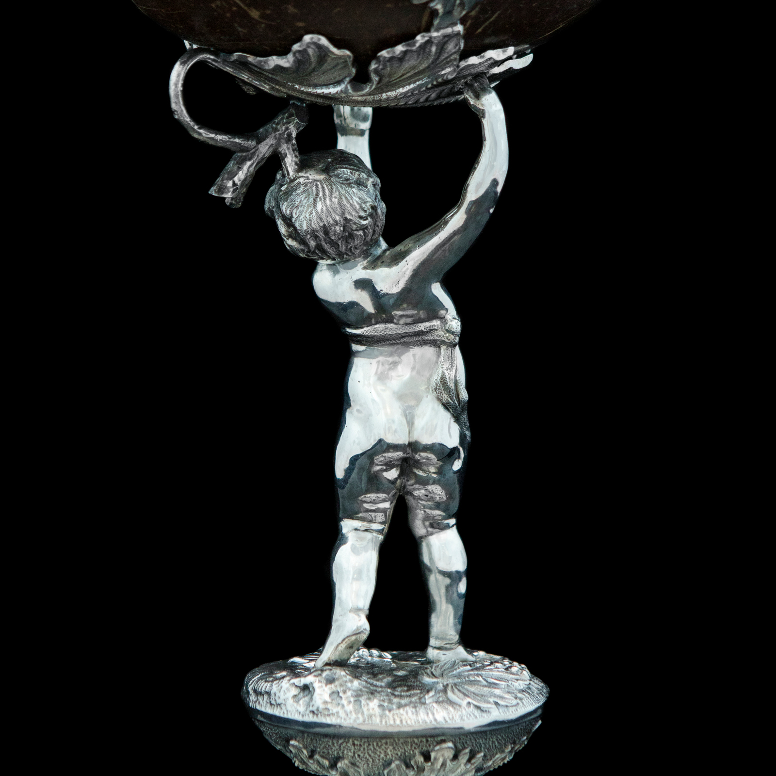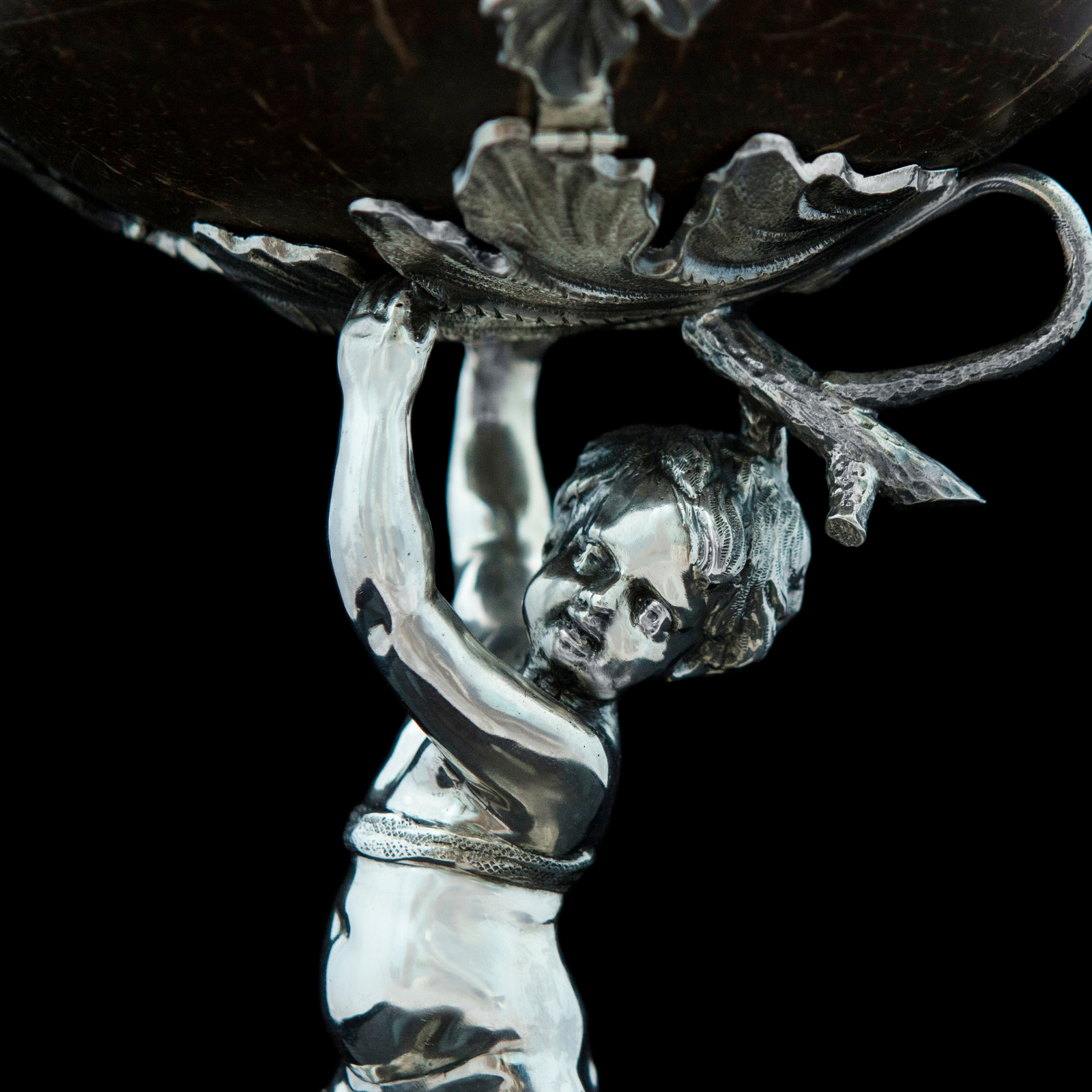 Визуальное великолепие кубка подчеркивается фигурой Диониса, древнегреческого бога виноделия и изобилия, который поддерживает шар из кокоса, символизирующего земное плодородие и природную красоту. Образ Диониса, вылепленный из серебра, детализирован до мельчайших черт, что свидетельствует о высоком уровне мастерства создателя. Богато украшенная основа кубка усеяна рельефами листьев винограда и плодов, что ещё более усиливает ассоциации с античными традициями и культурой празднования.