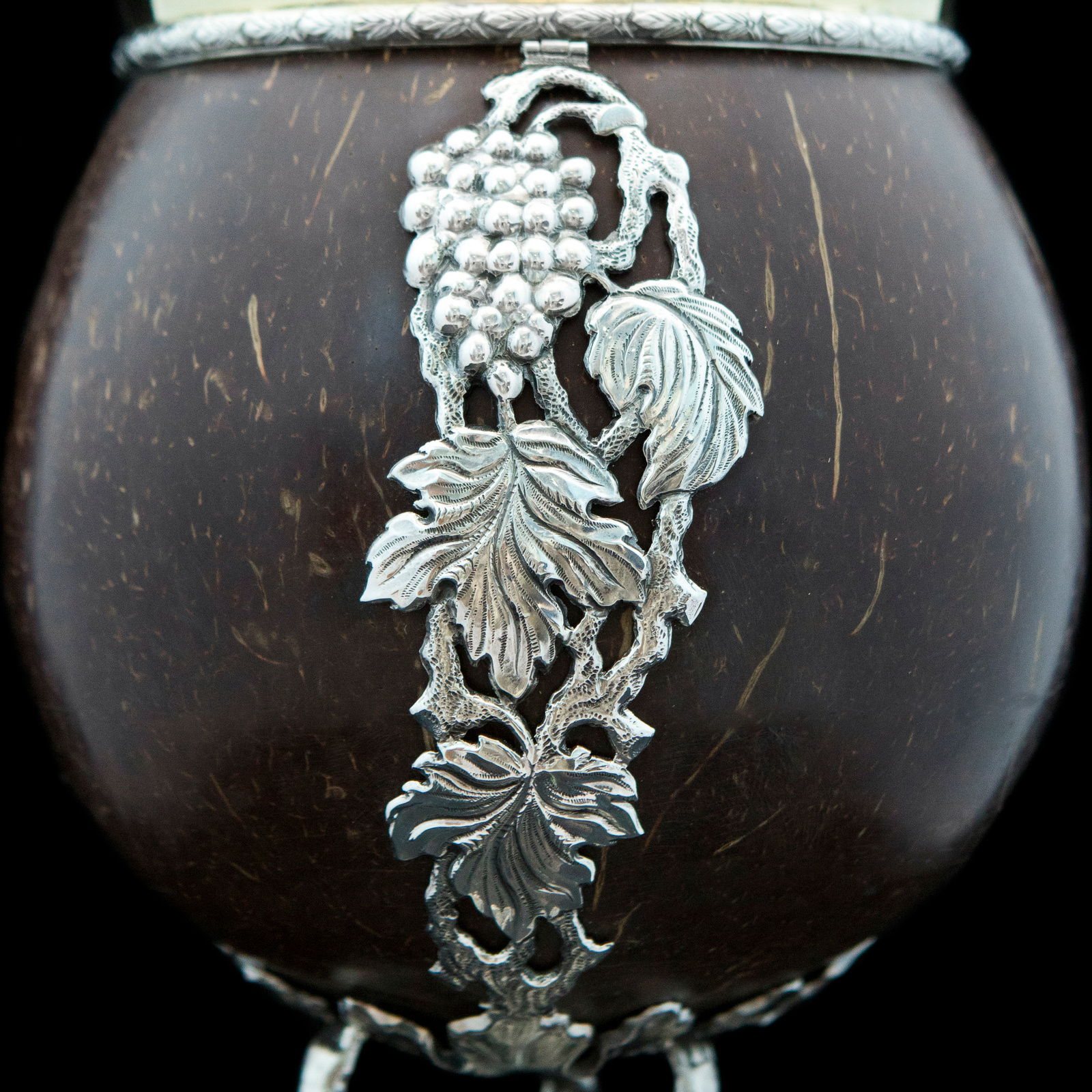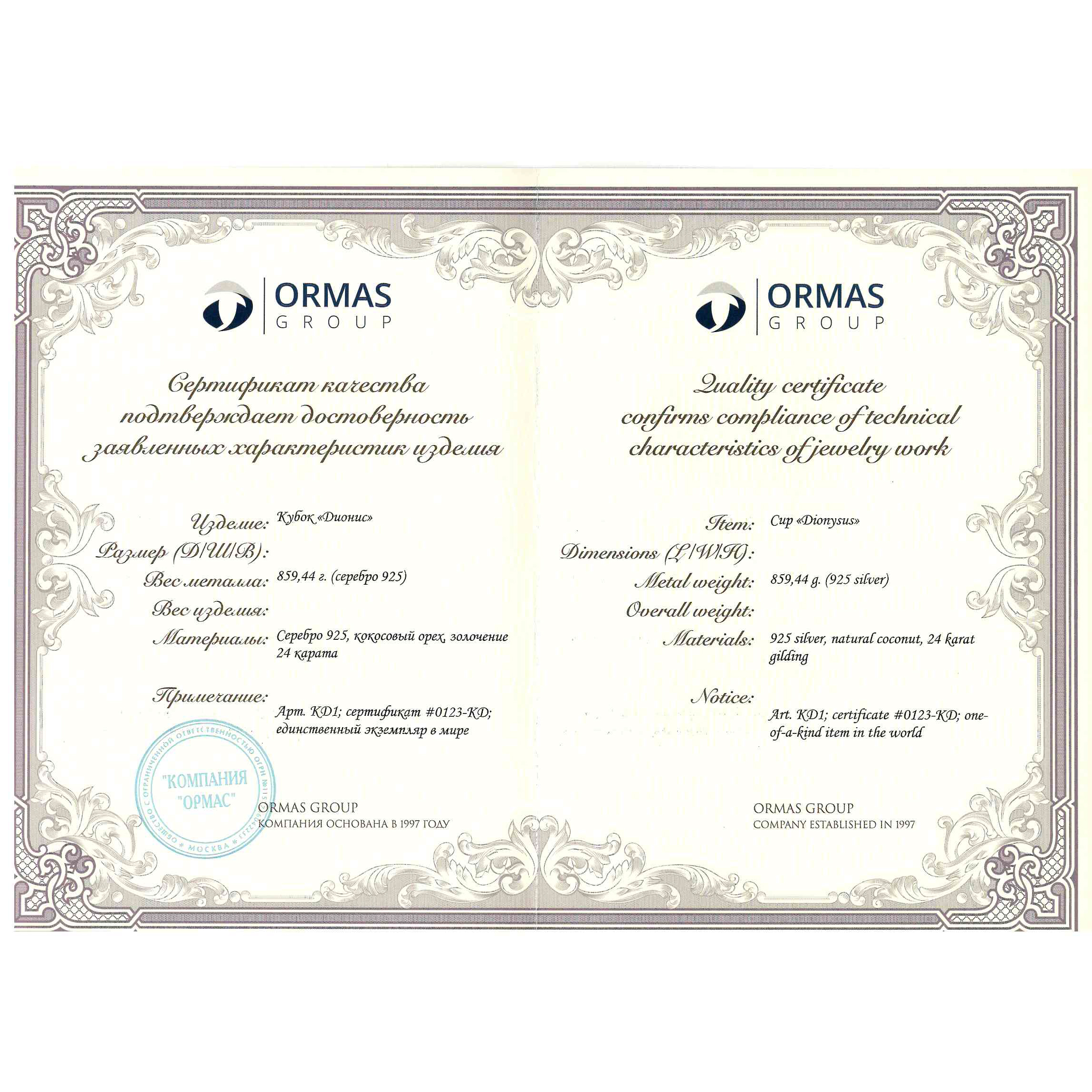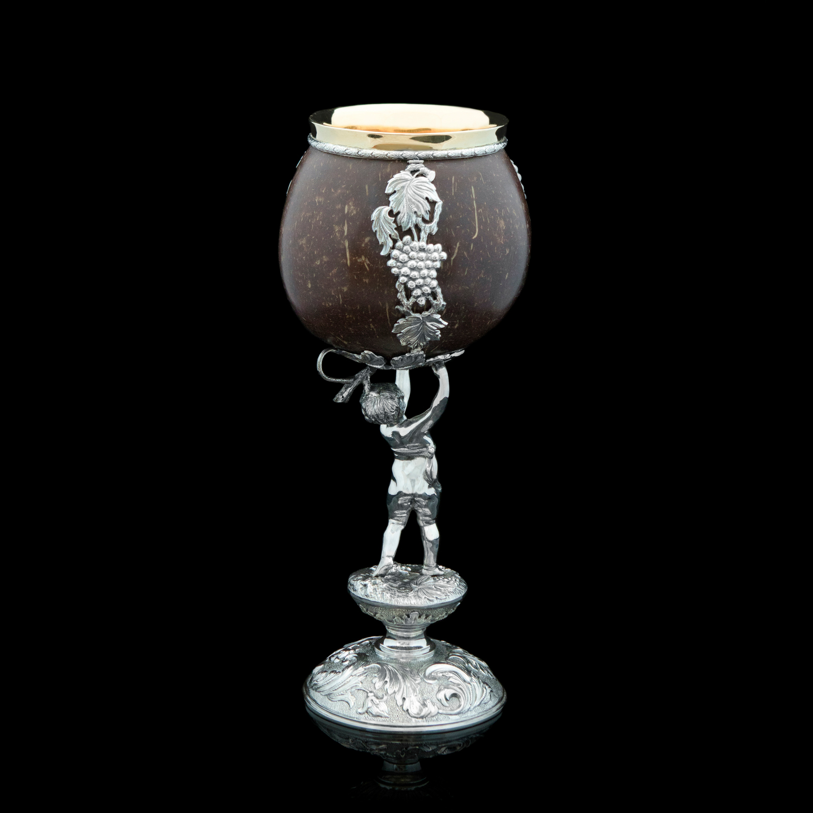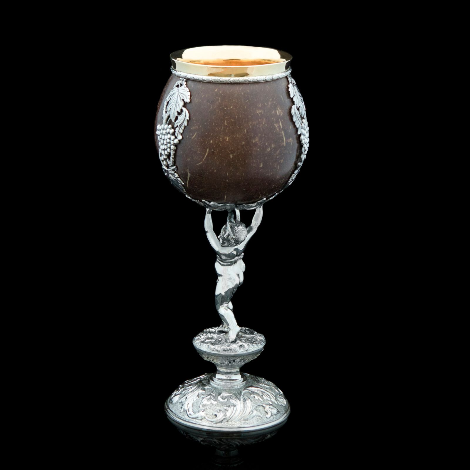 Уникальный кубок "Дионис" является воплощением роскоши и эксклюзивности, объединяя в себе благородство драгоценных металлов и экзотичность натурального материала. Кубок выполнен в редкой технике, которая ассоциируется с мастерством ювелирного дома Фаберже, искусно сочетая чистое серебро 925 пробы с шлифованным кокосом. Элементы золочения 24 каратами придают изделию особенную ценность и элегантность.