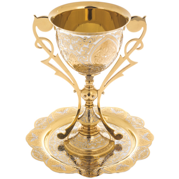 Тончайшая золотая вуаль 999 пробы покрывает выточенную и отполированную вручную латунную конструкцию. Невероятной красоты узоры на чаше сначала отрисованы кистью, а затем выгравированы иглой и резцом. После травления витиеватые вензеля обрели ещё большую выразительность, стали визуально объёмнее. Ручка кубка выкована и изогнута также вручную. В основании кубка и на чаше можно лицезреть тёмные, будто бархатные, фрагменты. Это чернение по серебру, очень трудоёмкая и деликатная технология. Подножие инкрустировано фианитами, добавляющими изделию изысканности. Кубок дополнен золочёным подносом-подставкой.