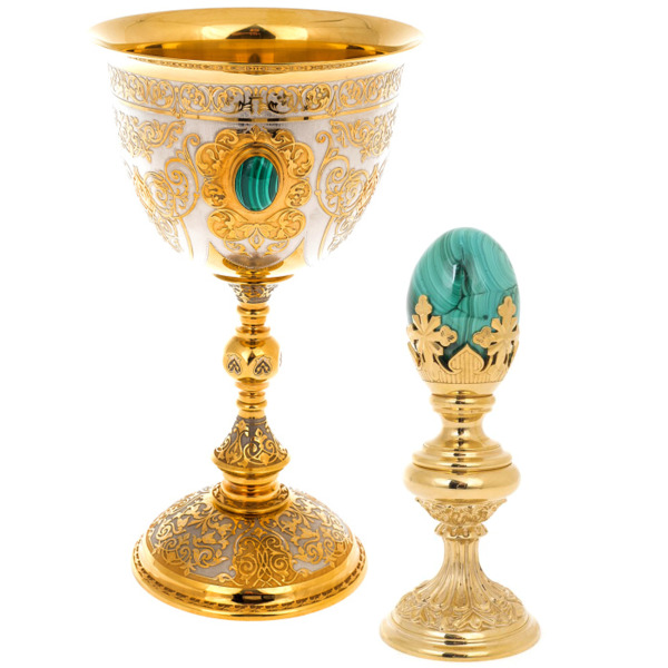 Подарочный набор, сочетающий кубок «Всевластие» с малахитом и пасхальное яйцо «Малахитовое», — это изысканное воплощение силы, веры и благородства. В нём соединены древние символы власти и духовности, обрамлённые в материалы, веками считавшиеся привилегией императоров: золото, малахит и гравированный металл.
