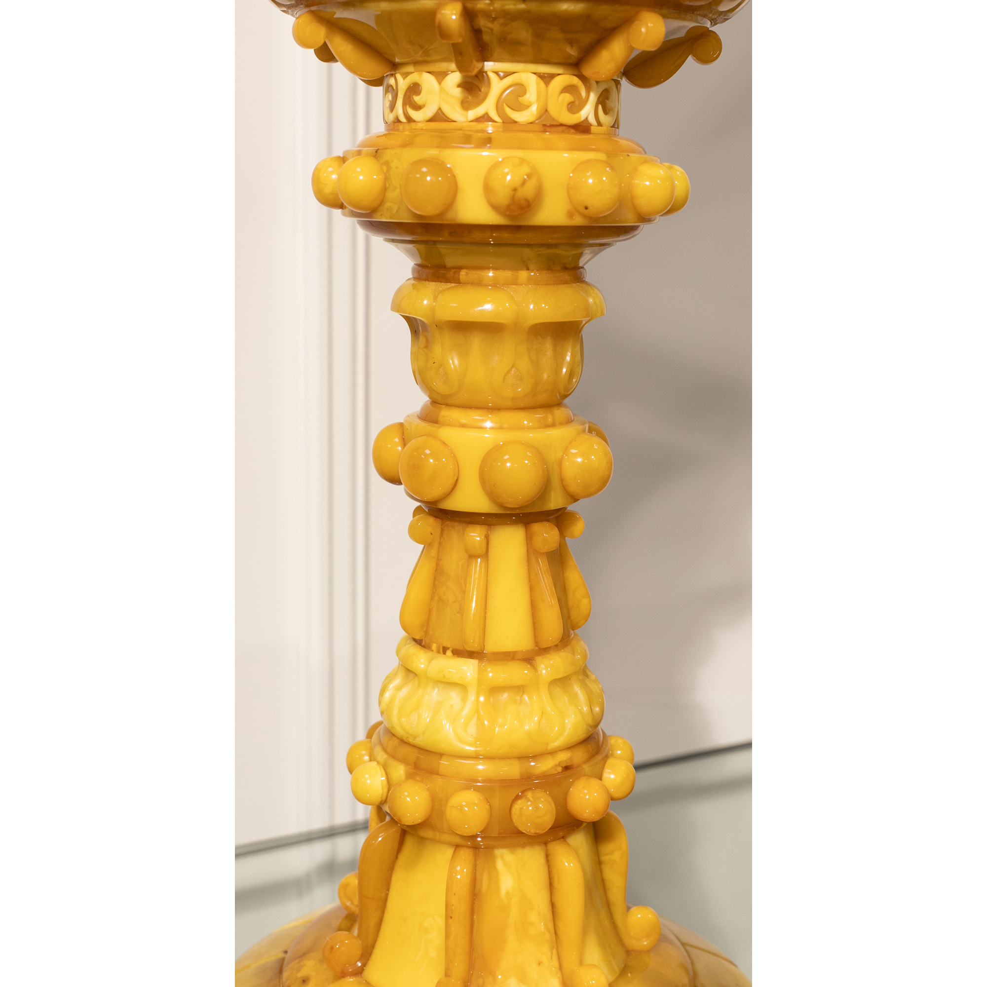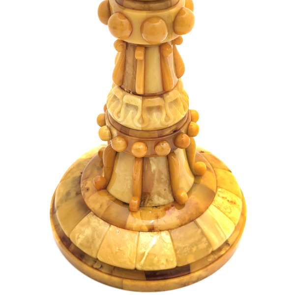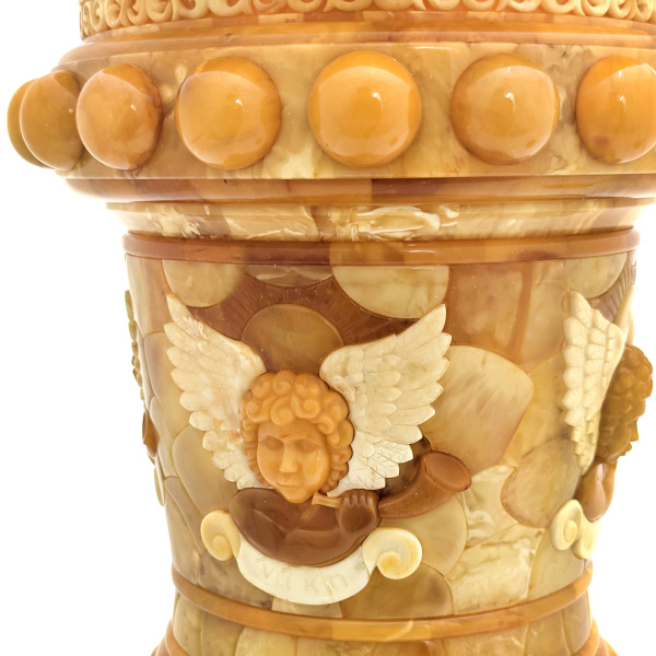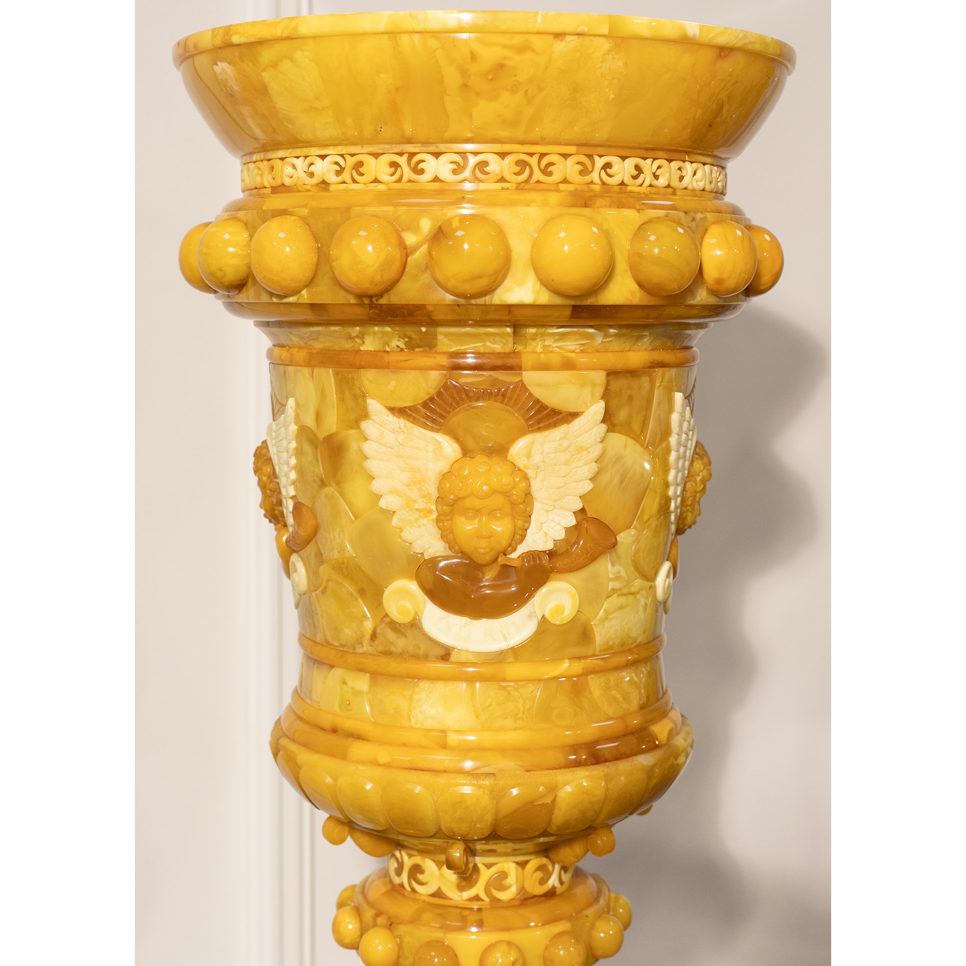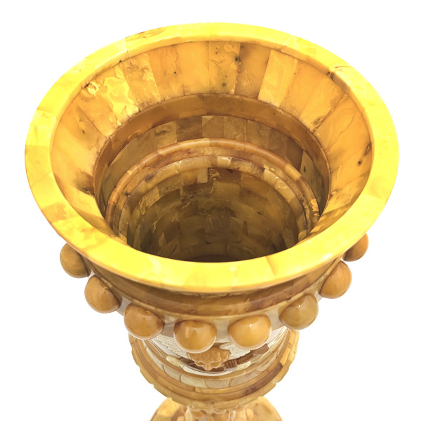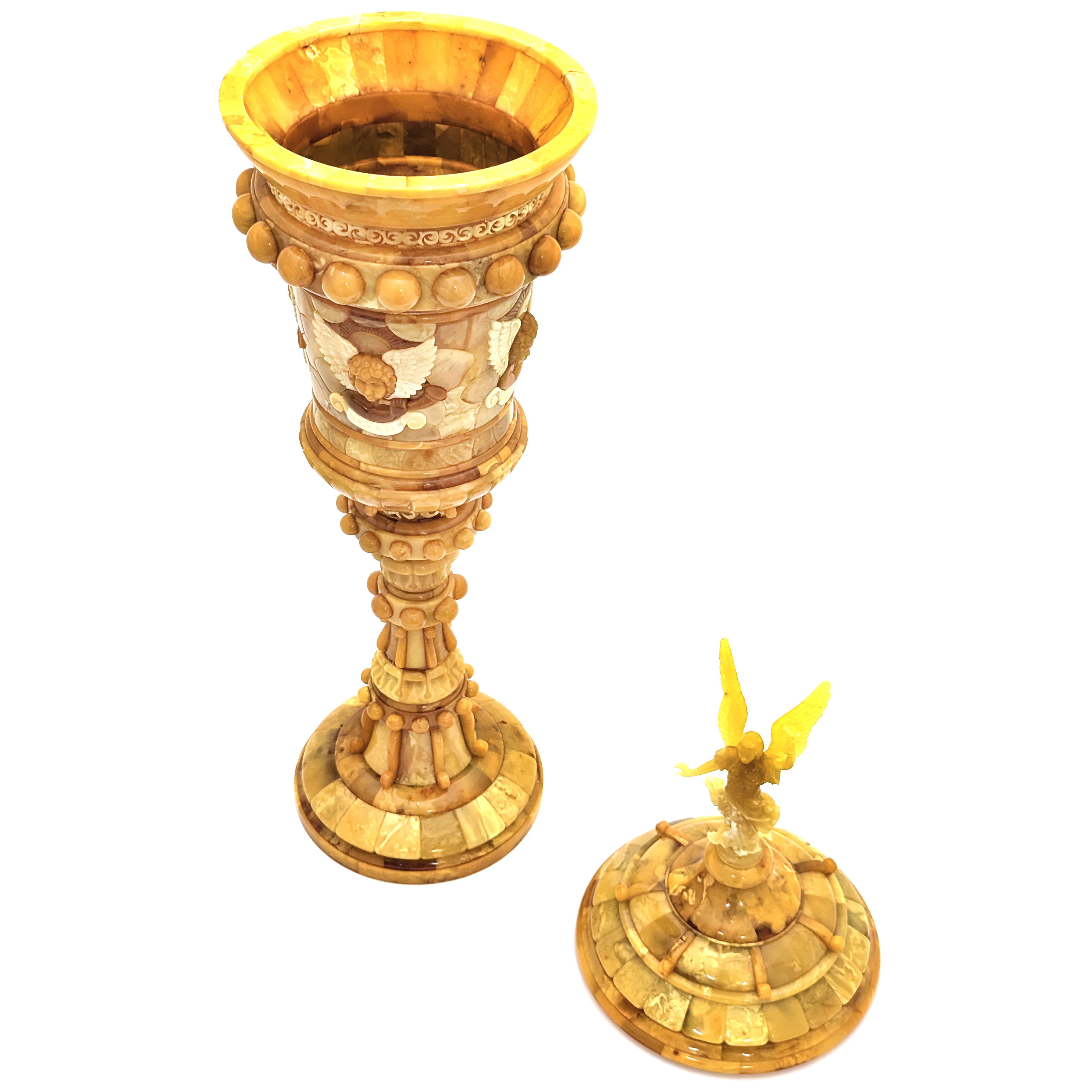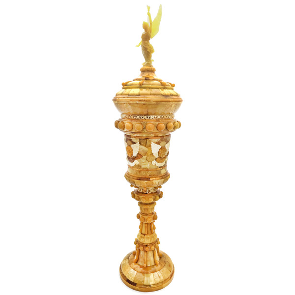 Янтарь — не просто материал, а застывшее солнце, вековое дыхание Балтики, хранящее шёпот доисторических лесов. Он служит здесь не отделкой, а языком — языком света, тепла, истины. В зависимости от угла зрения и освещения кубок меняет своё настроение: от торжественного до умиротворённого, от сияющего до задумчивого — словно живой организм, отражающий внутреннее состояние наблюдателя.