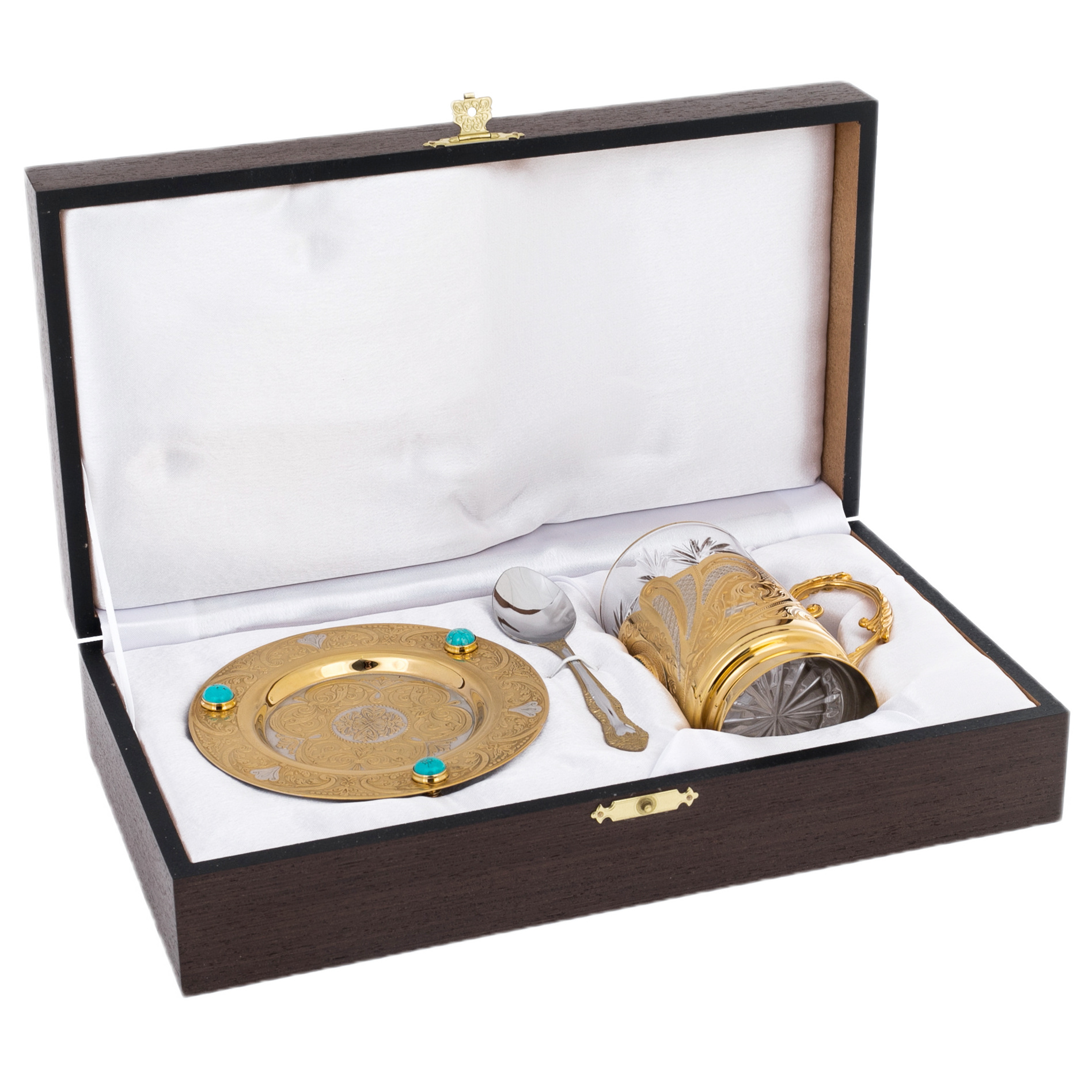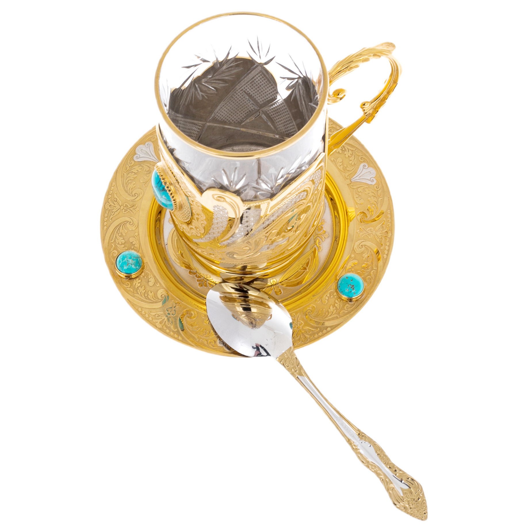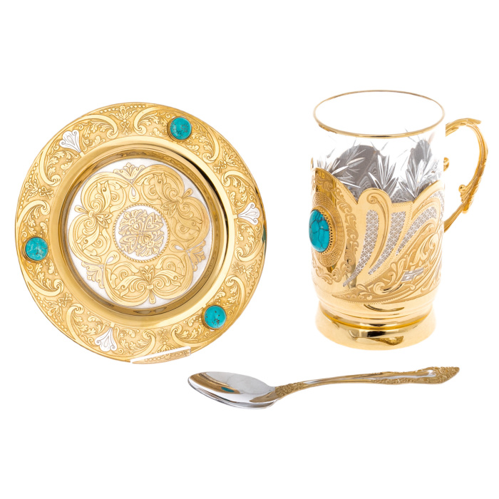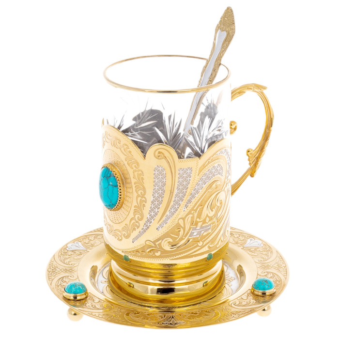 Чайная пара "Бирюза" на 1 персону, Златоуст — изысканный ансамбль для личного чаепития, объединяющий прозрачный стакан с тонкой золотистой каймой, декоративный подстаканник с филигранным рисунком и вставкой бирюзового оттенка, блюдце из металла с рельефным орнаментом и тремя бирюзовыми акцентами по окружности, а также ложечку с золочёным узором на черенке. В основе композиции лежит сочетание холодной чистоты стекла и тёплого сияния металла: чашка воспринимается лёгкой и воздушной, тогда как оправа и блюдце задают предмету вес, статус и коллекционную выразительность.