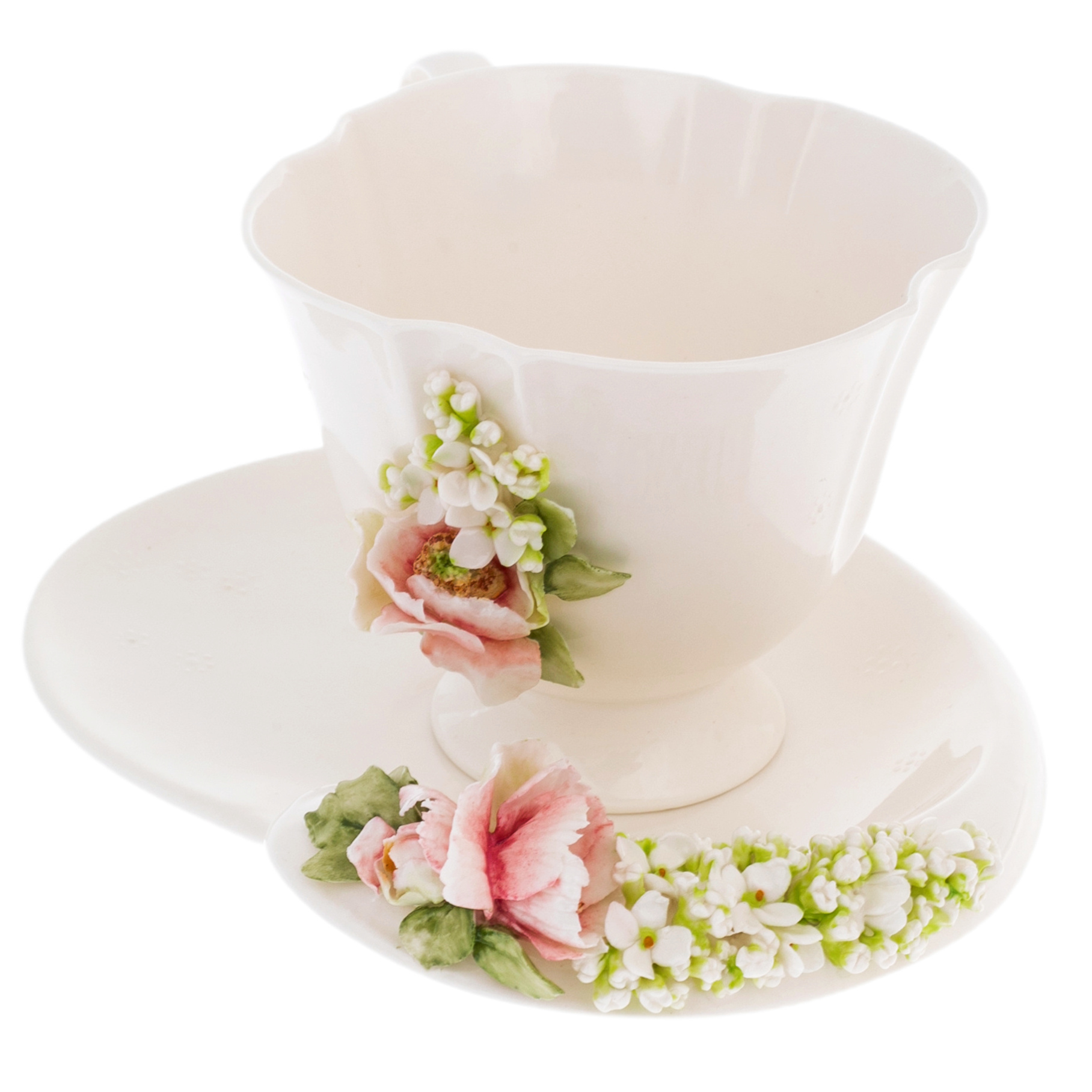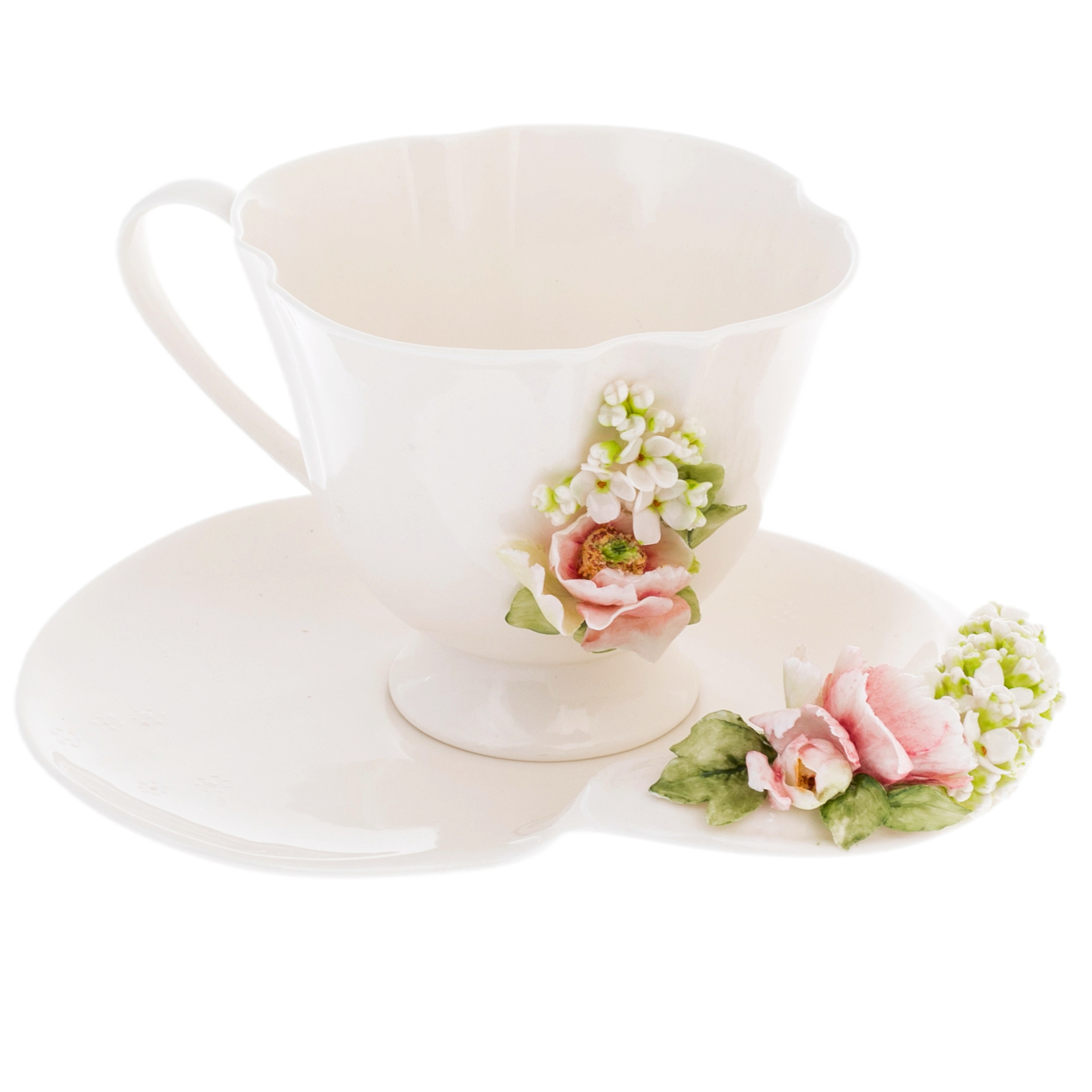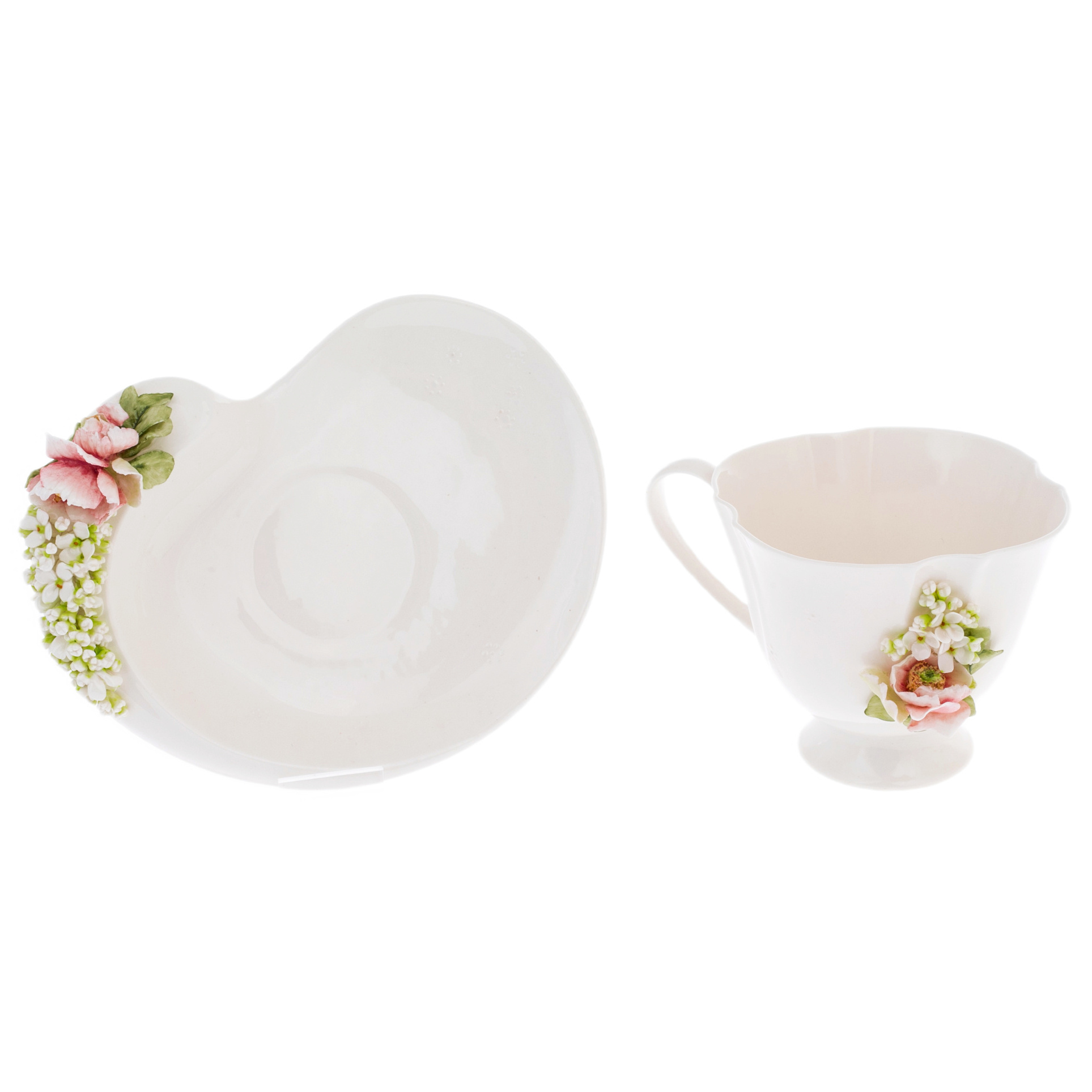 Чашка с изысканным изгибом и гармоничной формой, создающая ощущение лёгкости, словно приглашает насладиться чаем. Тонкий фарфор, из которого она выполнена, позволяет удерживать тепло напитка, позволяя каждому глотку становиться волнующим и запоминающимся моментом. Блюдце прекрасно дополняет чашку, продолжая цветочную композицию и подчеркивая утонченность этой коллекции.