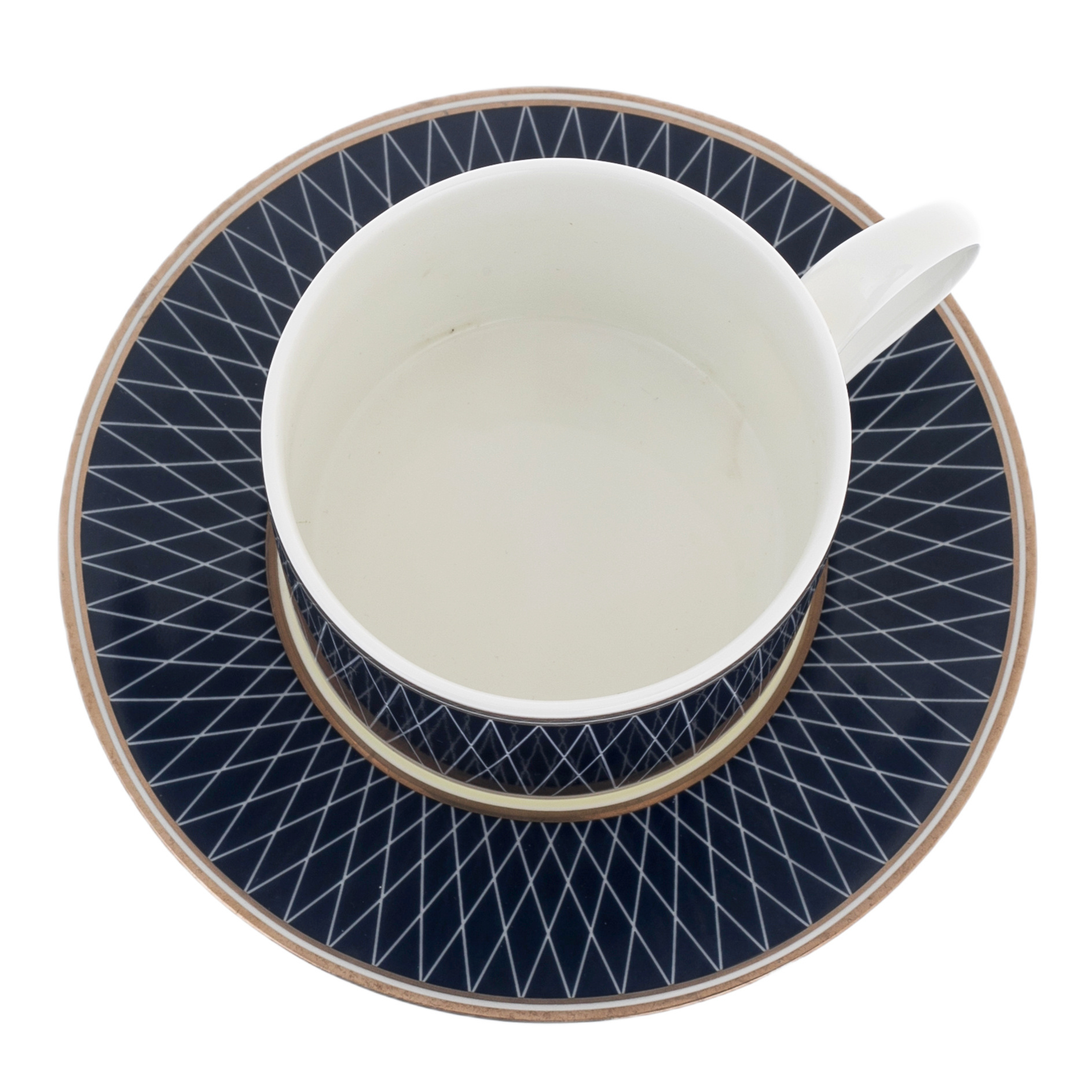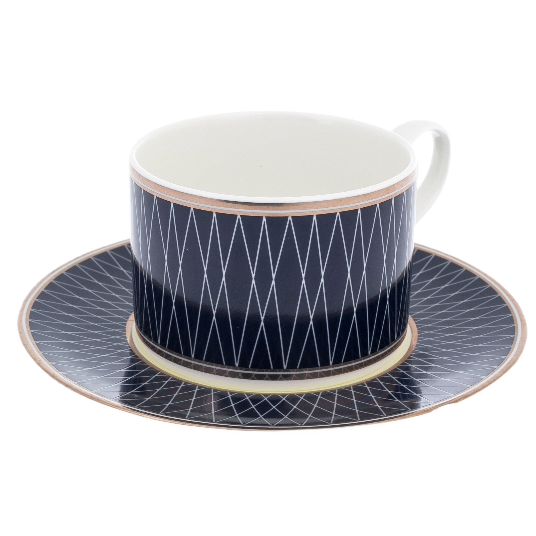Тонкие линии, пересекающиеся под точными углами, создают графический узор, напоминающий инженерный гений Шуховской башни. Как гиперболоидная конструкция, эта чайная пара воплощает в себе баланс легкости и прочности, грацию и математическую точность. Каждый штрих на темном фоне – не просто орнамент, а символ рациональной красоты, вдохновленной величием конструктивизма.
