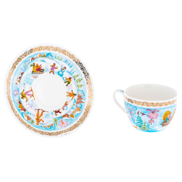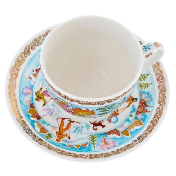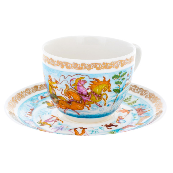Чашка и блюдце образуют гармоничный дуэт: лёгкие силуэты персонажей, искрящиеся золотые акценты и плавные декоративные бордюры формируют цельную композицию, где искусство Палеха проявляется во всём блеске. Глубина рисунка достигается тончайшими переходами цвета, создающими ощущение внутреннего сияния. Фарфор отличается изяществом формы, удобством в использовании и высокой прочностью, обеспечивающей долгую жизнь в коллекции ценителя.