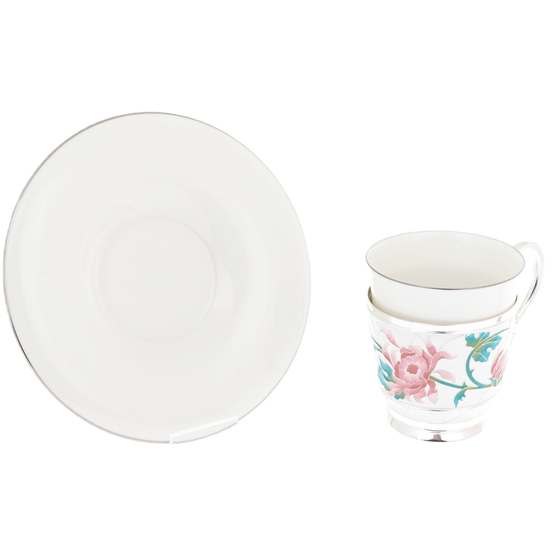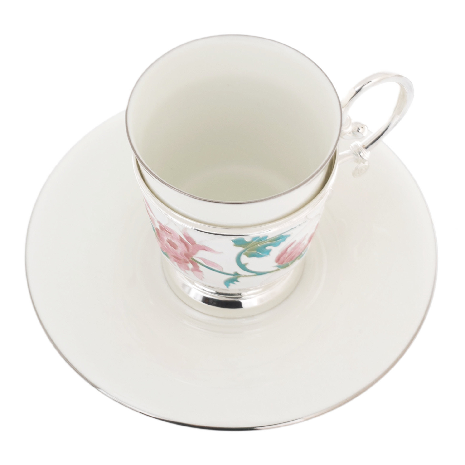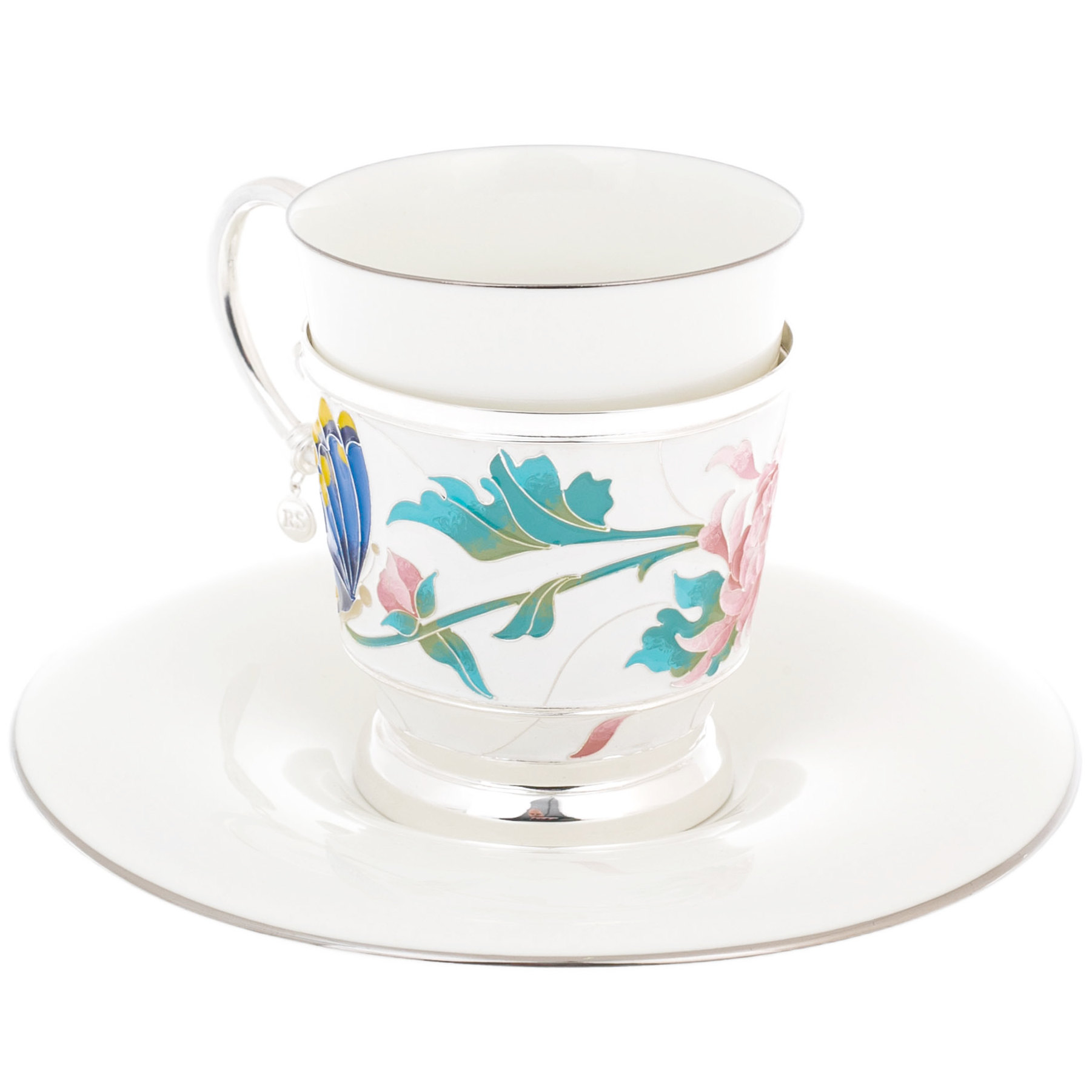 Чайная пара из фарфора в оправе из серебра притягивает взгляд белизной, излучающей свет и чистоту. На фоне снежного фарфора расцветают акварельные цветы, вписанные в тонкие серебряные контуры: яркая сине-жёлтая бутоньерка, розовые лепестки, зелёные листы — всё в этом декоре напоминает живописную миниатюру. Изогнутая ручка с миниатюрным медальоном придаёт силуэту изысканность, а зеркальный отблеск серебра придаёт завершённости каждой детали.