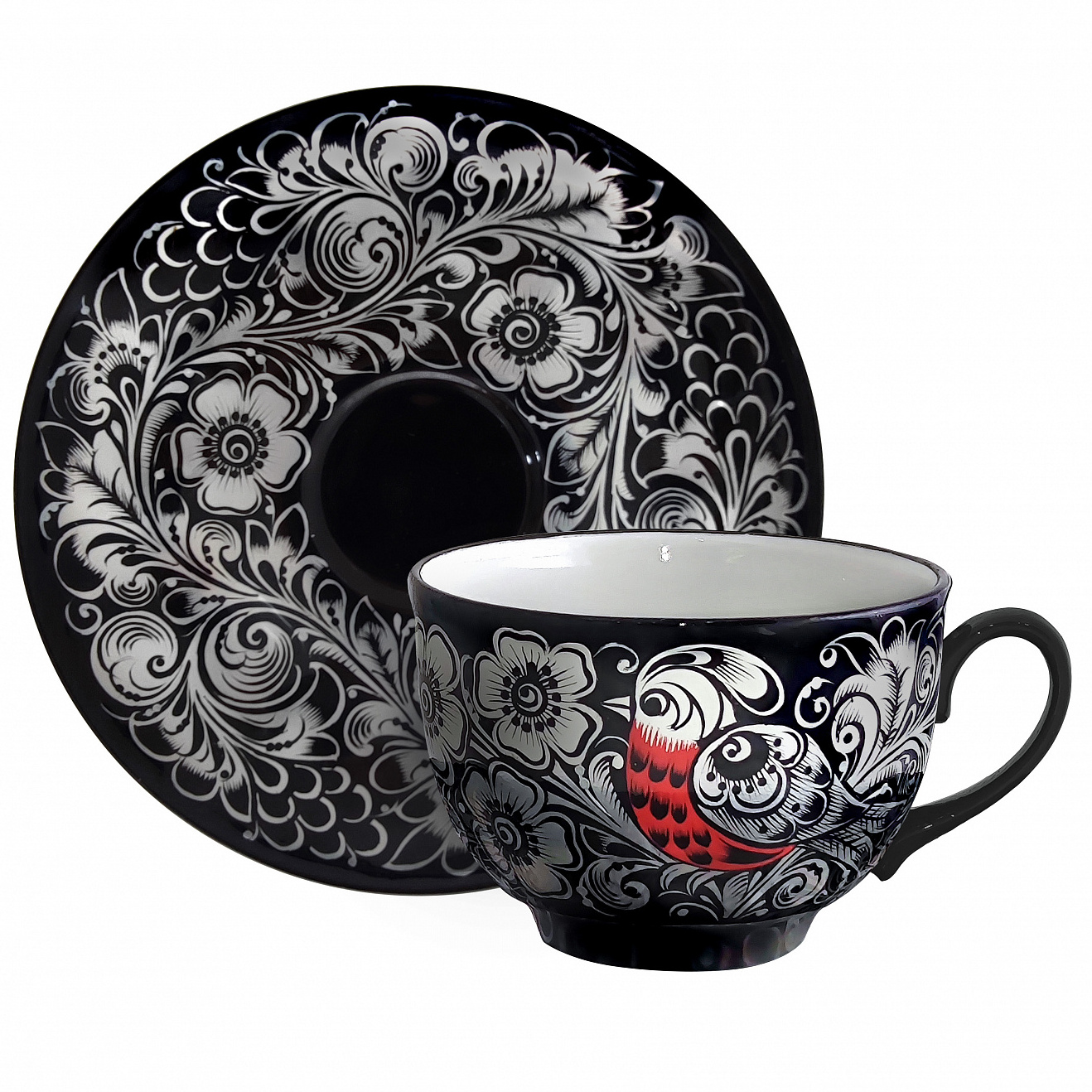 Комплект изготовлен в полном соответствии с традиционной хохломской технологией золочения, фарфоровая основа изготавливается на Дулевском фарфоровом заводе. Имеет авторскую роспись в технике фонового письма. Лаковое покрытие и многократный высокотемпературный обжиг делает изделие влагозащищенным и износоустойчивым. Все применяемые при производстве материалы натуральны и экологичны. Комплект предназначен для холодных и горячих напитков, а также служит элементом сервировки стола. На каждом изделии имеется подпись автора росписи. Упаковка из брендированного картона.