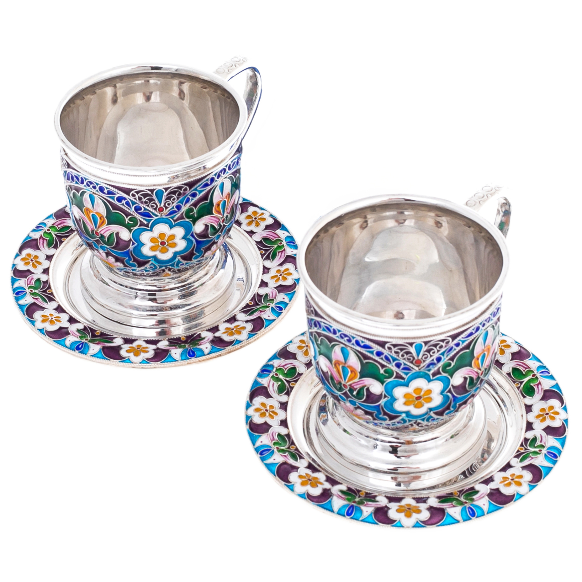 Чайный набор из серебра «Дружба» — воплощение гармонии, уюта и высокого вкуса, созданное для неспешных бесед и тёплых встреч. Комплект рассчитан на двух персон и состоит из двух серебряных чашек с ручками и двух идеально сочетающихся блюдец. Гладкие внутренние поверхности оттеняют пышный, насыщенный декор снаружи: каждый элемент покрыт яркой финифтью с цветочными мотивами в зелёной, синей, лазурной и пурпурной палитре. Центром композиции служат симметрично расположенные цветы, символизирующие союз и душевную близость.