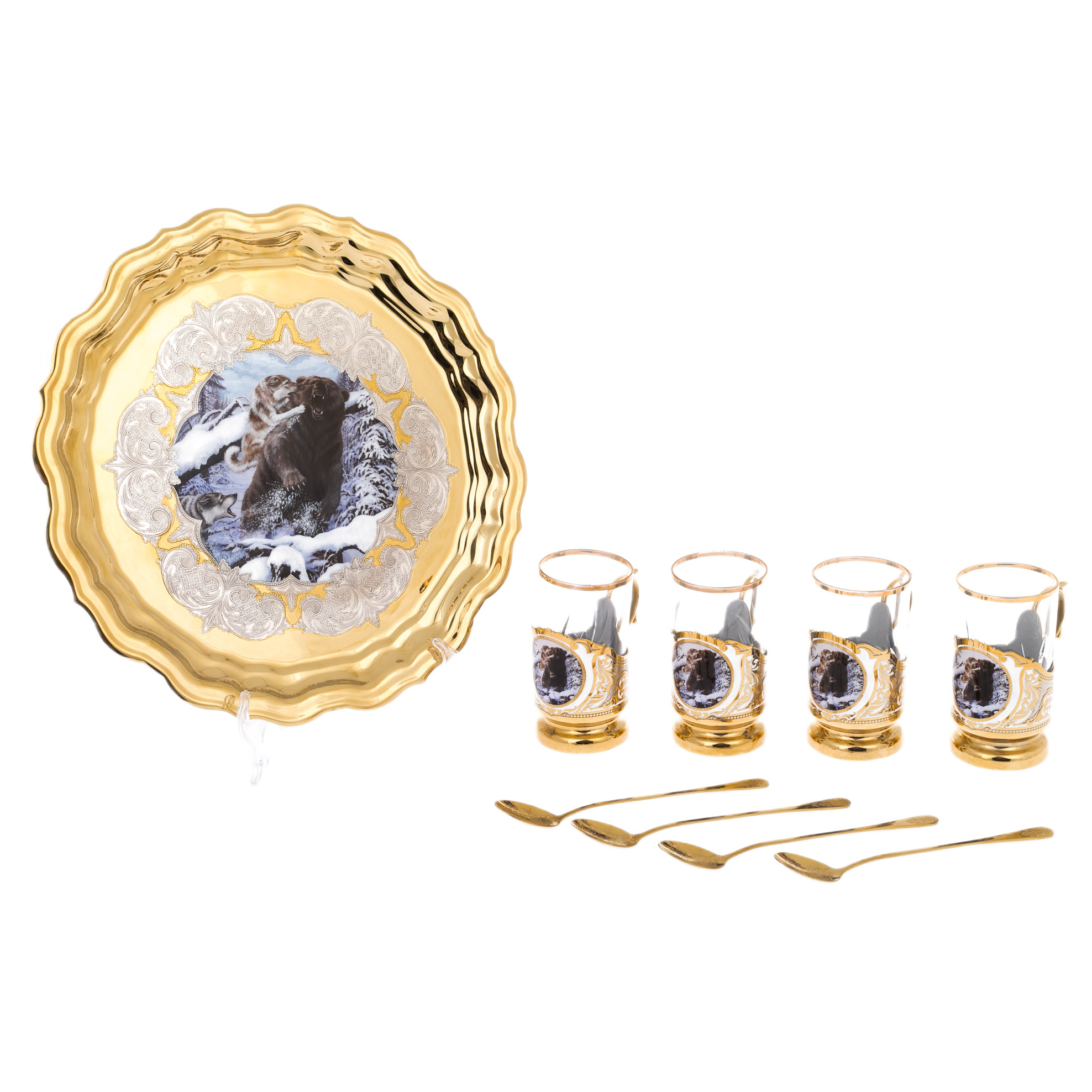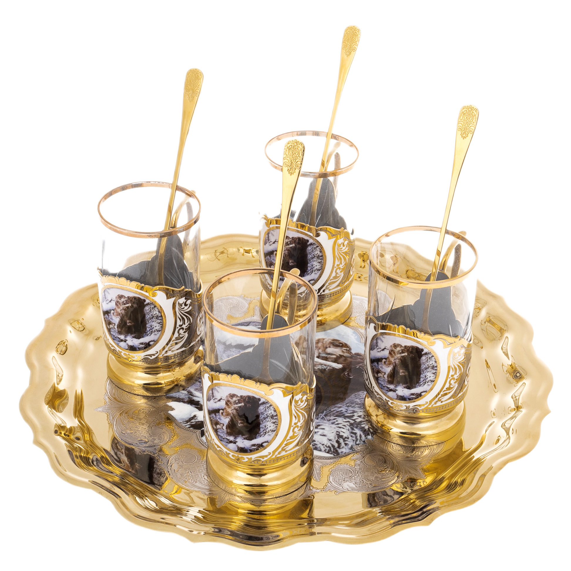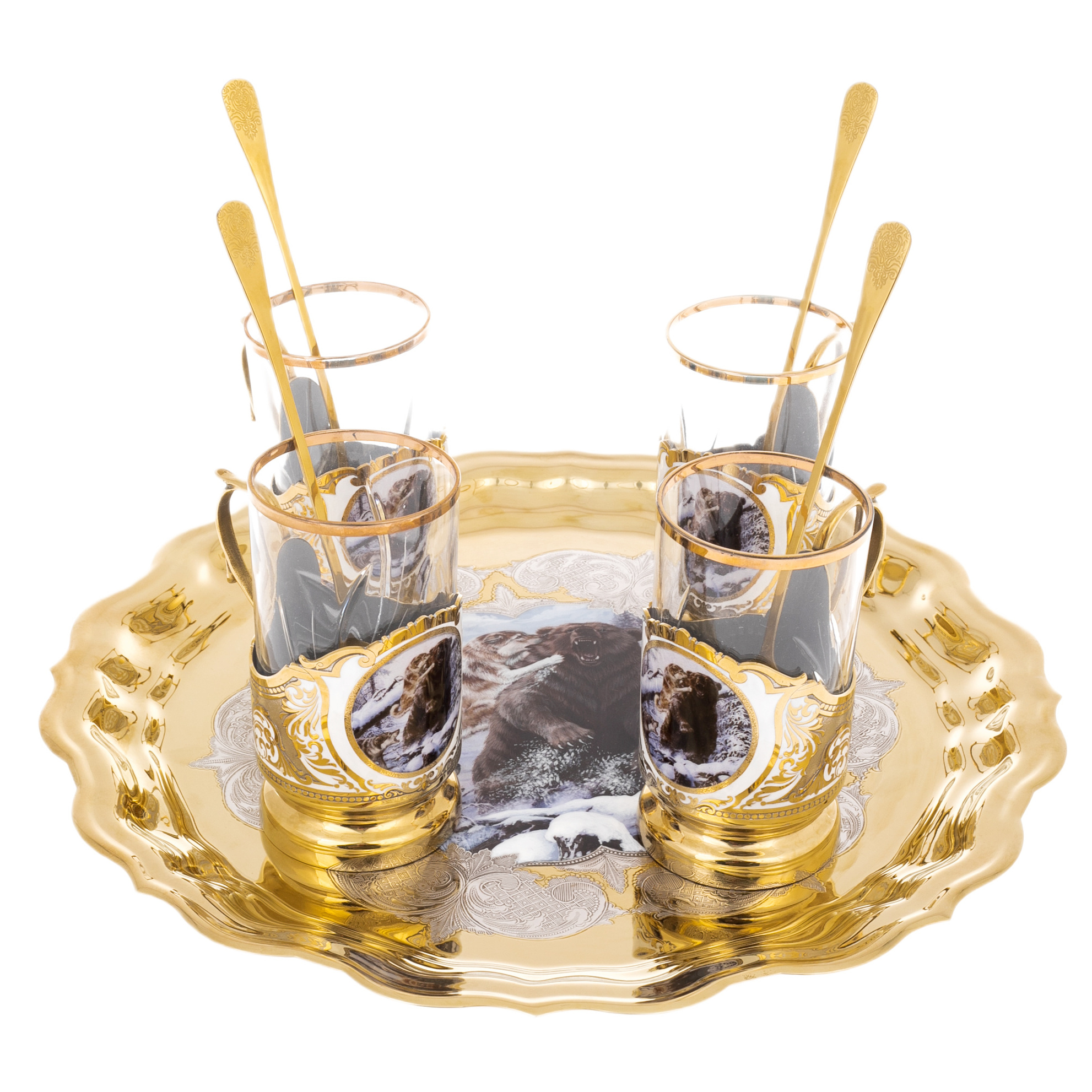 Комплектация: поднос, 4 подстаканника, 4 ложечки.